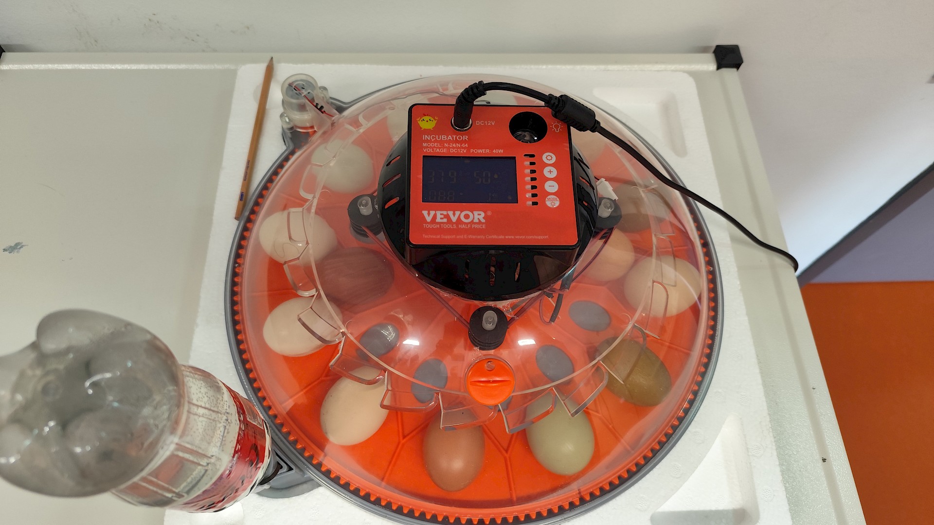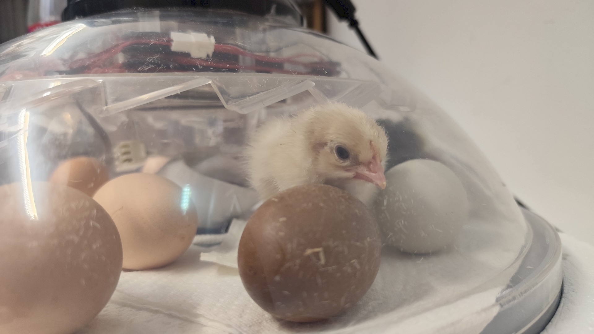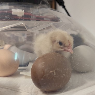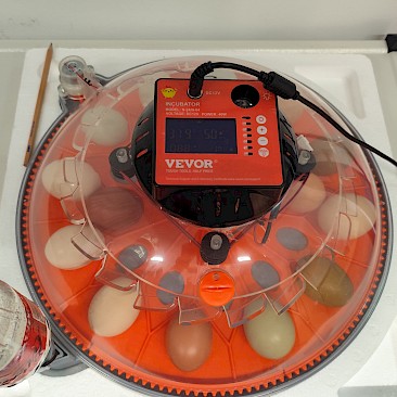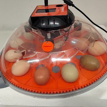 Am 4. März 2025 wurden 14 befruchtete Eier in unseren Brutautomaten gelegt. Die Luftfeuchtigkeit und die Temperatur werden automatisch geregelt, natürlich muss trotzdem ständig kontrolliert werden. Die Eier müssen 3-mal am Tag gewendet werden, was Gott sei Dank ebenso der Automat erledigte.