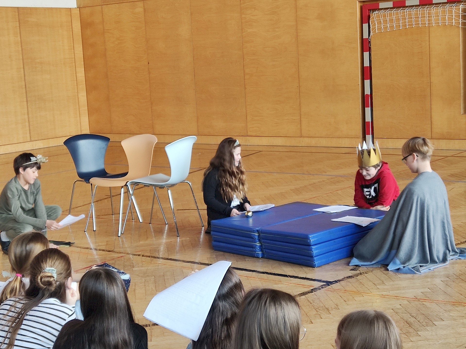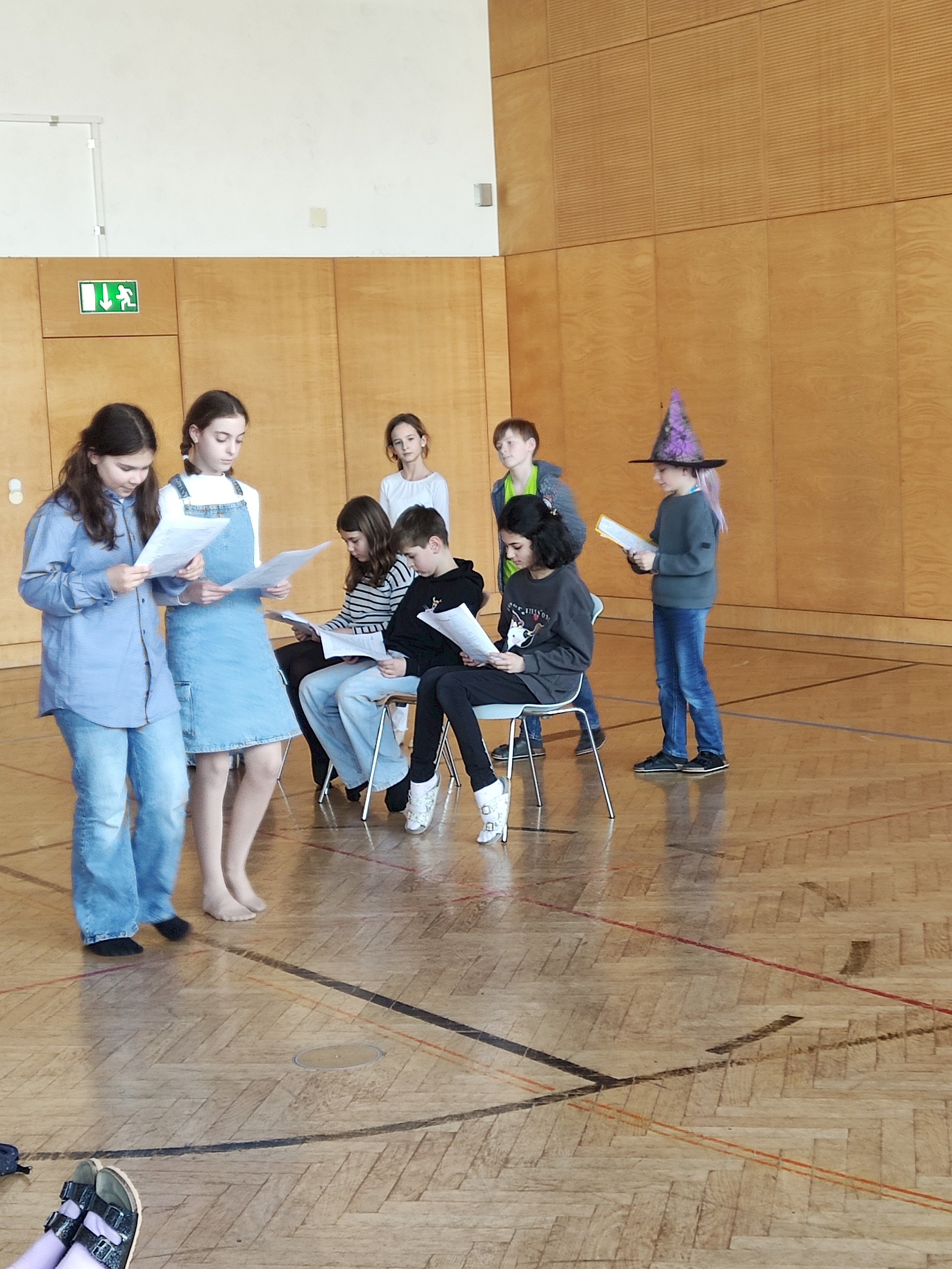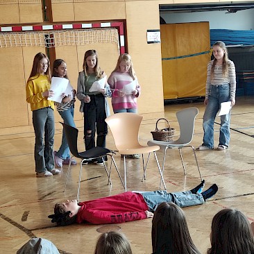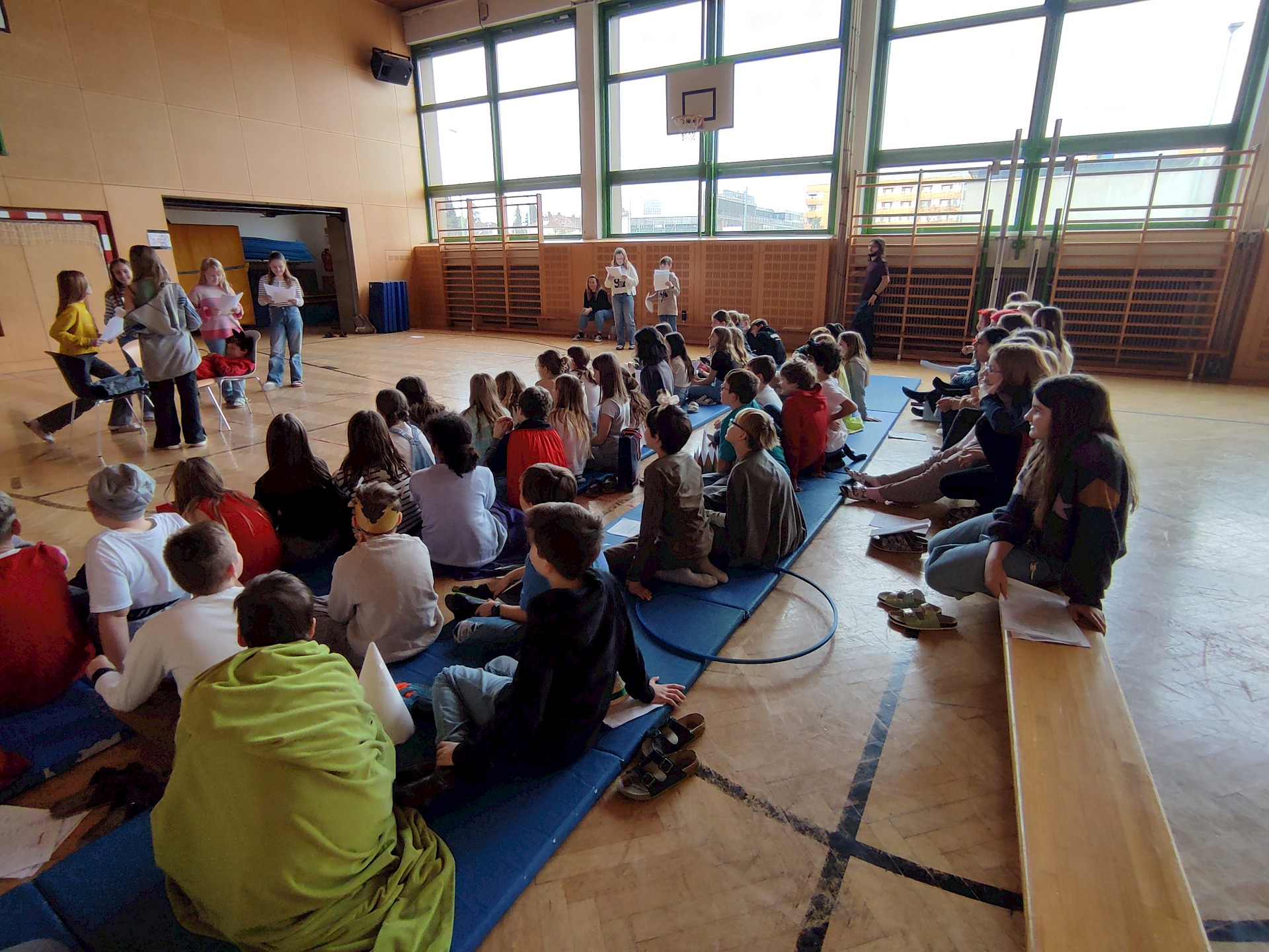 Am Vorlesetag selbst beteiligten sich aktiv drei Klassen (1A, 1B, 1D) mit ihren Deutschlehr*innen. Zwei Unterrichtsstunden lang trafen sich die Klassen im Turnsaal und spielten sich gegenseitig zuvor einstudierte „Lesetheater“ zum Thema „Märchen“ vor. Dabei inszenierten die Gruppen Märchen wie bei einem Theaterstück - der Text selbst musste allerdings nicht auswendig gelernt werden, sondern konnte vorgelesen werden. Mit viel Eifer und großem Engagement wurden die Stücke mit Kulissen und Kostümen aufgepeppt.