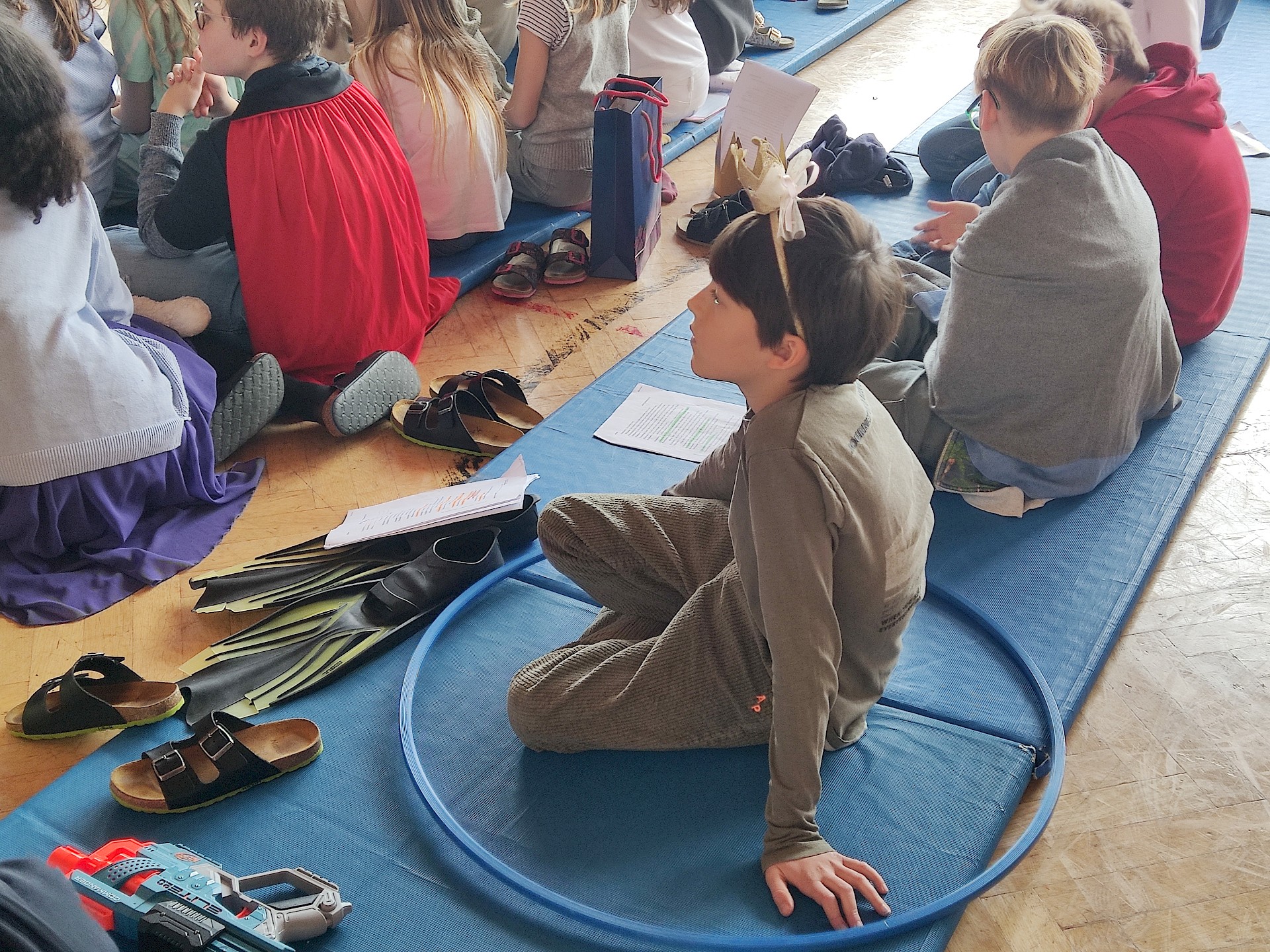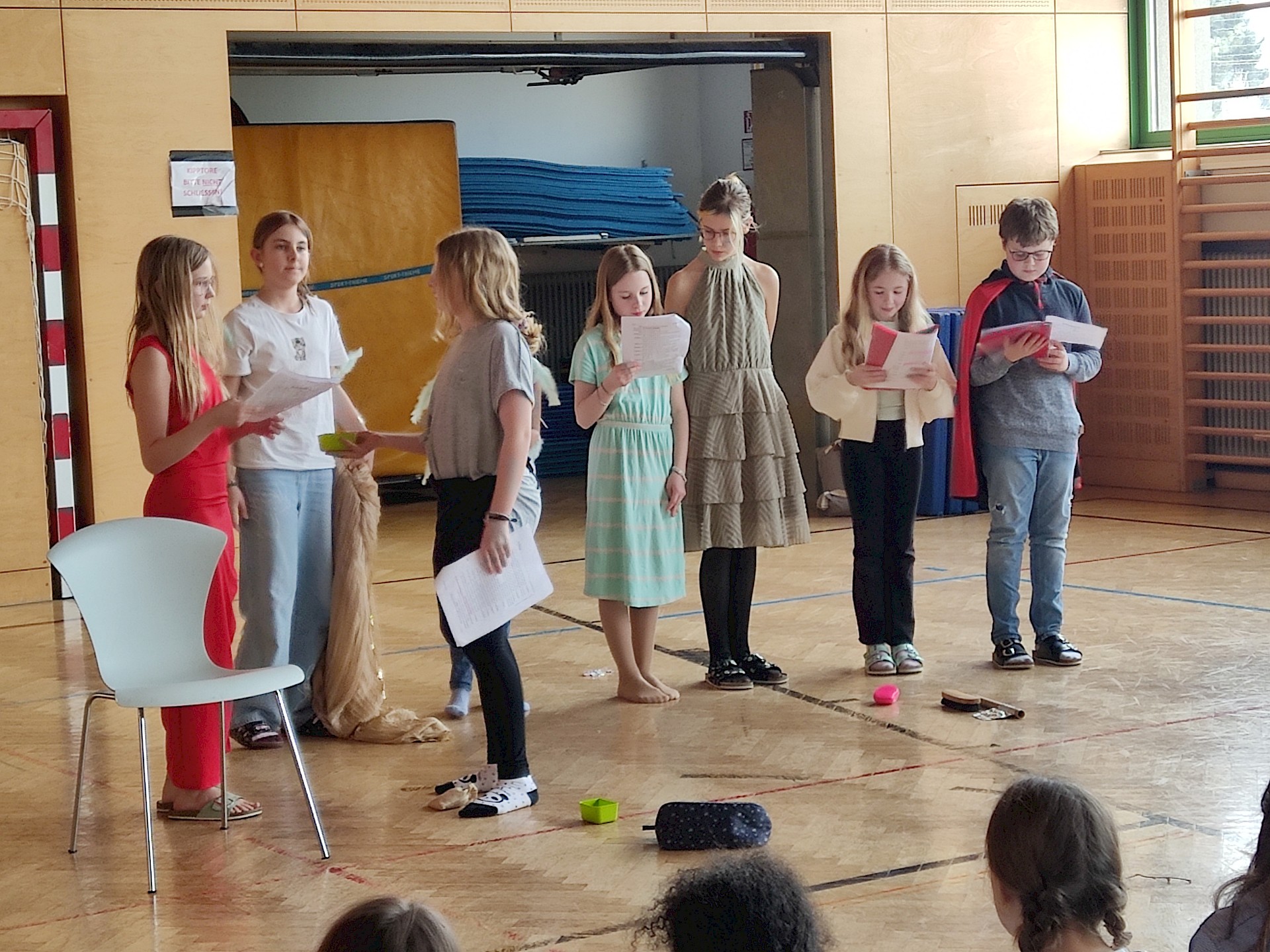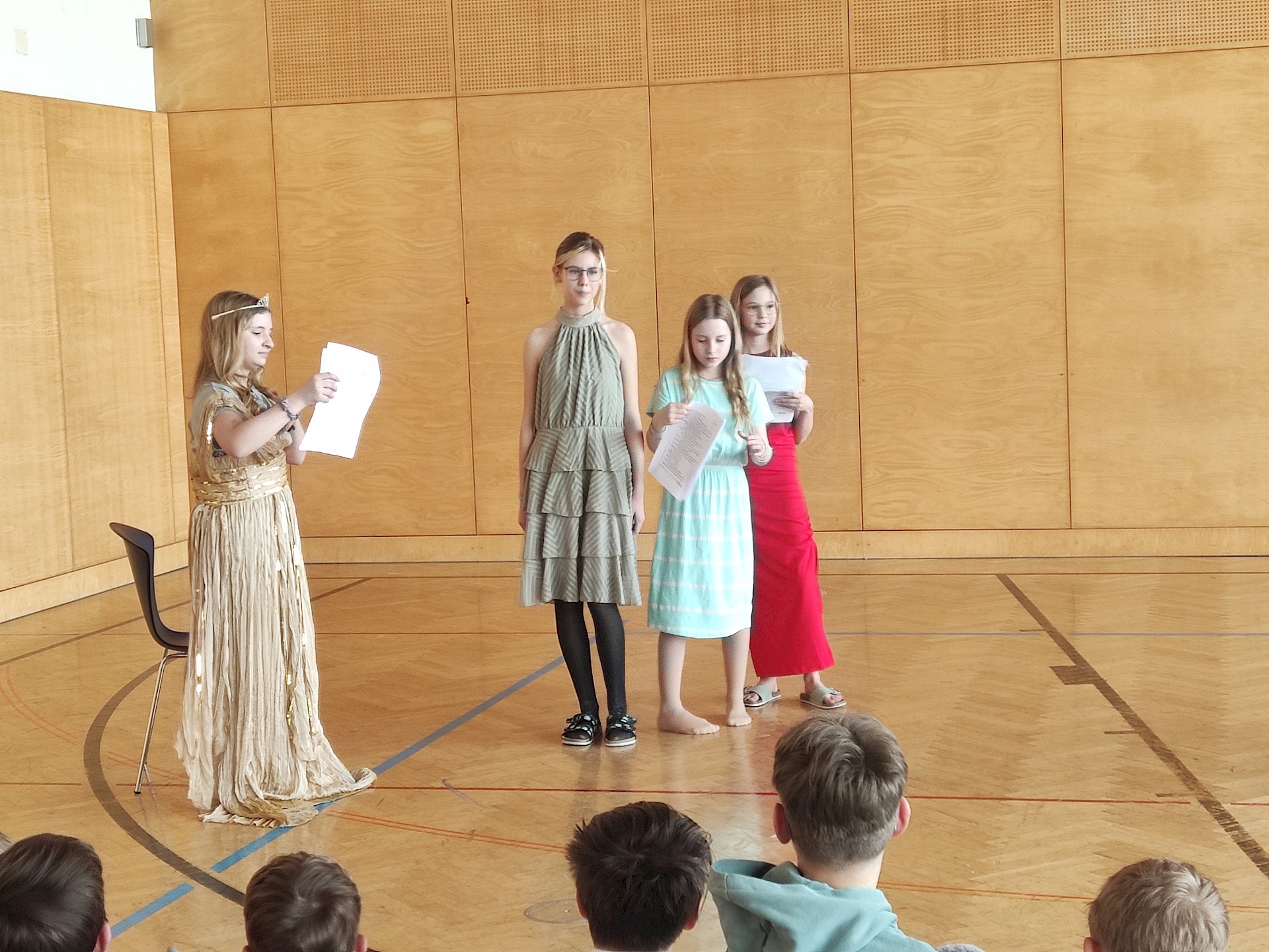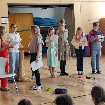 Am Vorlesetag selbst beteiligten sich aktiv drei Klassen (1A, 1B, 1D) mit ihren Deutschlehr*innen. Zwei Unterrichtsstunden lang trafen sich die Klassen im Turnsaal und spielten sich gegenseitig zuvor einstudierte „Lesetheater“ zum Thema „Märchen“ vor. Dabei inszenierten die Gruppen Märchen wie bei einem Theaterstück - der Text selbst musste allerdings nicht auswendig gelernt werden, sondern konnte vorgelesen werden. Mit viel Eifer und großem Engagement wurden die Stücke mit Kulissen und Kostümen aufgepeppt.