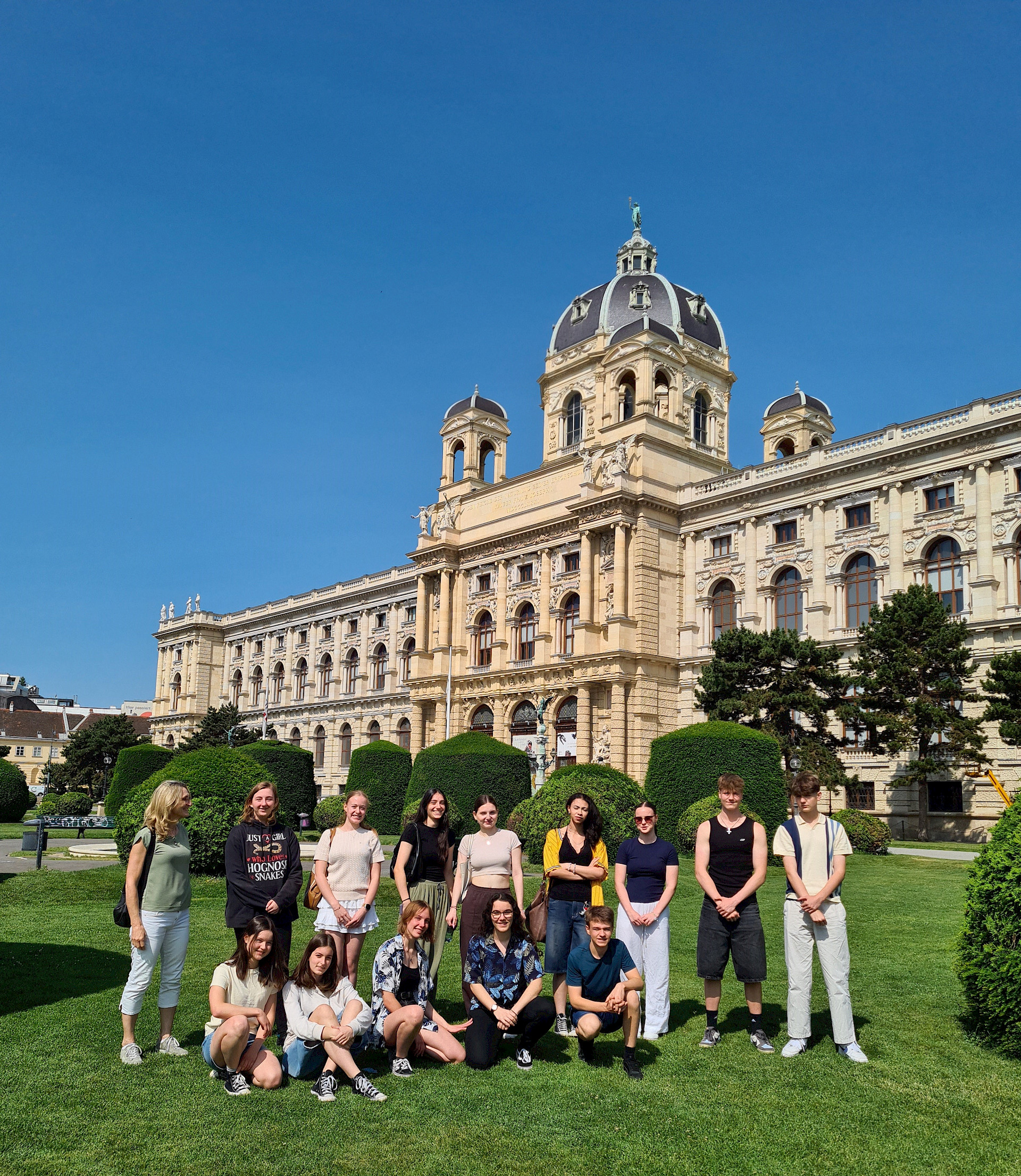 Die Schüler*innen betrachteten dabei im Rahmen einer Führung die Kunstwerke von Caravaggio, Rubens, Tizian und Raffael, sowie deren Komposition, Malweise und Lichtführung. Außerdem erfuhren sie mehr über die Entstehungsgeschichte der jeweiligen Bilder. Danach flanierten wir bei strahlendem Wetter an berühmten Ringstraßenbauten wie dem Parlament, Rathaus und Burgtheater vorbei zur Universität und übten uns an der Zuordnung von Baustilen.