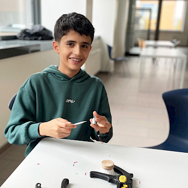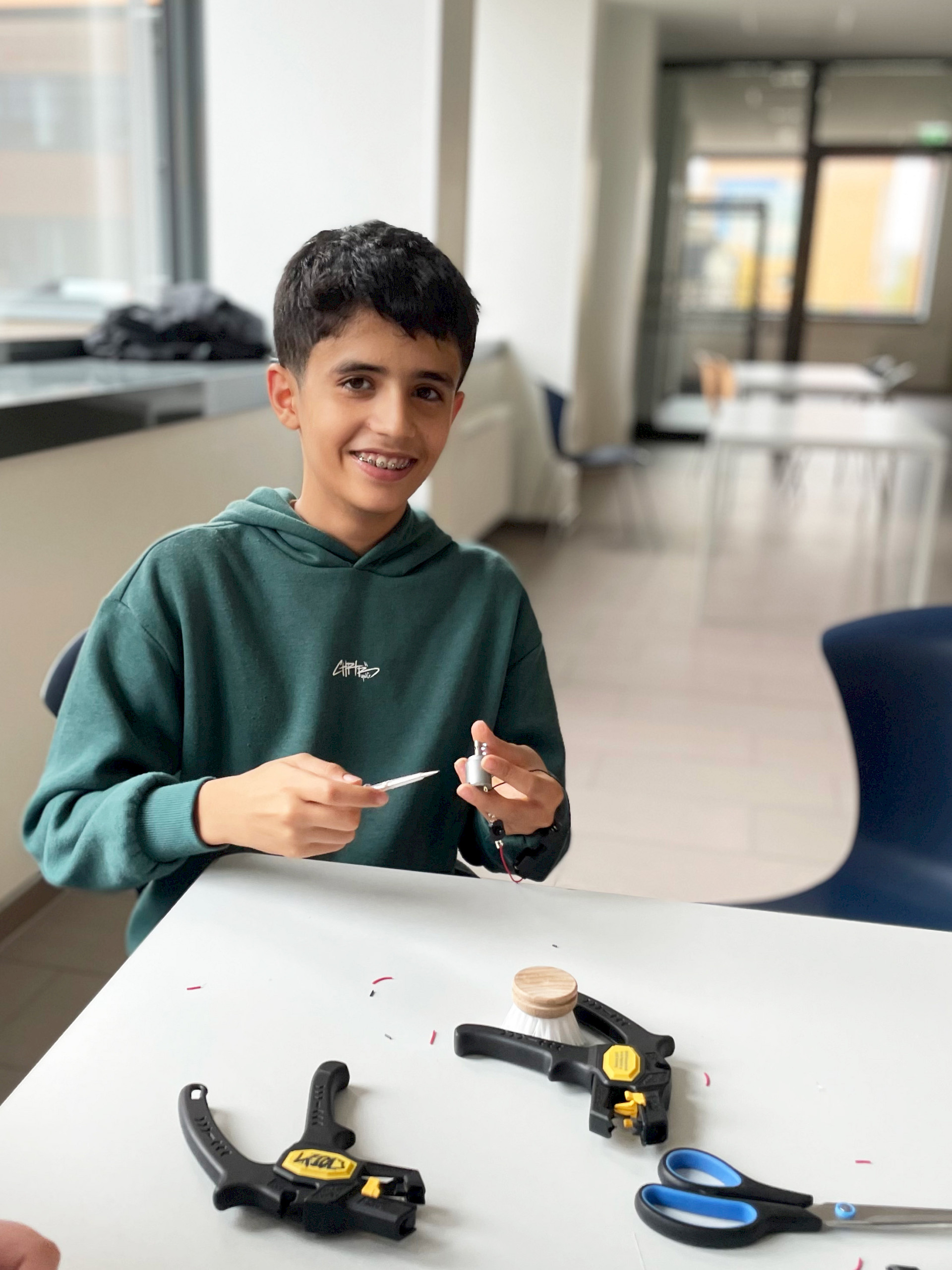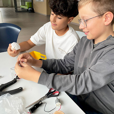 Die einfachen Materialien wie Bürstenköpfe und Bastelmaterial wurden mit kleinen Motoren und Batterien bestückt und erhielten eine Verkabelung zu einem Einschaltknopf. Es entstanden bewegliche Mini-Roboter, die durch Vibration in Gang gesetzt werden. Nach einer kurzen Einführung zum Ziel des Projekts experimentierten die Kinder frei mit den Materialien, erprobten verschiedene Lösungswege und fanden gemeinsam heraus, wie sie ihre Bürste sinnvoll „zum Laufen“ bringen konnten. Anschließend gestalteten sie ihre Roboter kreativ und individuell weiter.