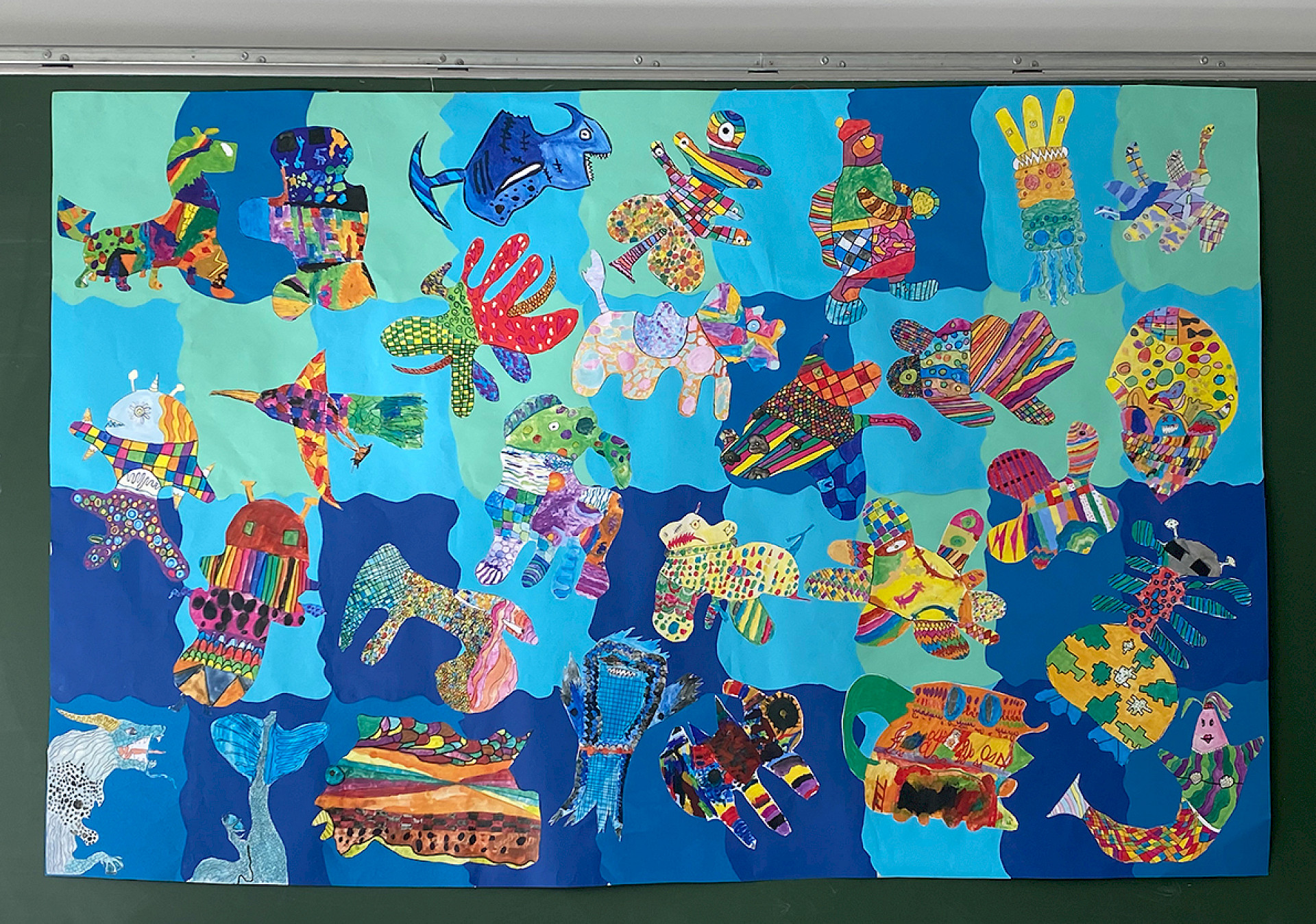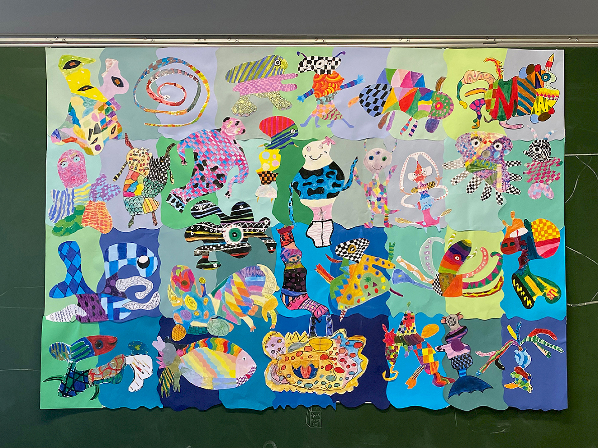 Nach dem Betrachten des Bildes und experimentellen Methoden wie dem Zufallsverfahren Cadavre Exquis entstanden fantasievolle Meereswesen. Mit viel Freude gestalteten die Schüler*innen ihre Gemeinschaftscollage – natürlich auf blauem Grund!