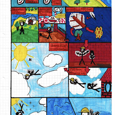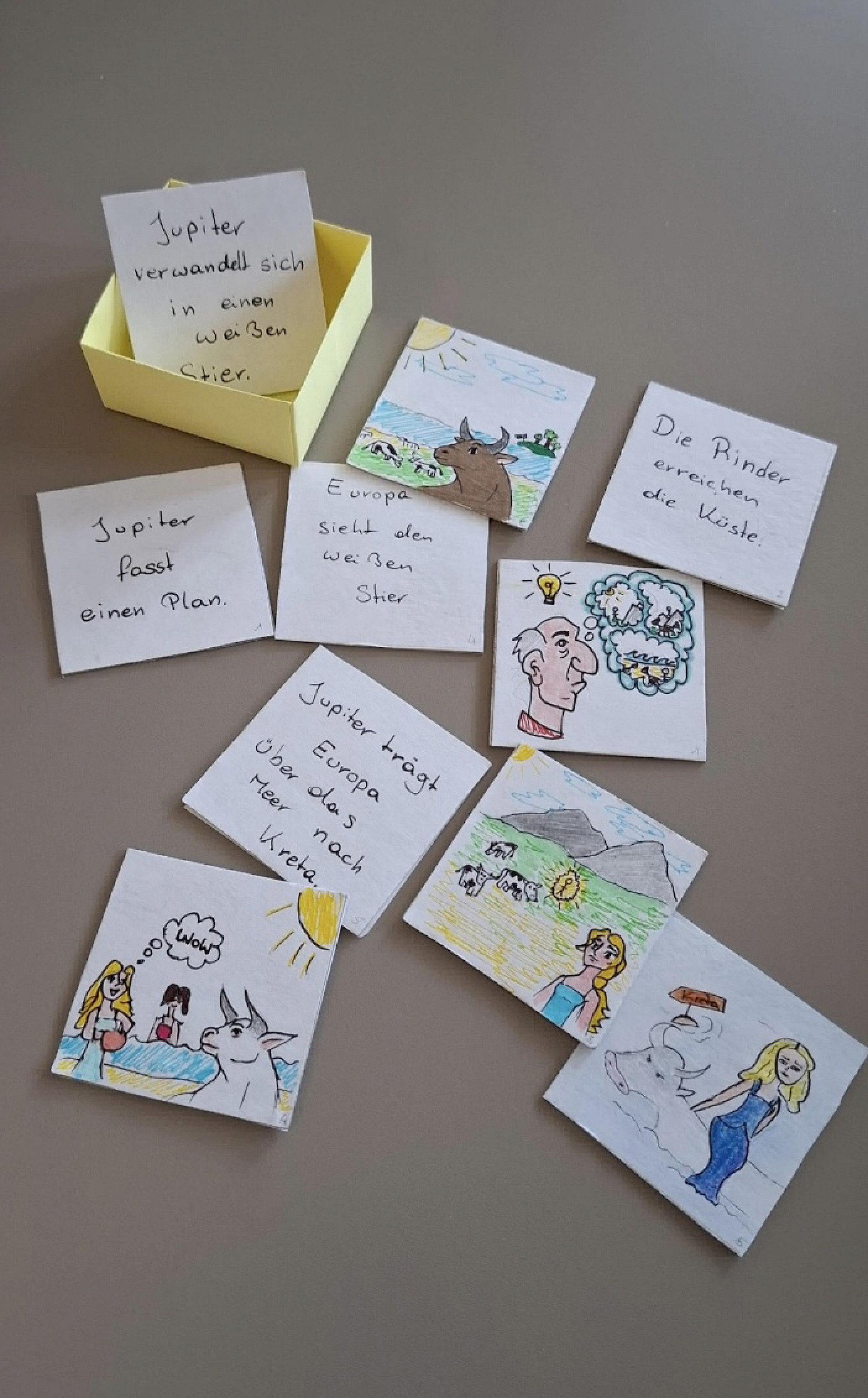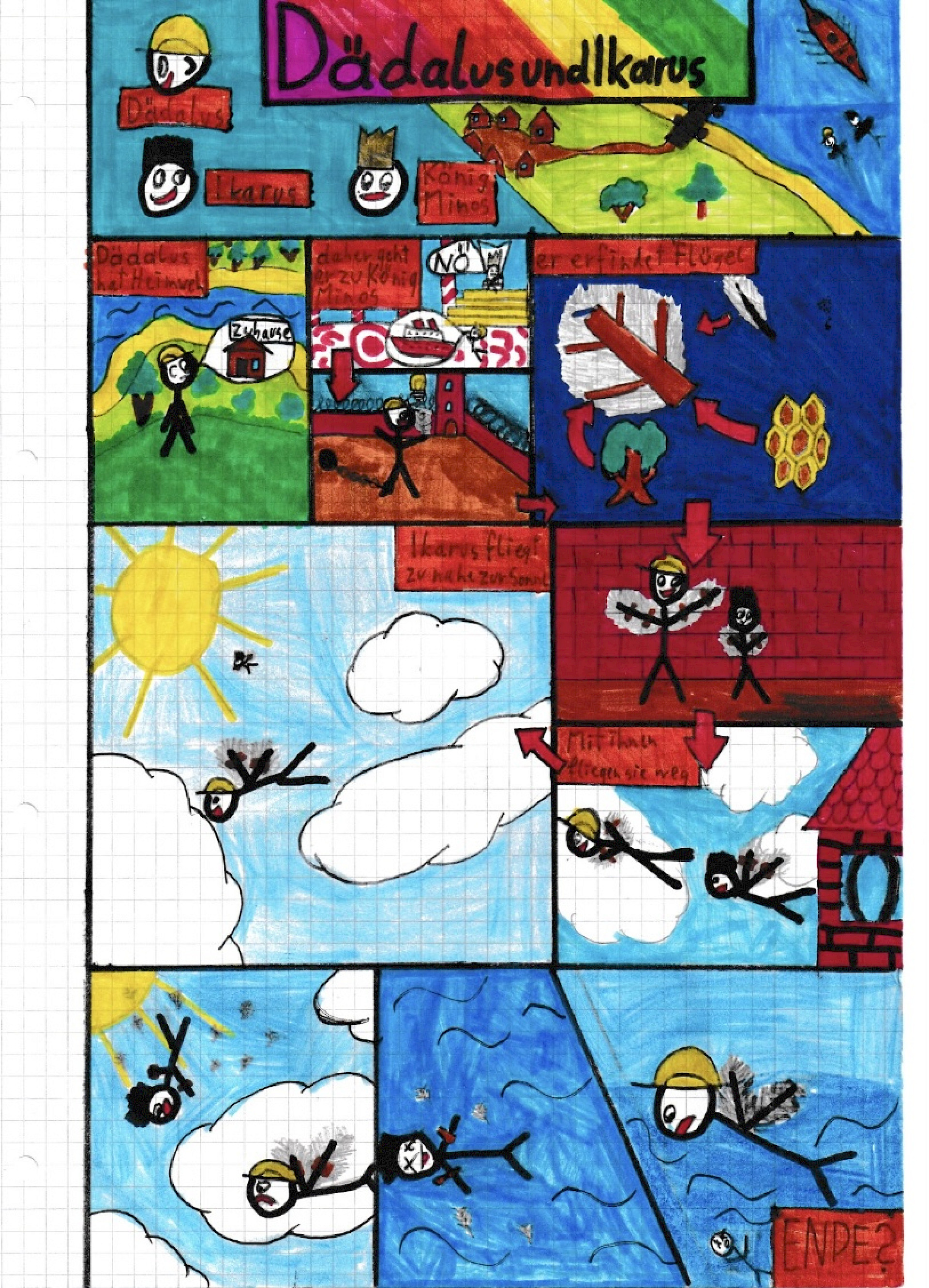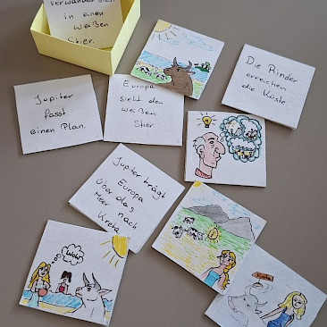 Dabei konnten die Schüler*innen der 5B5NA in diversen Kreativarbeiten, die sie selbständig erstellt haben, zeigen, welches Wissen sie sich zu den Mythen rund um den Minotaurus, Ikarus und Dädalus und Europa erarbeitet hatten. Der Mythos von Dädalus und Ikarus wurde dabei auf dreirlei Weise verarbeitet: Einmal zu einem Comic und einmal zu einem Gedicht. Außerdem wurde ein Video zur entscheidenden Sterbeszene des Ikarus gedreht. Der Geschichte von Europa und Jupiter widmeten sich zwei Teams: Hier wurde neben einer wortspielerischen Collage auch ein Memory-Spiel erstellt, welches die Szenen des Mythos in Wort und Bild zusammenpaaren lässt. Für den Minotaurus zauberte eine größere Schülergruppe ein Video aus dem Hut: Hier wurde der Mythos von Theseus, der den Minotaurus mithilfe der Ariadne töten und aus dem Labyrinth fliehen kann, in einer Minecraftlandschaft nachgespielt und passend vertont. Auch die Lateingruppe 5NA hat sich in diversen Kreativarbeiten durch Collagen, Gedichte, Stopmotionfilme und Memory-Spiele mit den Inhalten der bereits erwähnten Mythen künstlerisch-kreativ auseinandergesetzt. Für all diese Projekte sind außerhalb der Schulstunde natürlich zusätzliche Arbeitsstunden zu Hause eingeflossen.