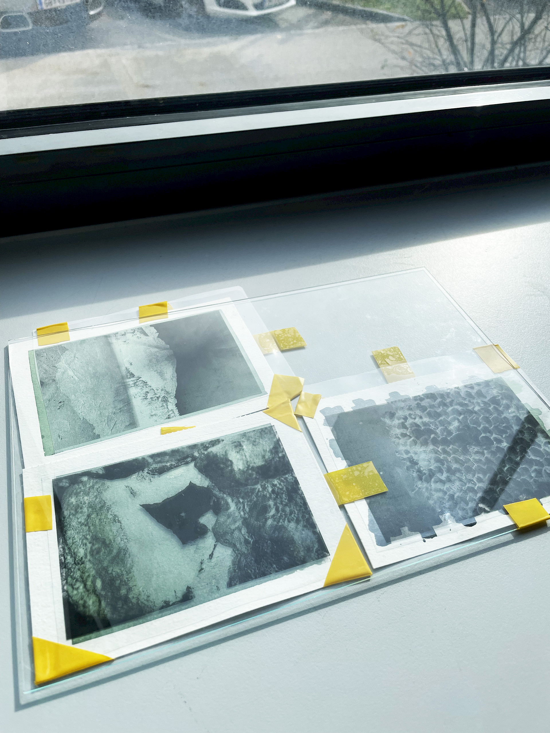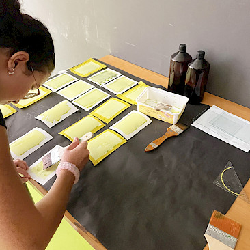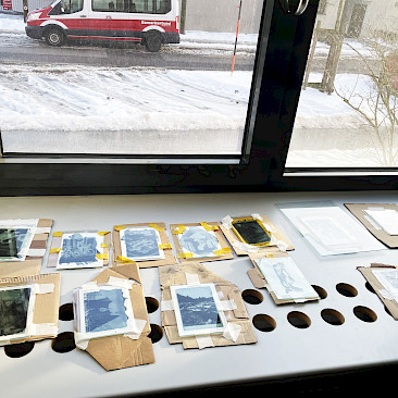 Für die praktische Umsetzung stellten die Schüler*innen zunächst ihr eigenes lichtempfindliches Papier her. Dazu wurde eine Lösung aus Ammoniumeisen(III)-citrat und Kaliumferricyanid auf Aquarellpapier aufgetragen und getrocknet. Die beschichteten Papiere wurden anschließend mit Negativen eigener Fotografien oder mit Gegenständen im Sonnenlicht belichtet. Durch das anschließende Auswaschen der überschüssigen Chemikalien entstanden die für die Cyanotypie typischen blauen Bilder im Postkartenformat.