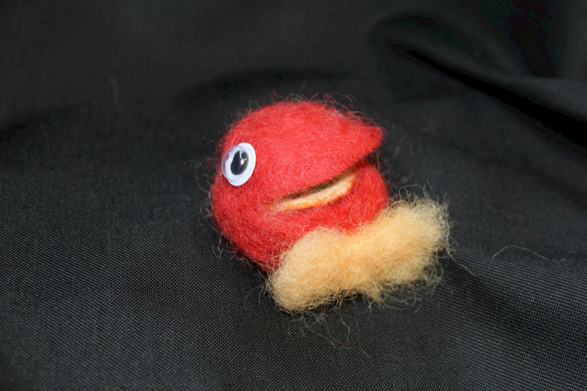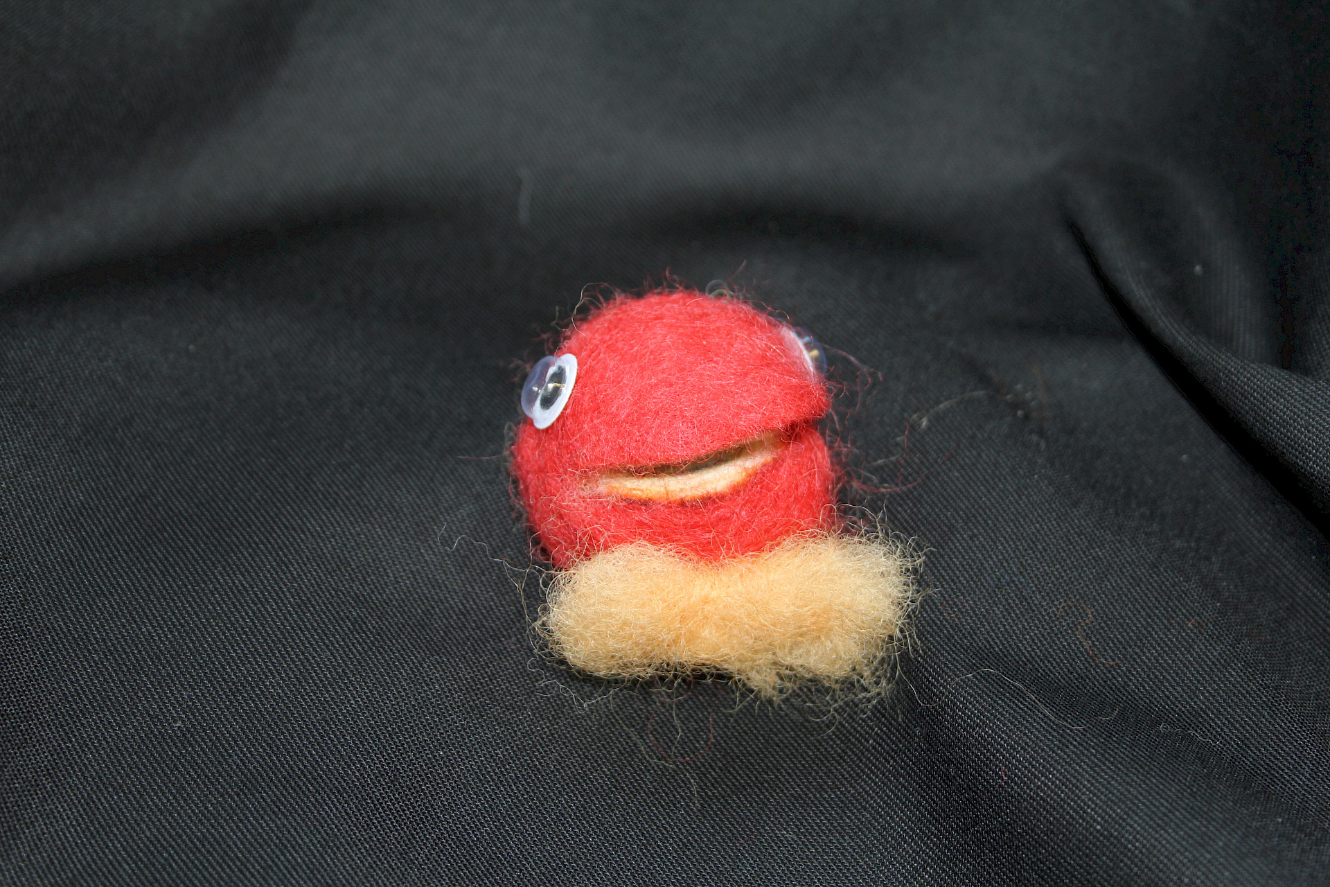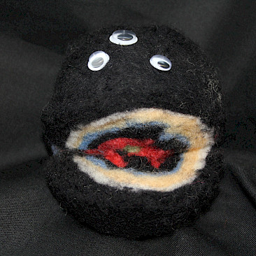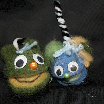 Durch die Nassfilztechnik wurden Filzkugeln in verschiedenen Farben schichtweise gefilzt und dann getrocknet. Danach konnte man die Filzkugeln auseinanderschneiden und weiter dekorieren zu kleinen Filzmonstern.