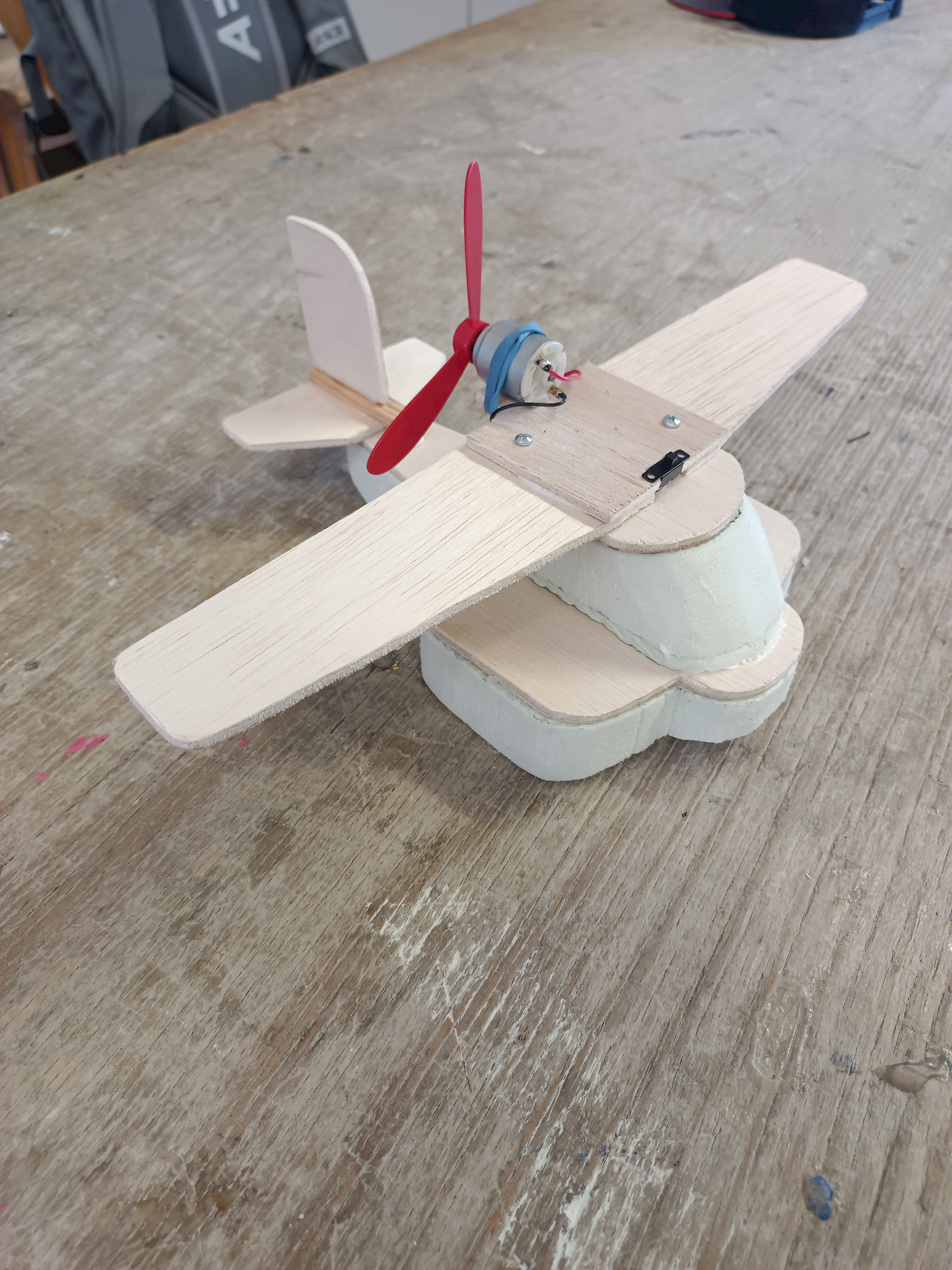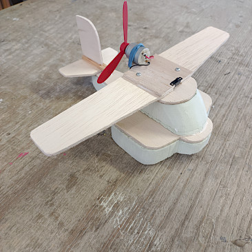 Auch ein Wasserflugzeug wurde von einem Schüler der 4B-Klasse gebaut. Dieses Flugzeug ist ein detailreiches Modell eines Propellerfliegers, der über das Wasser gleiten kann.