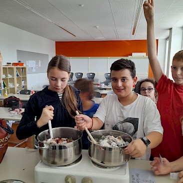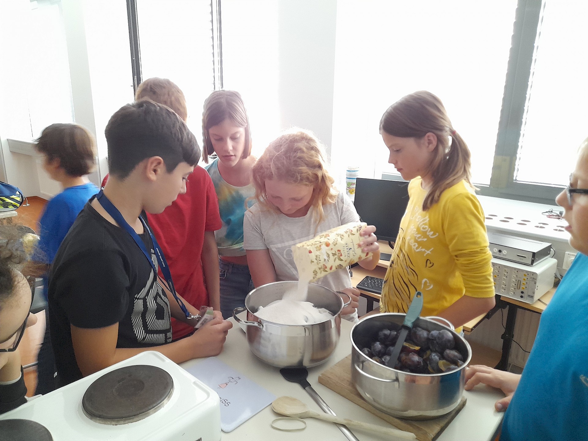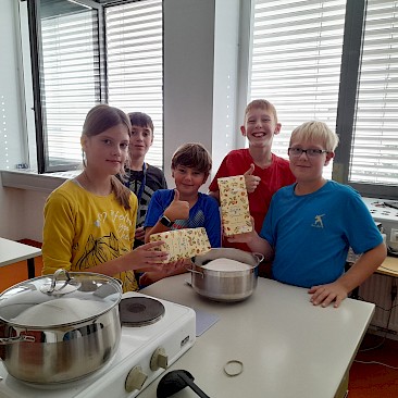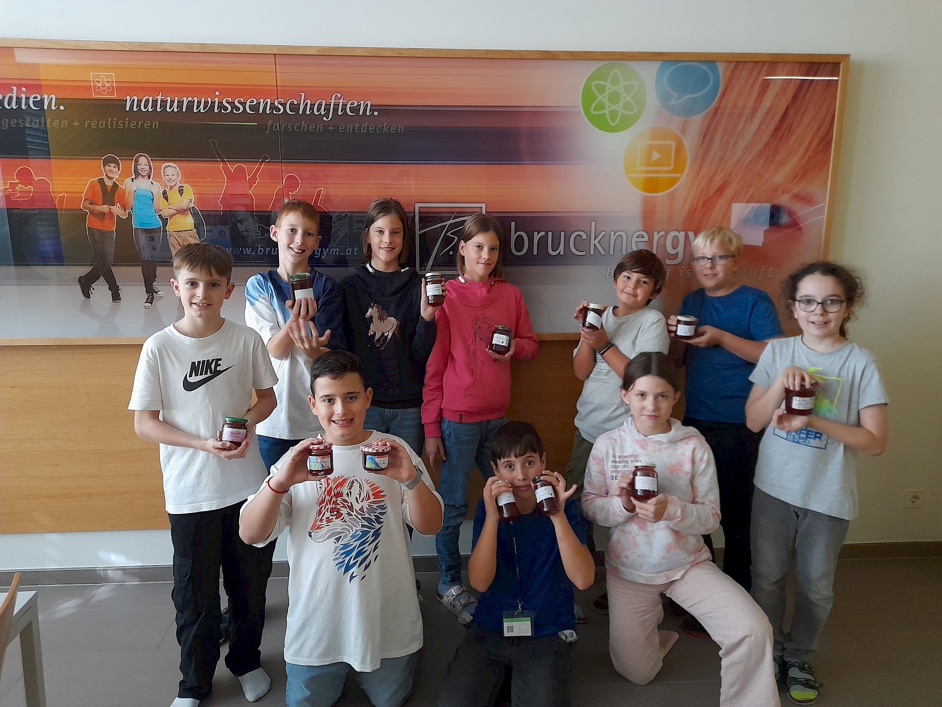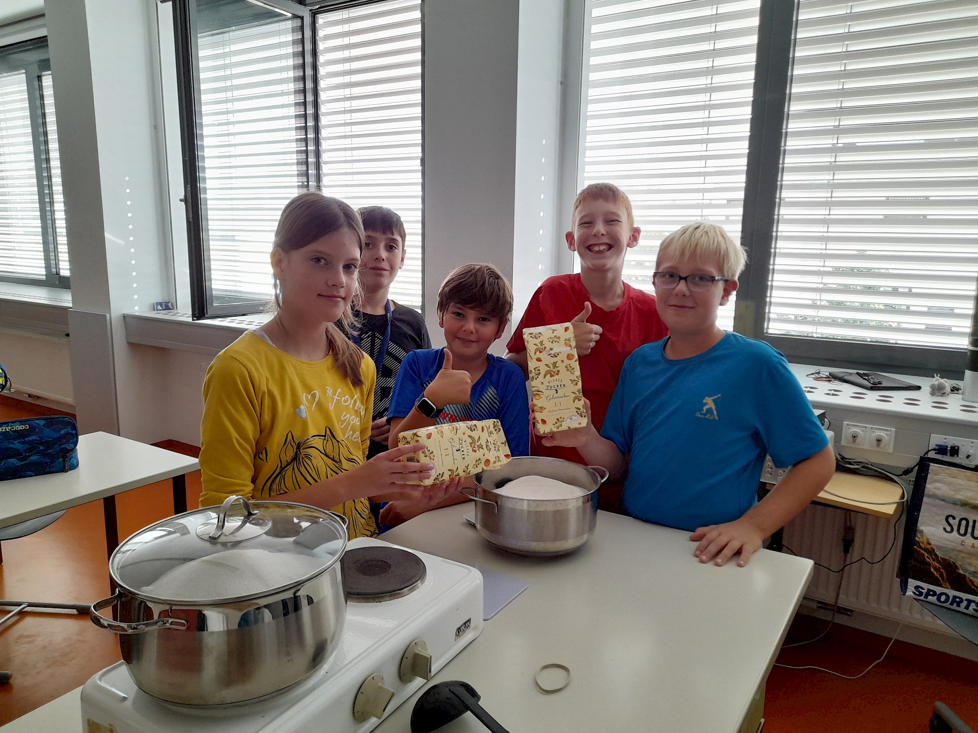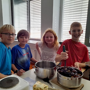 Nach dem Waschen, Entkernen und Abwiegen der Zutaten haben die Kinder die Früchte mit dem Pürierstab fein passiert. Bevor die Marmelade in Gläser gefüllt wurde, wurden noch kreative Etiketten für die selbstgemachten Marmeladen gestaltet, die sich die Schüler*innen mit nachhause nehmen durften. Beim gemeinsamen Zubereiten, Kochen und Zusammenräumen wurde nicht nur viel gekleckert, sondern auch viel gelacht.