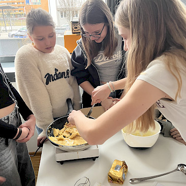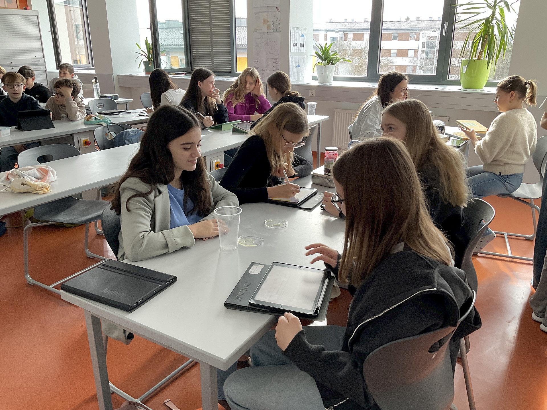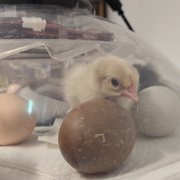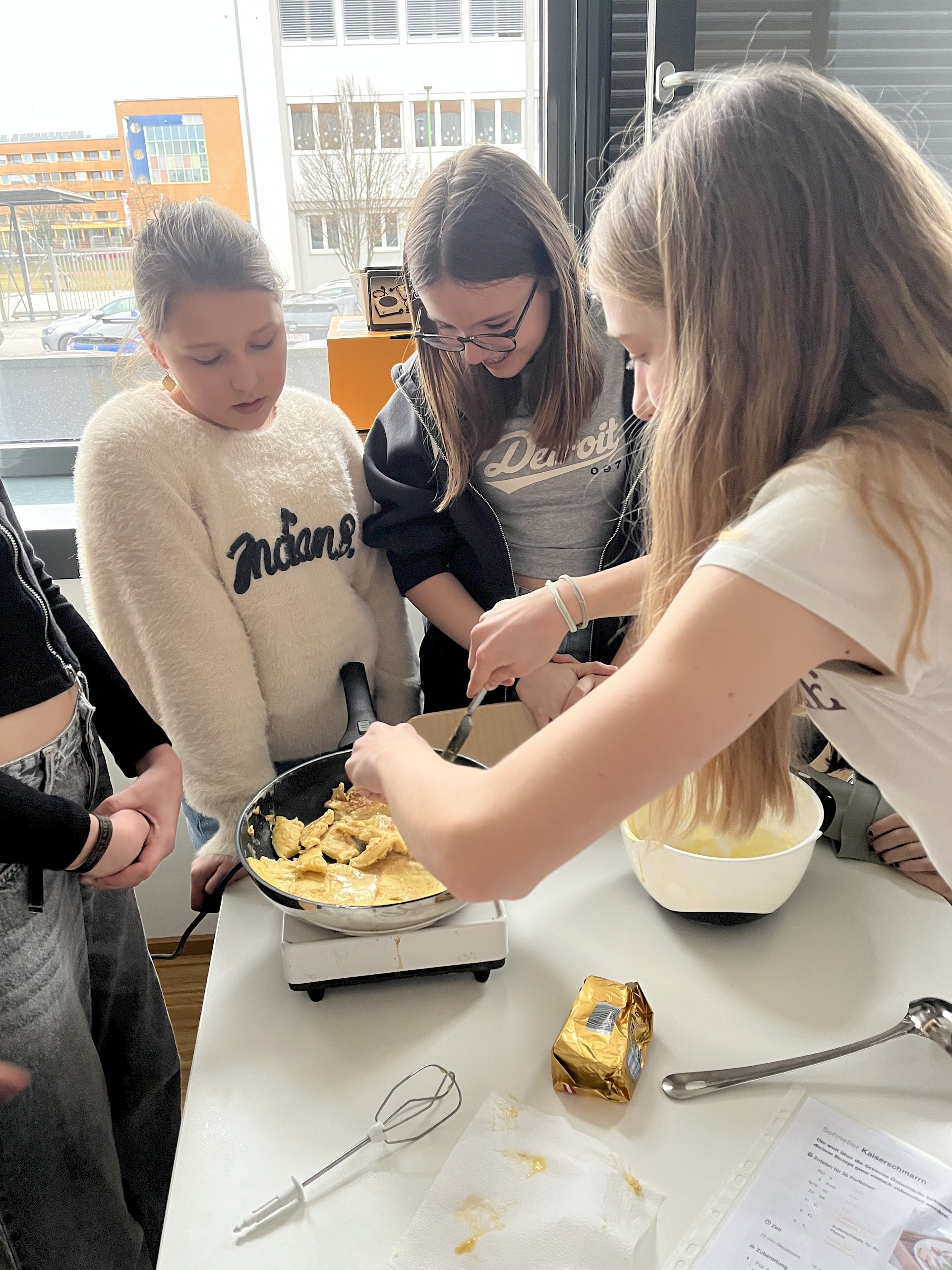 Ebenso wurden (befruchtete) Hühnereier im Aufbau untersucht. Kritische Inhalte zu Legehennenhaltung, Hahn und Eierproduktion, sowie die Eikennzeichnungen waren weitere Themenschwerpunkte. Eine kritische Auseinandersetzung mit gesunder Ernährung und die Herstellung von selbstgemachten gesünderen „Chicken Nuggets“ rundeten diesen Schwerpunkt in Biologie ab. -