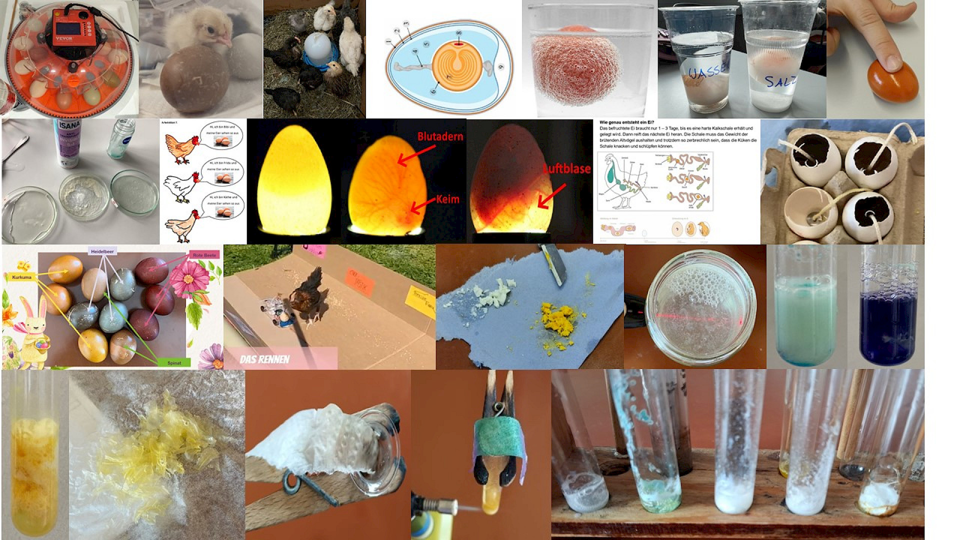 Weiters wurden „Green Chemistry Farbstoffe“ verwendet, um Eier zu färben. Der Unterschied zwischen Gäressig und Essig aus Ethylen wurde thematisiert und dann Eierschalen mit Essig aufgelöst, das dabei entstehende Gas untersucht und Osmoseversuche mit den schalenfreien Eiern gemacht. Ebenso wurden Eiklar und Dotter einer kleinen nasschemischen Analyse unterzogen um die Elemente C, H, O, N, und S im Eiklar nachzuweisen, um die Bedingungen des Coagulierens von Eiklar zu Eiweiß zu eruieren und auch um dem größeren Fettgehalt im Dotter auf die Spur zu kommen. Eine selbstgemachte Eischalenkerze wurde als „nachhaltige Verwendungsmöglichkeit“ der dabei anfallenden Eierschalen entwickelt.