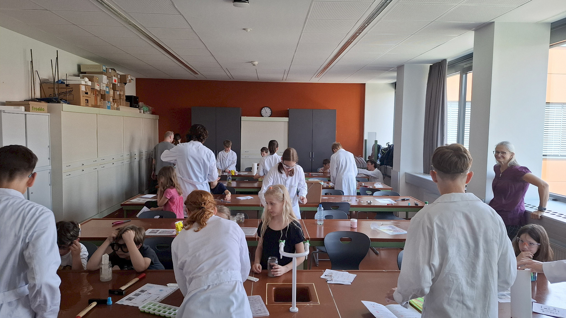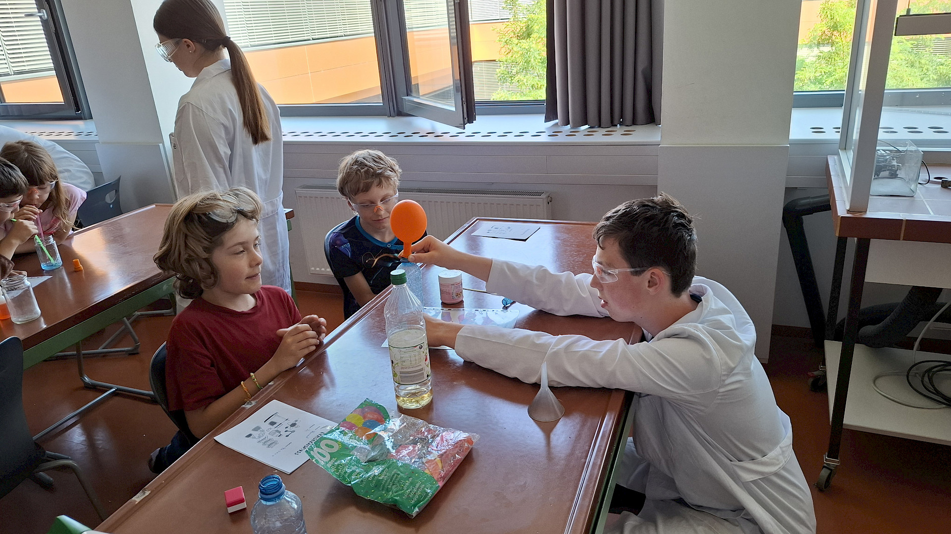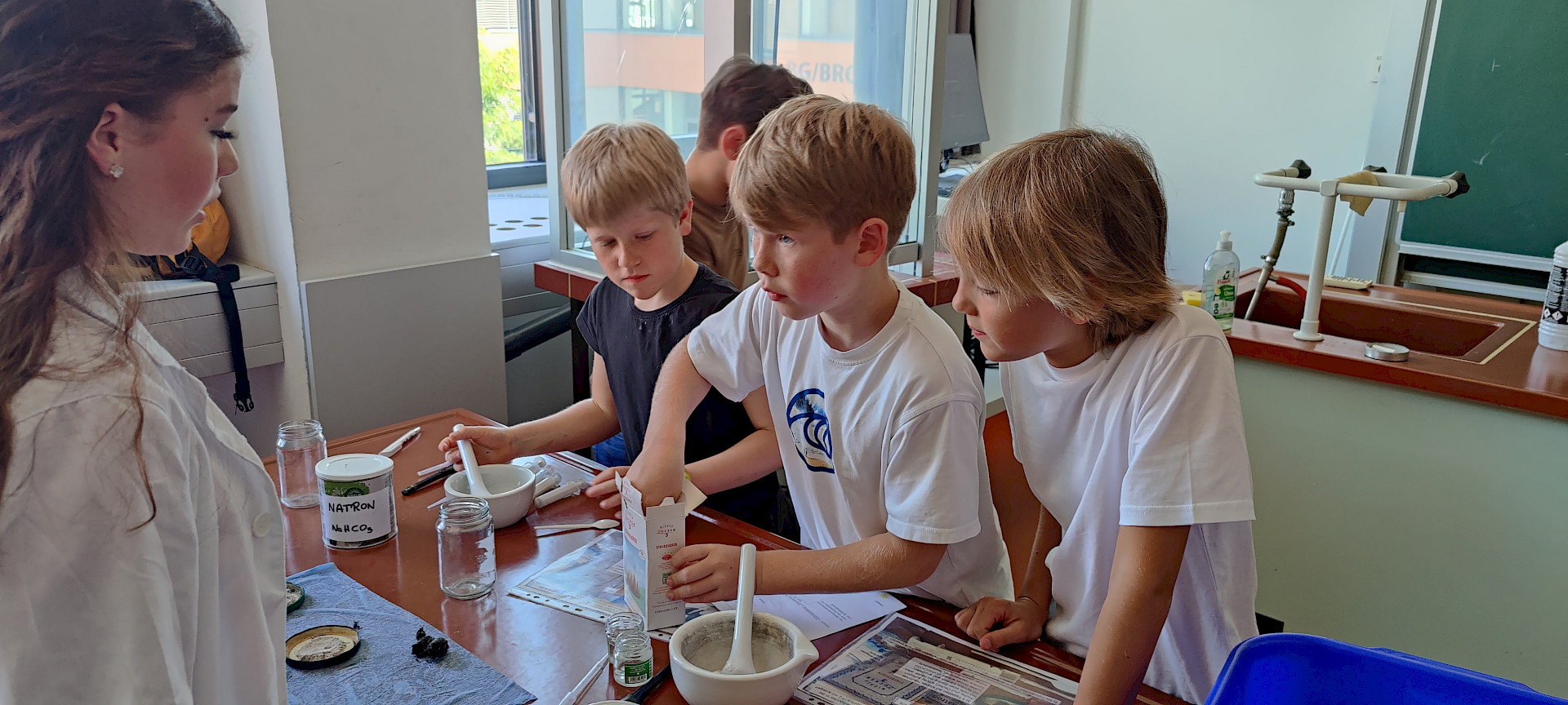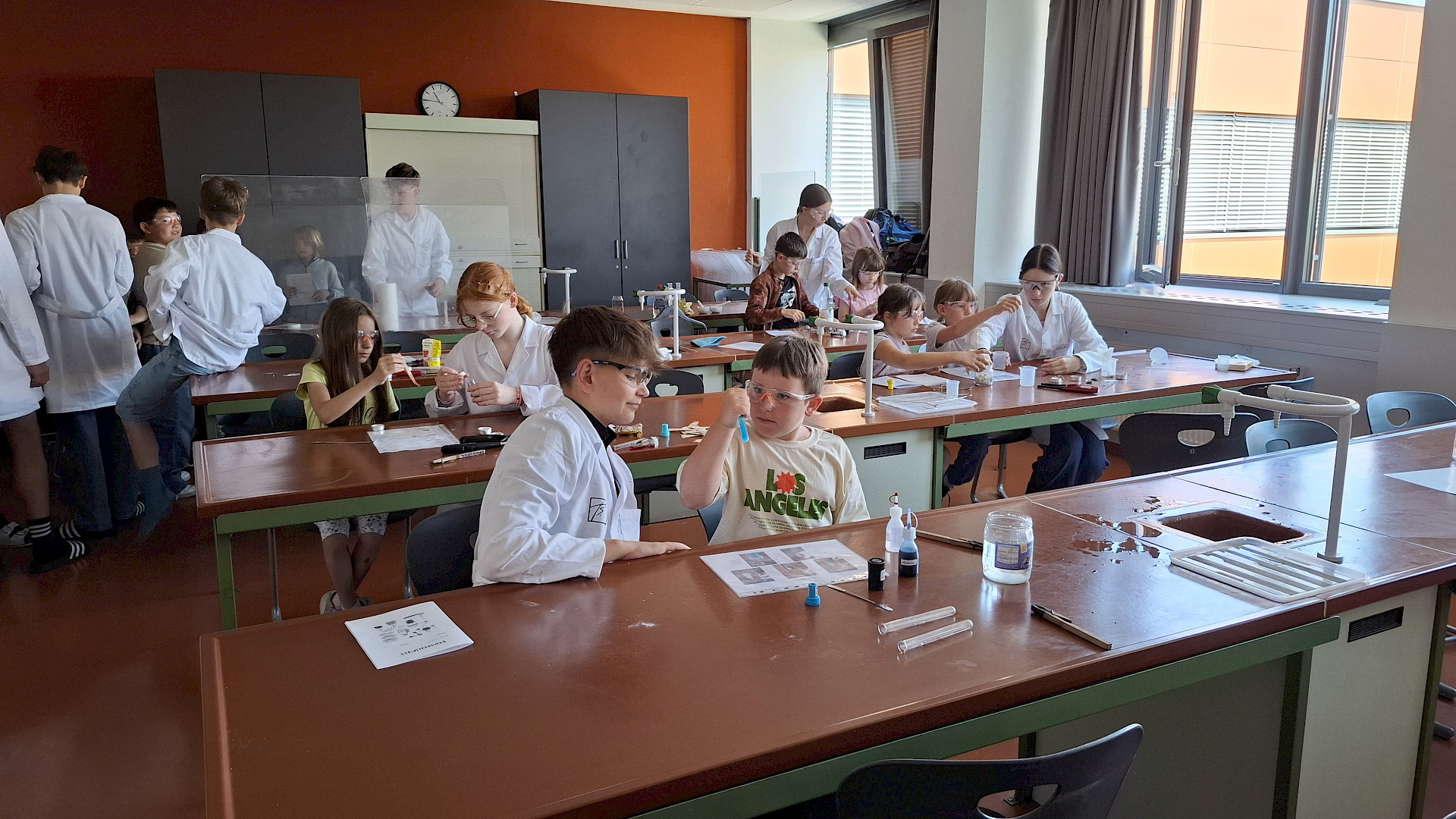 Der Besuch der Volksschulklassen im Chemie-Labor ist immer ein besonderes Highlight für unsere Schüler*innen der vierten NAWI-Klassen. Im Laufe des Schuljahres wurden Experimente ausprobiert, Versuchsanleitungen erstellt und überlegt, wie man die Theorie der Versuche kindgerecht erklären kann.