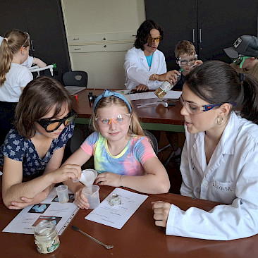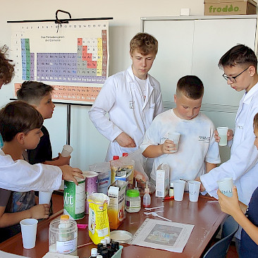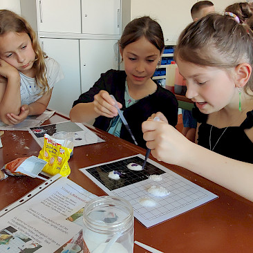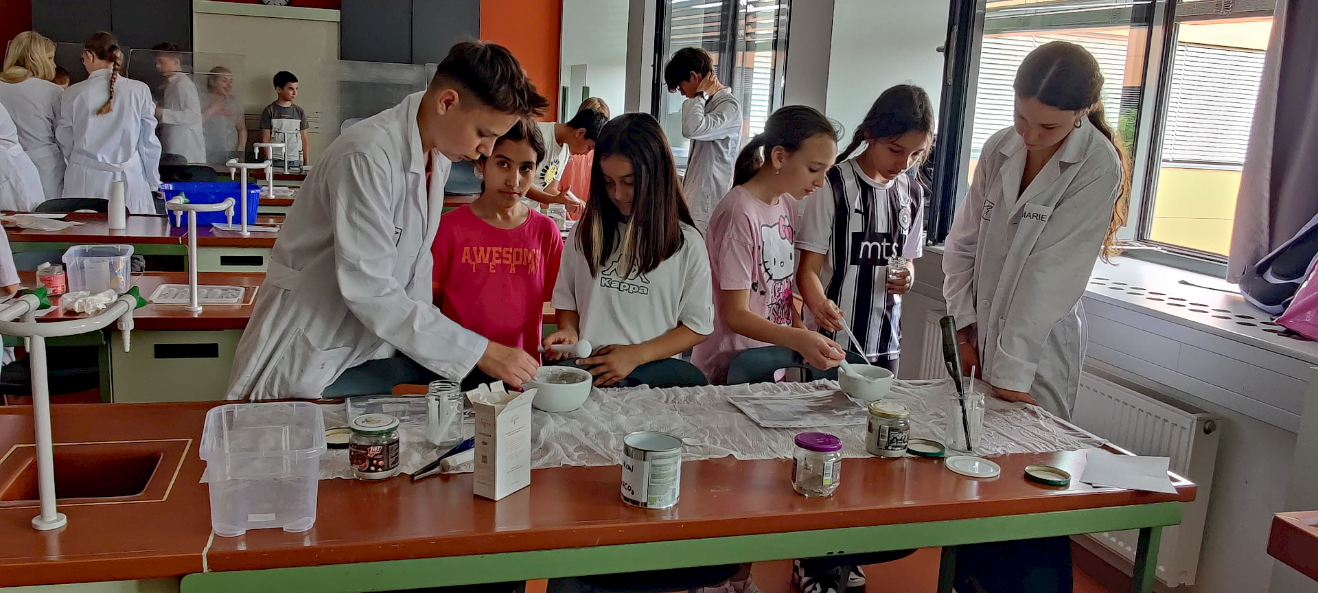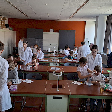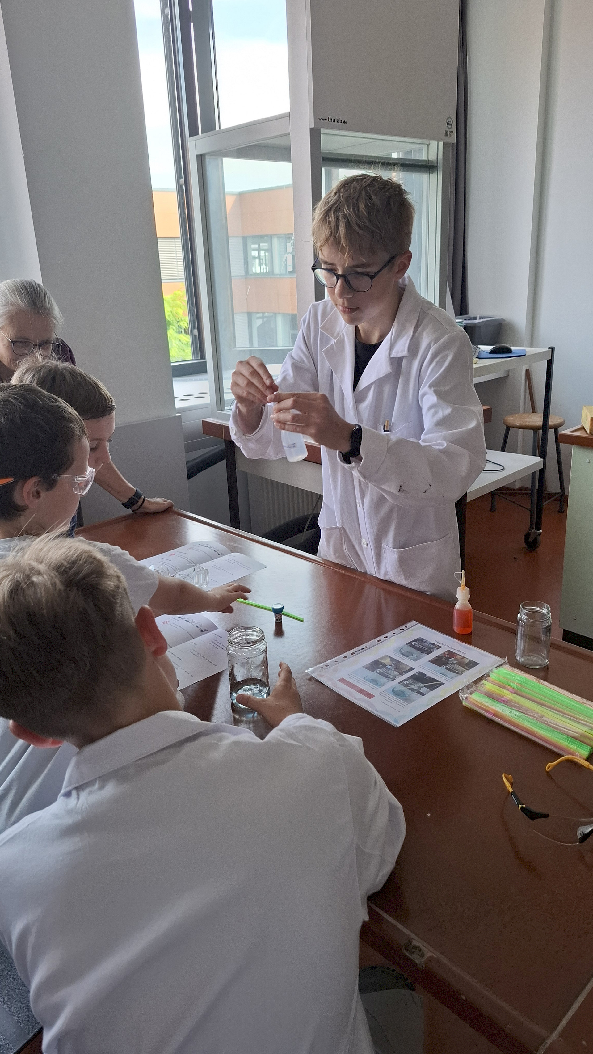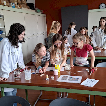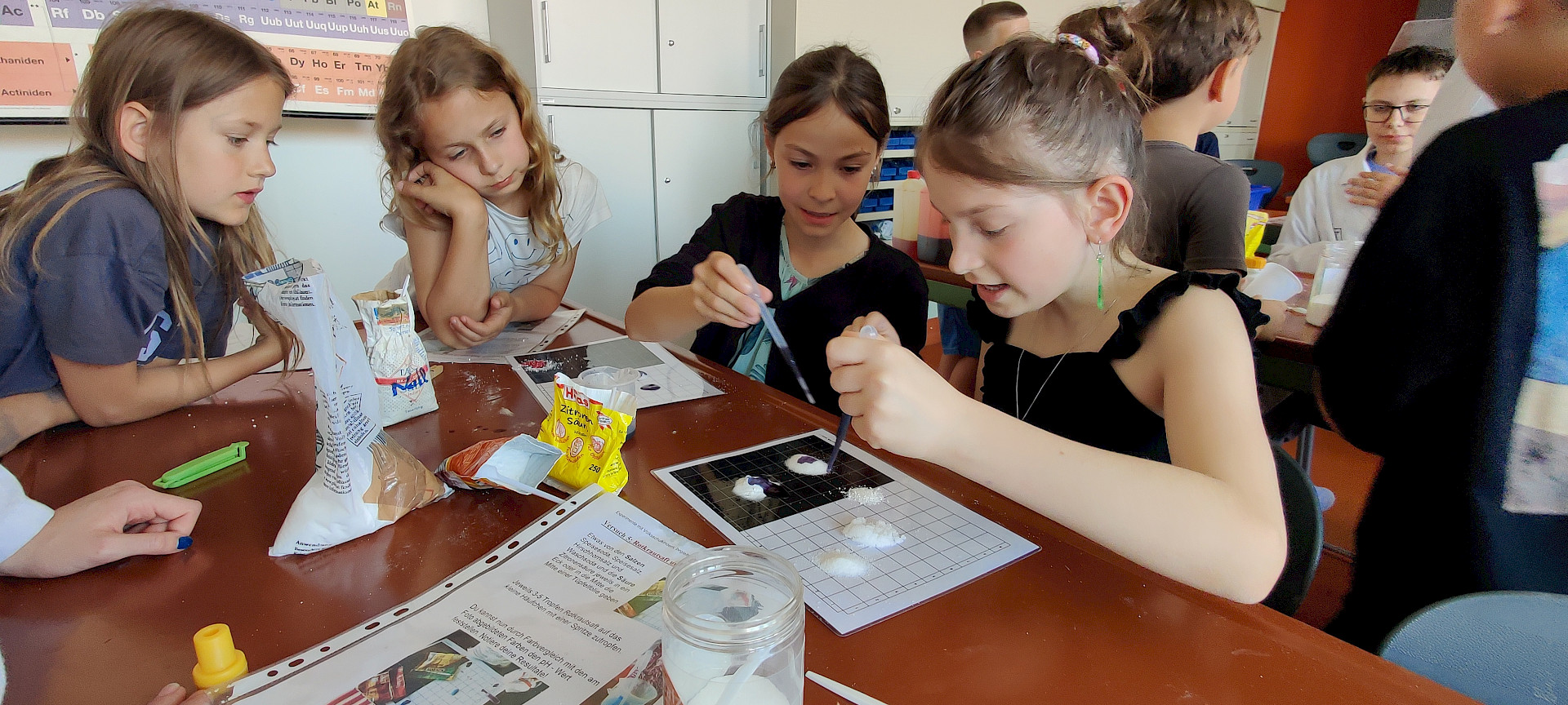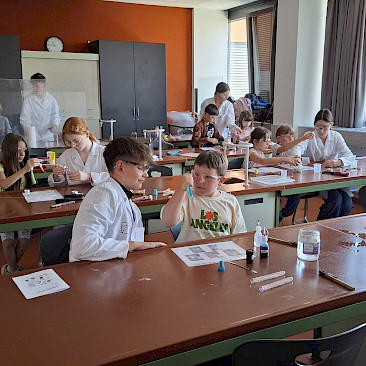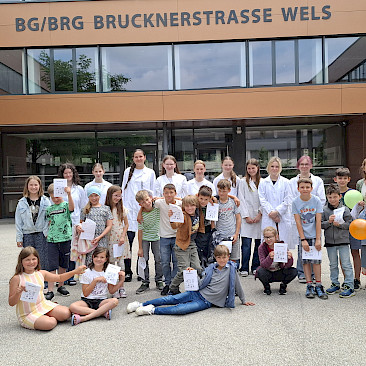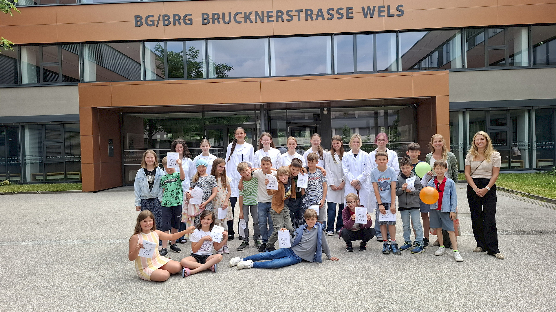 Im Juni war es dann endlich soweit: Die Schüler*innen der 4NA und 4NB durften Kinder der VS6 Neustadt, VS7 Puchberg, VS Thalheim und des ISZ Wels im Chemiesaal begrüßen. Bestens vorbereitet führten sie durch die Stationen und unterstützen die Volksschüler*innen beim Experimentieren. Dabei wurden unter anderem spannende Farbveränderungen beobachtet, eine Kerze ausgelöscht ohne sie auszupusten, ein schäumender „Cocktail“ aus Kreidestaub hergestellt und sogar eine Filmdose in die Luft gejagt.