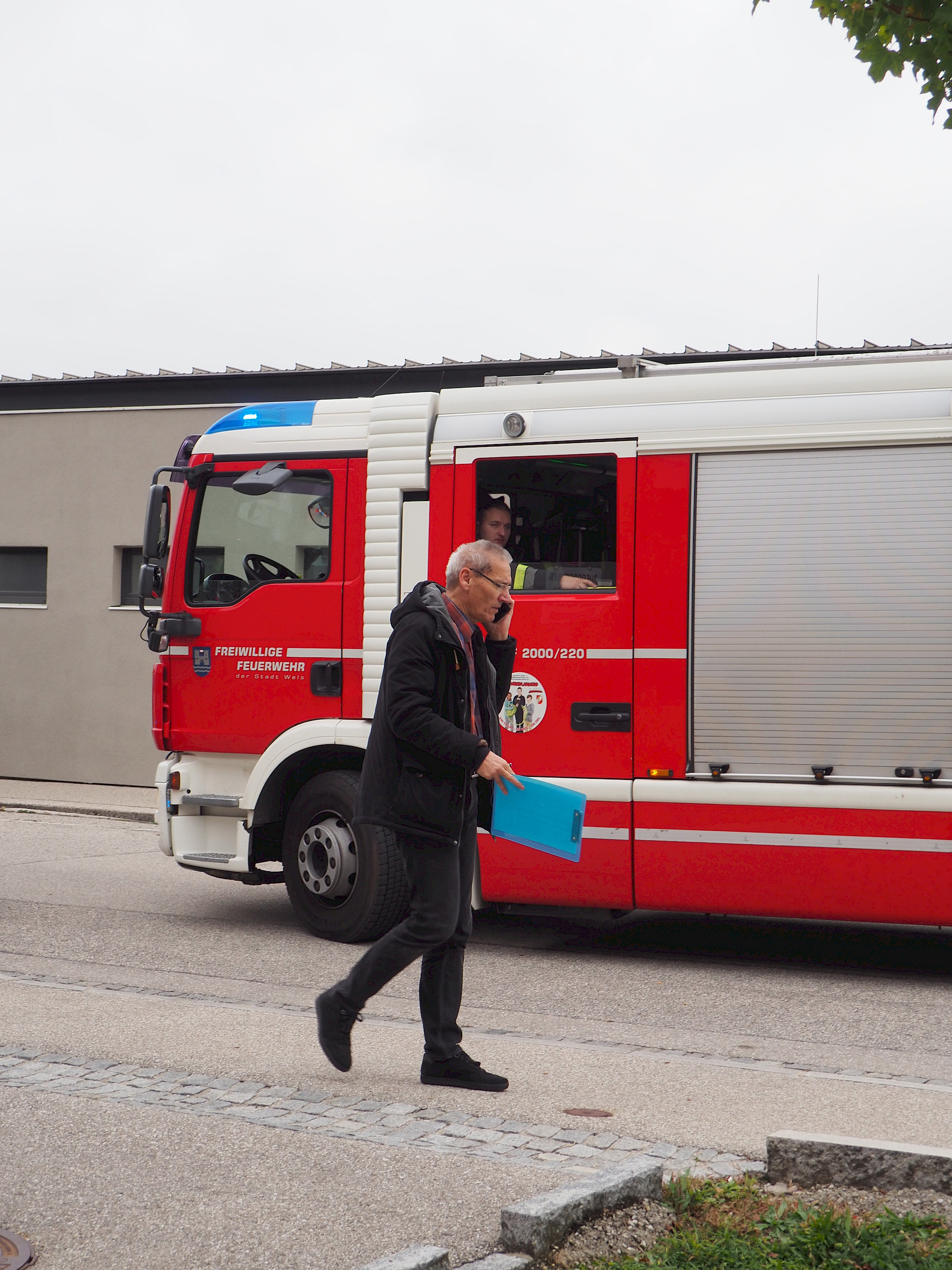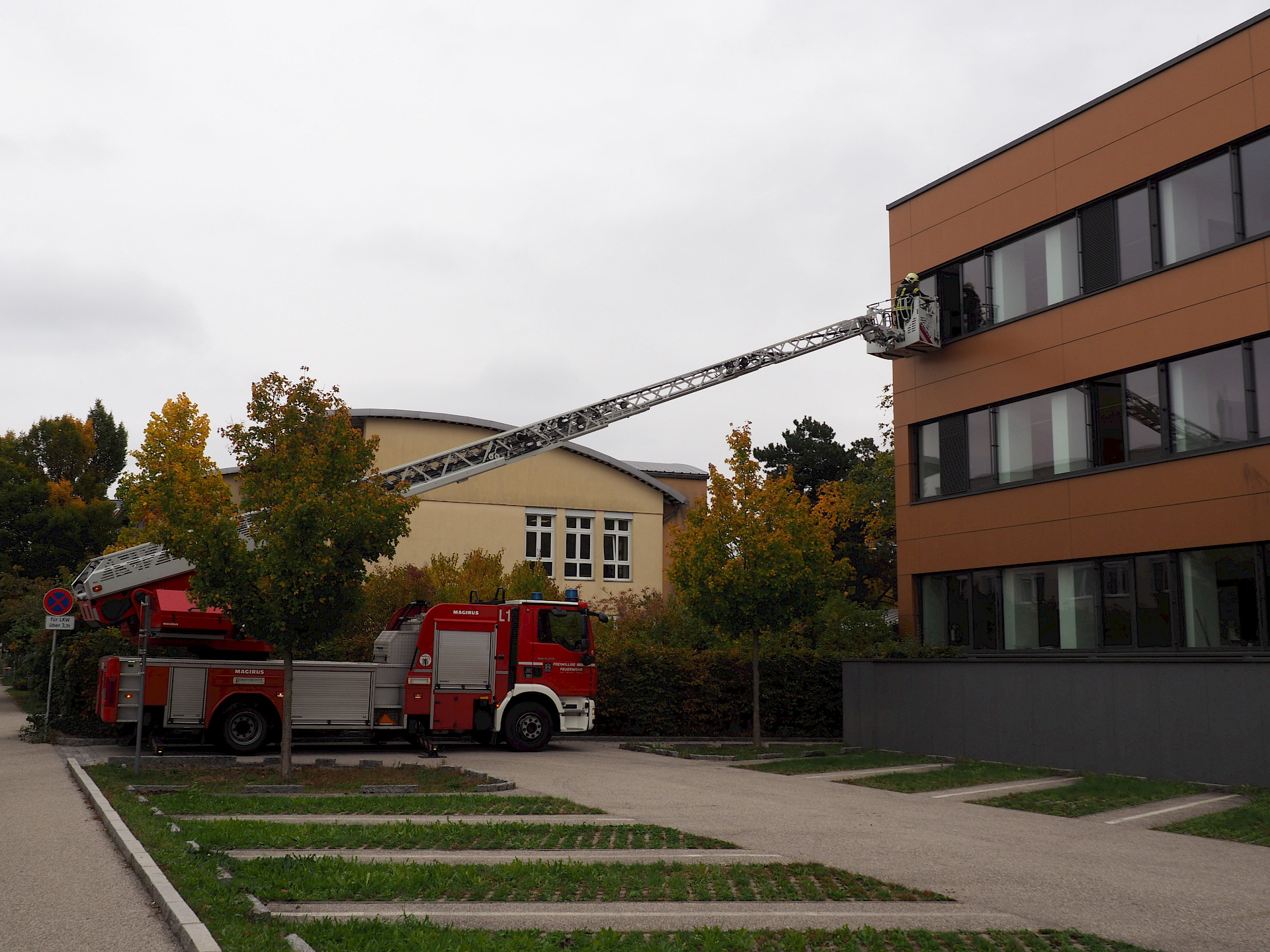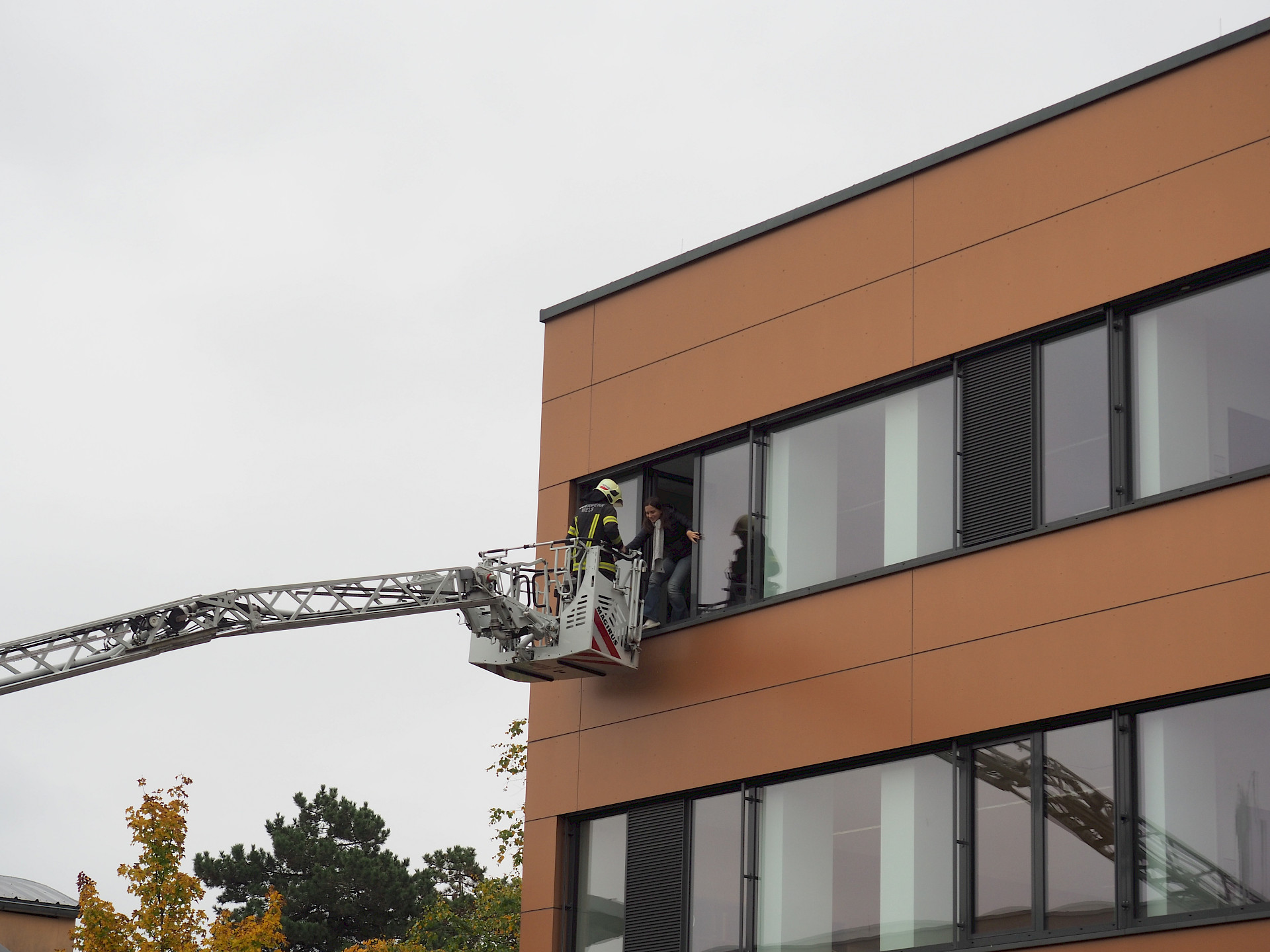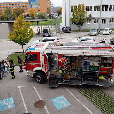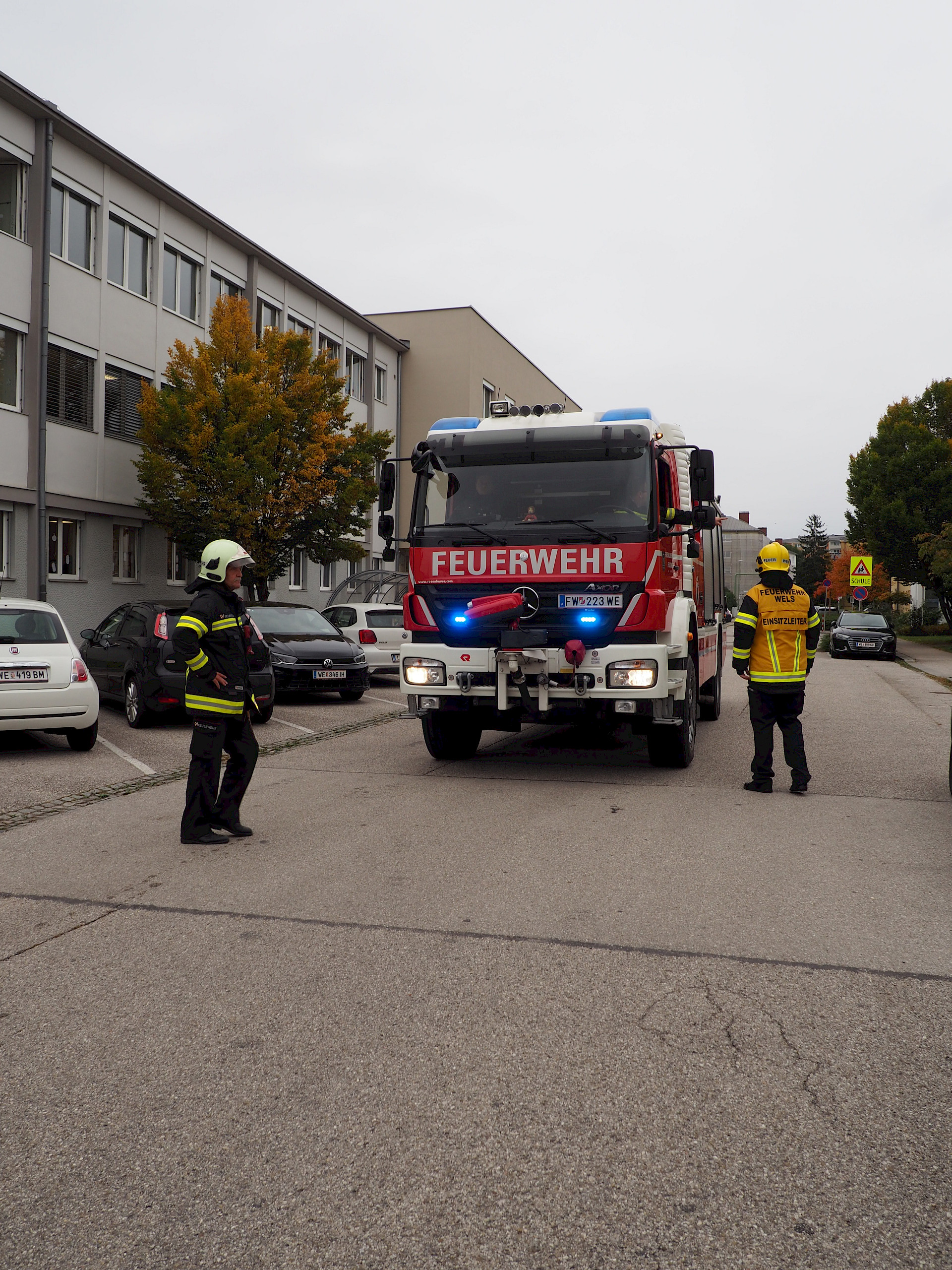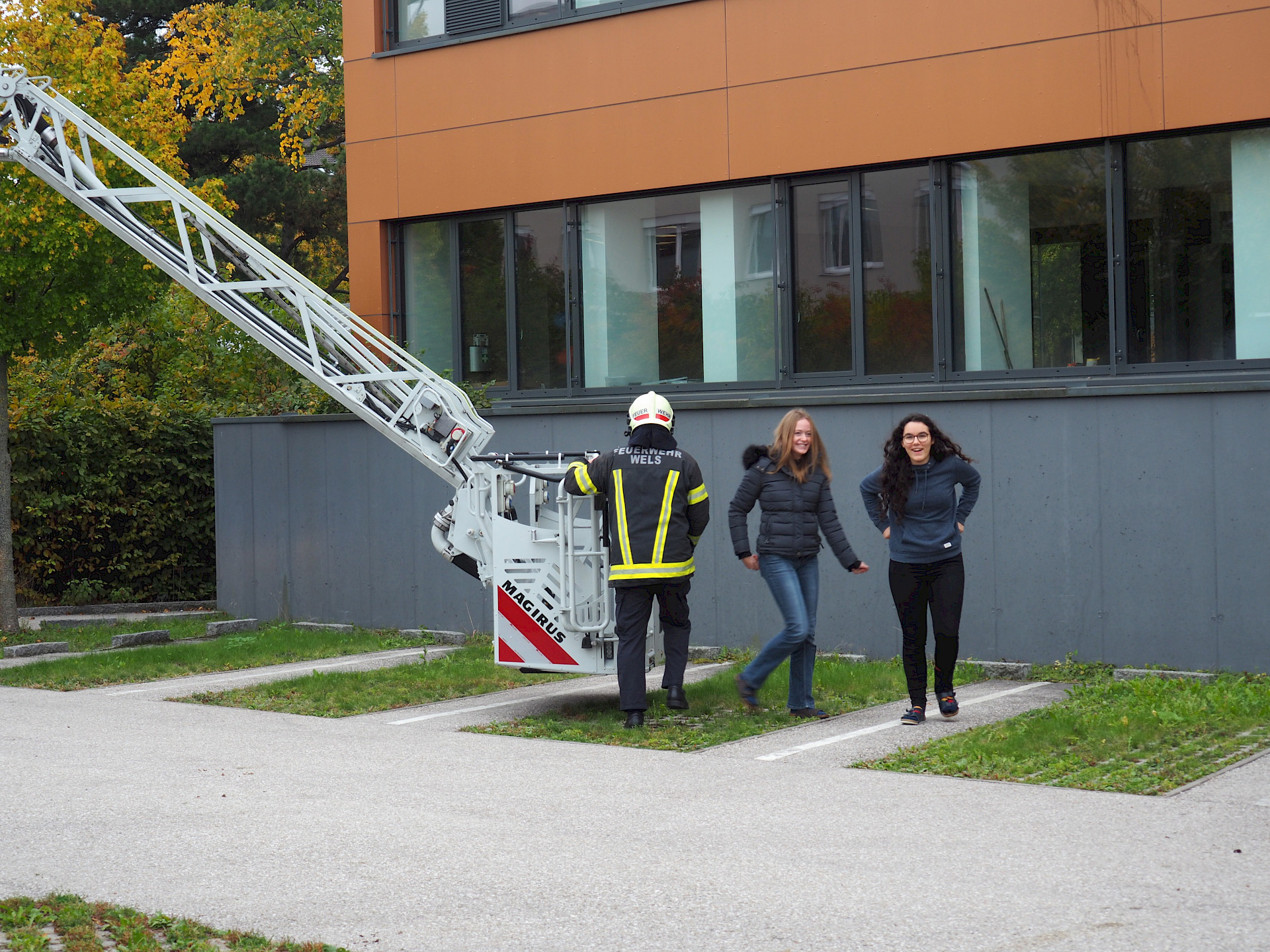 Besonders eindrucksvoll war auch heuer wieder die aktive Unterstützung durch die Feuerwehr Wels. Um einen realistischen Einsatz zu simulieren, blieben Herr Prof. Jaidhauser sowie einige Schüler*innen der 8C in ihrem Klassenraum im zweiten Stock zurück.