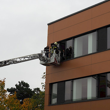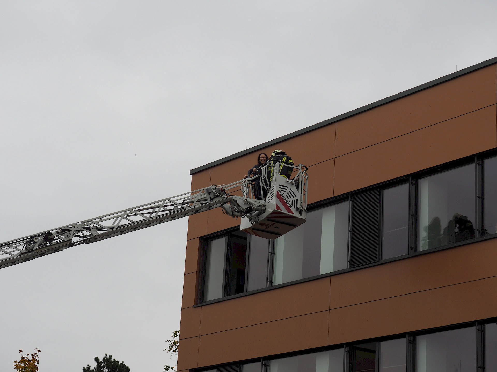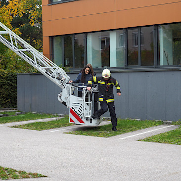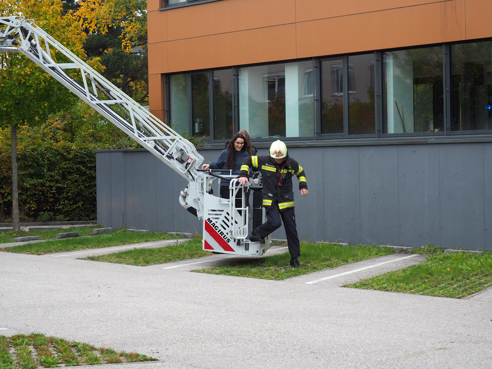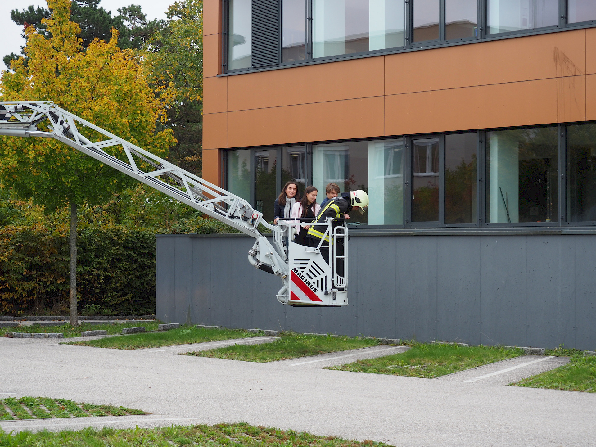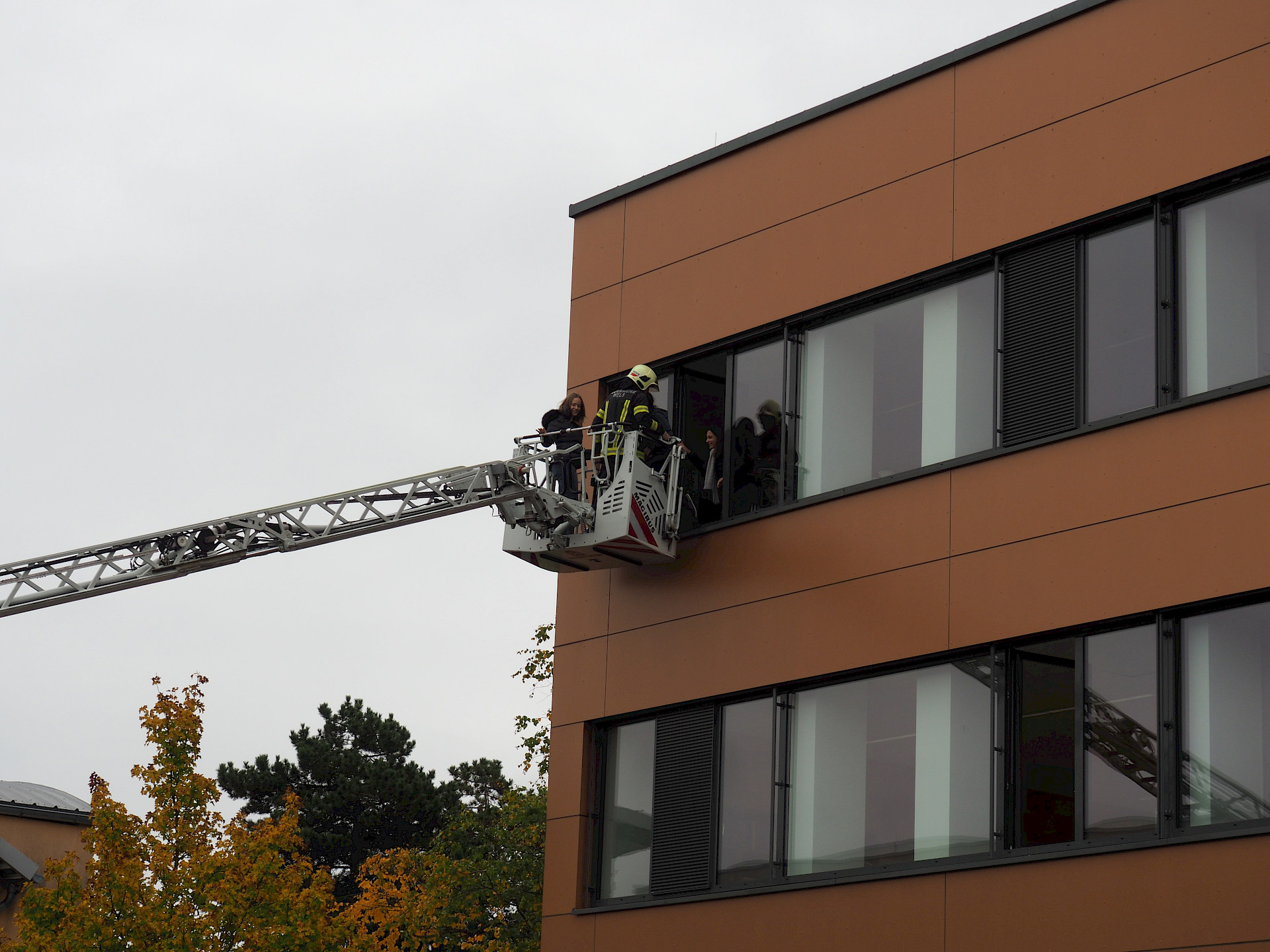 Das Szenario: Das Stiegenhaus ist so stark verraucht, sodass eine selbstständige Flucht unmöglich wäre. In einem solchen Fall kommt die ausfahrbare Drehleiter zum Einsatz – und genau das wurde geübt. Unter den interessierten Blicken der versammelten Schüler*innen fuhr die Leiter aus, und die „Eingeschlossenen“ wurden professionell und sicher aus dem Fenster gerettet. Ein beeindruckender Moment, der eindrucksvoll zeigte, welche Präzision und Routine ein solches Einsatzteam mitbringt.
