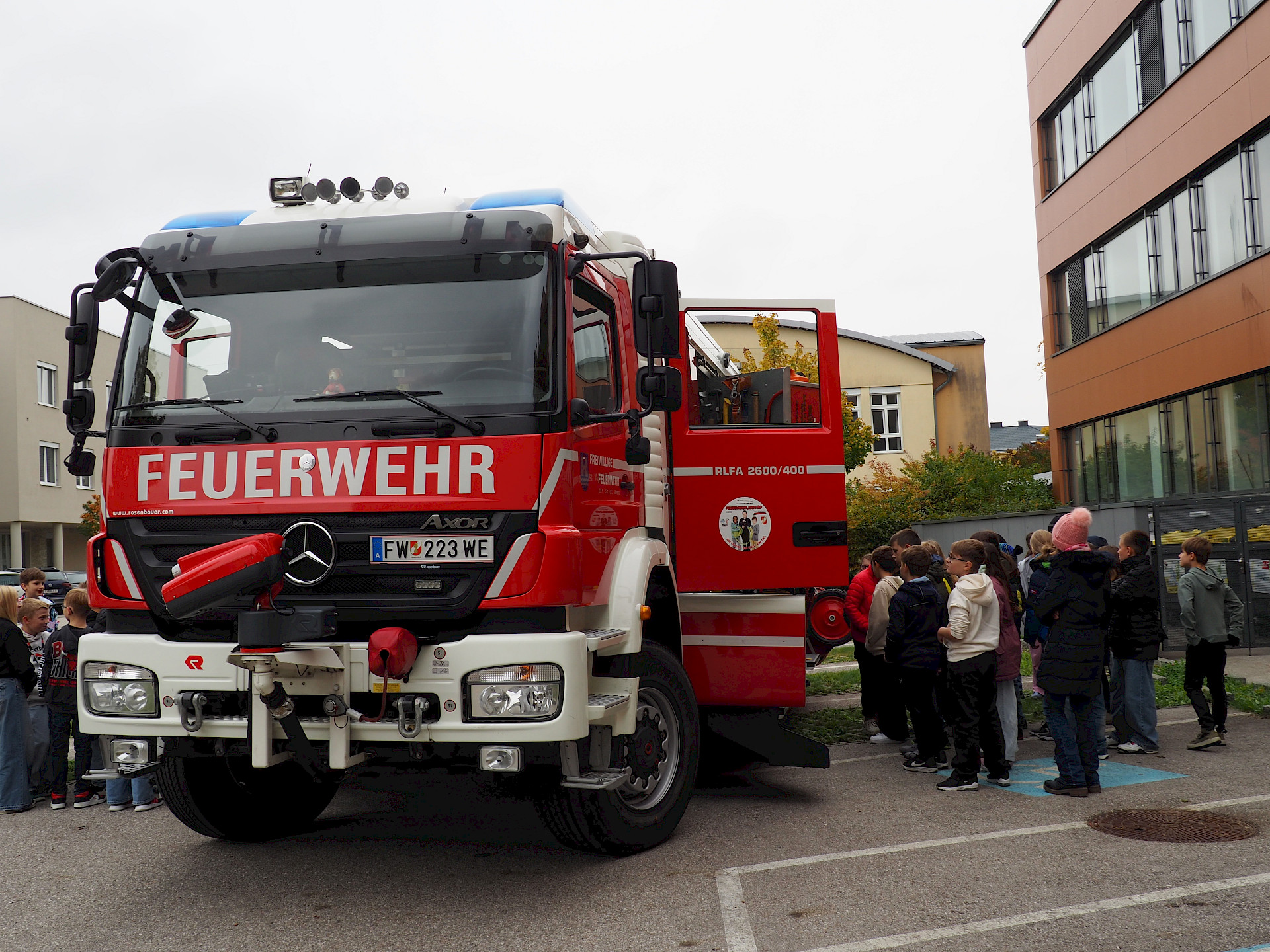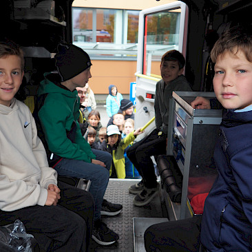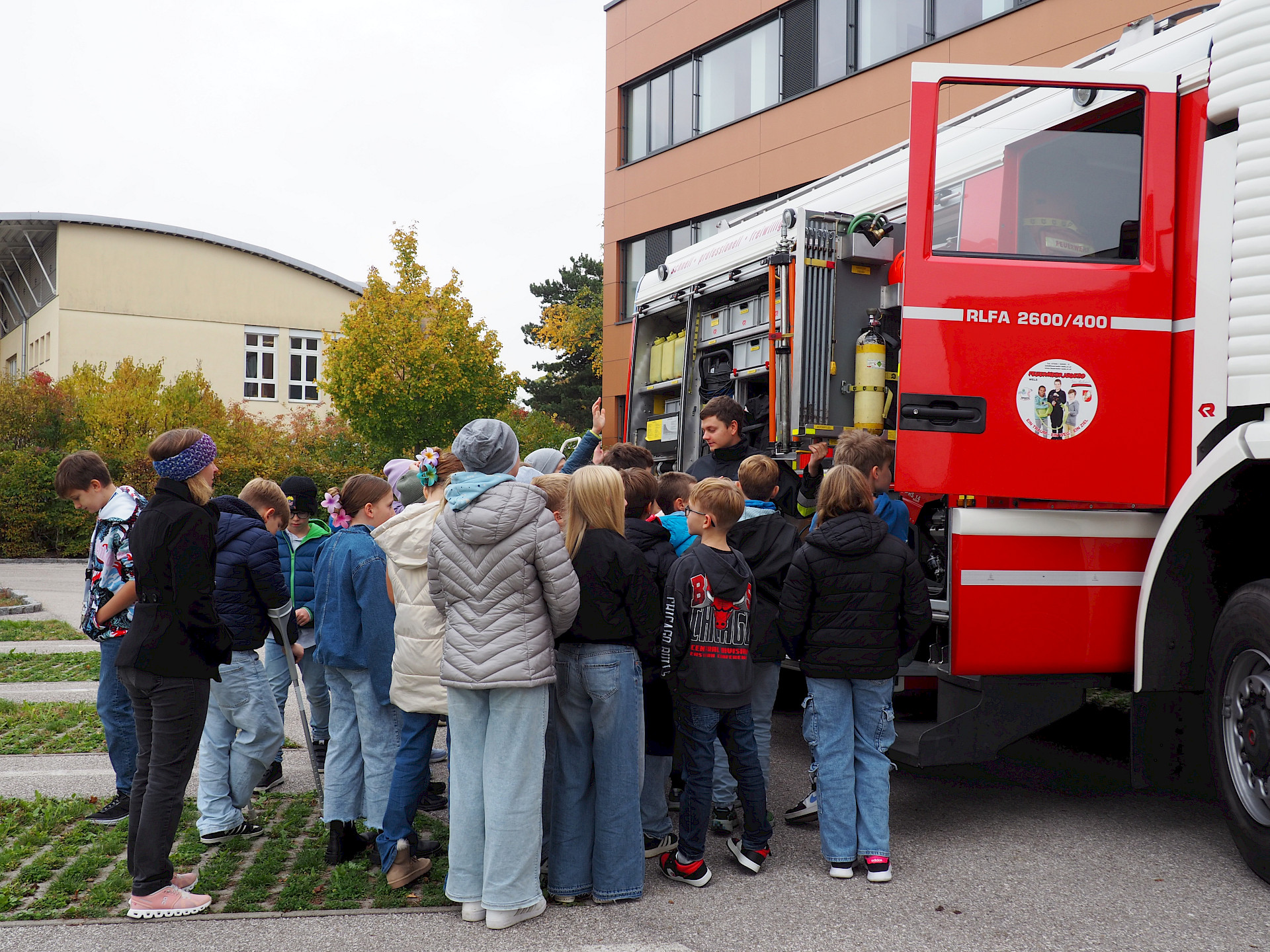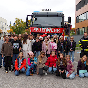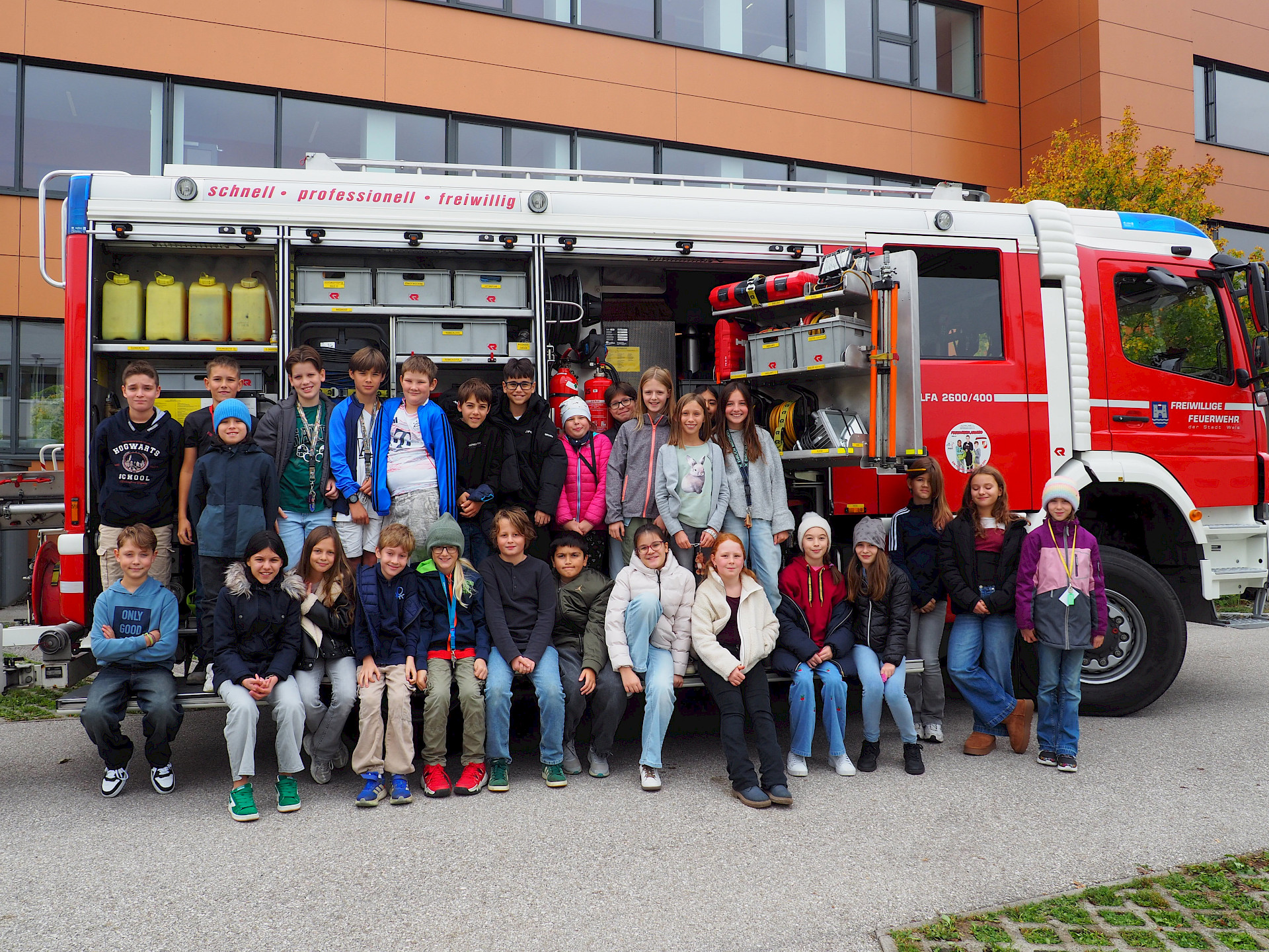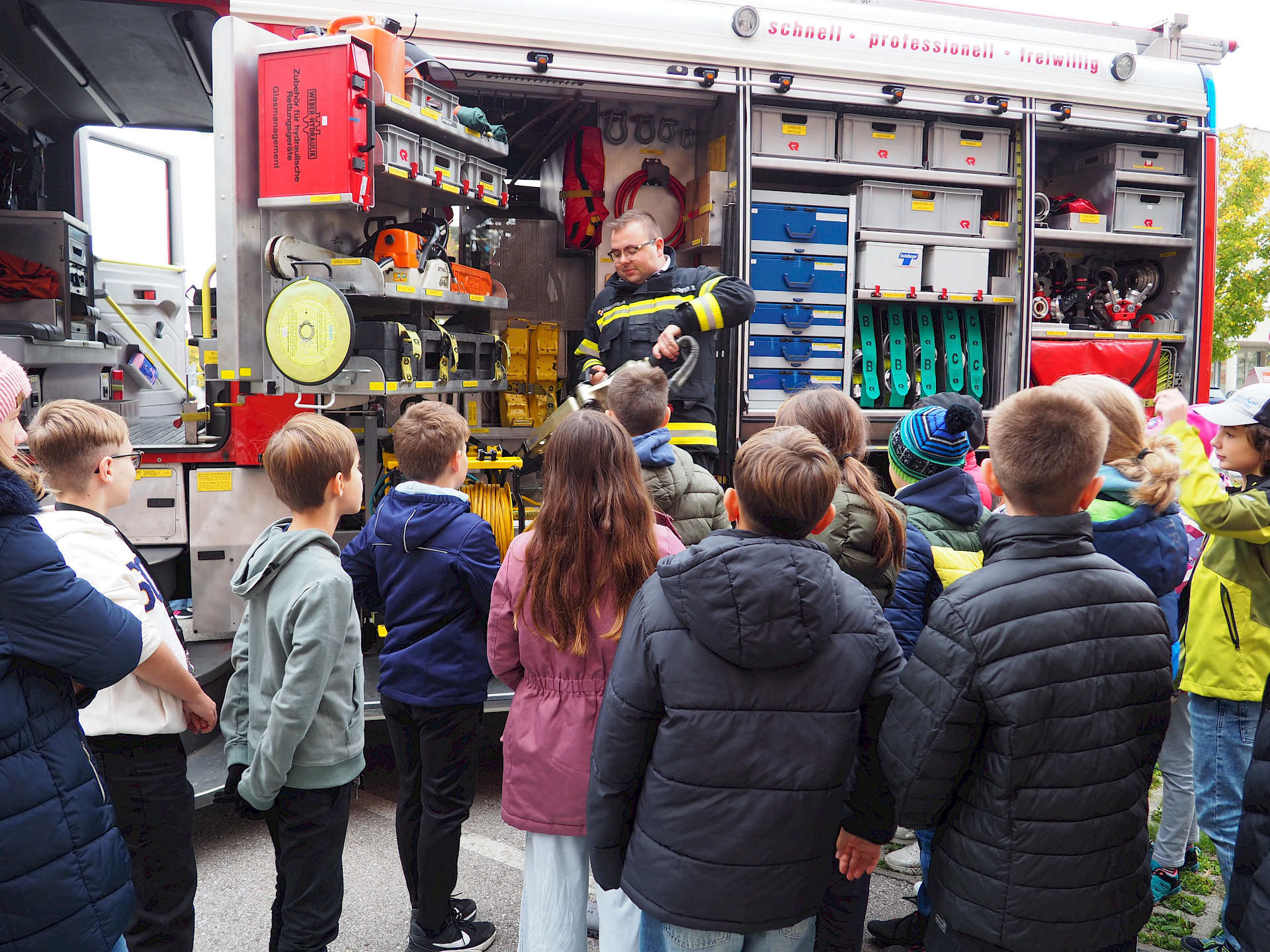 Für unsere Erstklässler*innen gab es zum Abschluss ein besonderes Highlight: Die Feuerwehr lud alle 1. Klassen ein, das große Einsatzfahrzeug aus nächster Nähe zu bestaunen. Die Kinder erfuhren spannende technische Details, bekamen Einblicke in vergangene Einsätze und durften sogar Fragen zu Ausrüstung, Notfalltechnik und Arbeitsablauf stellen.