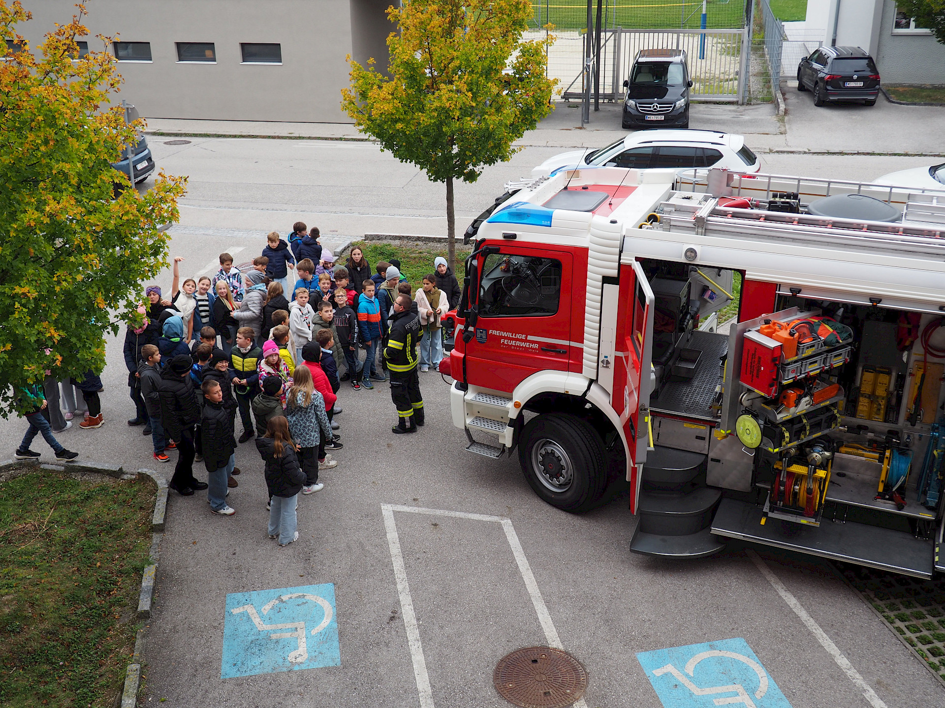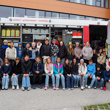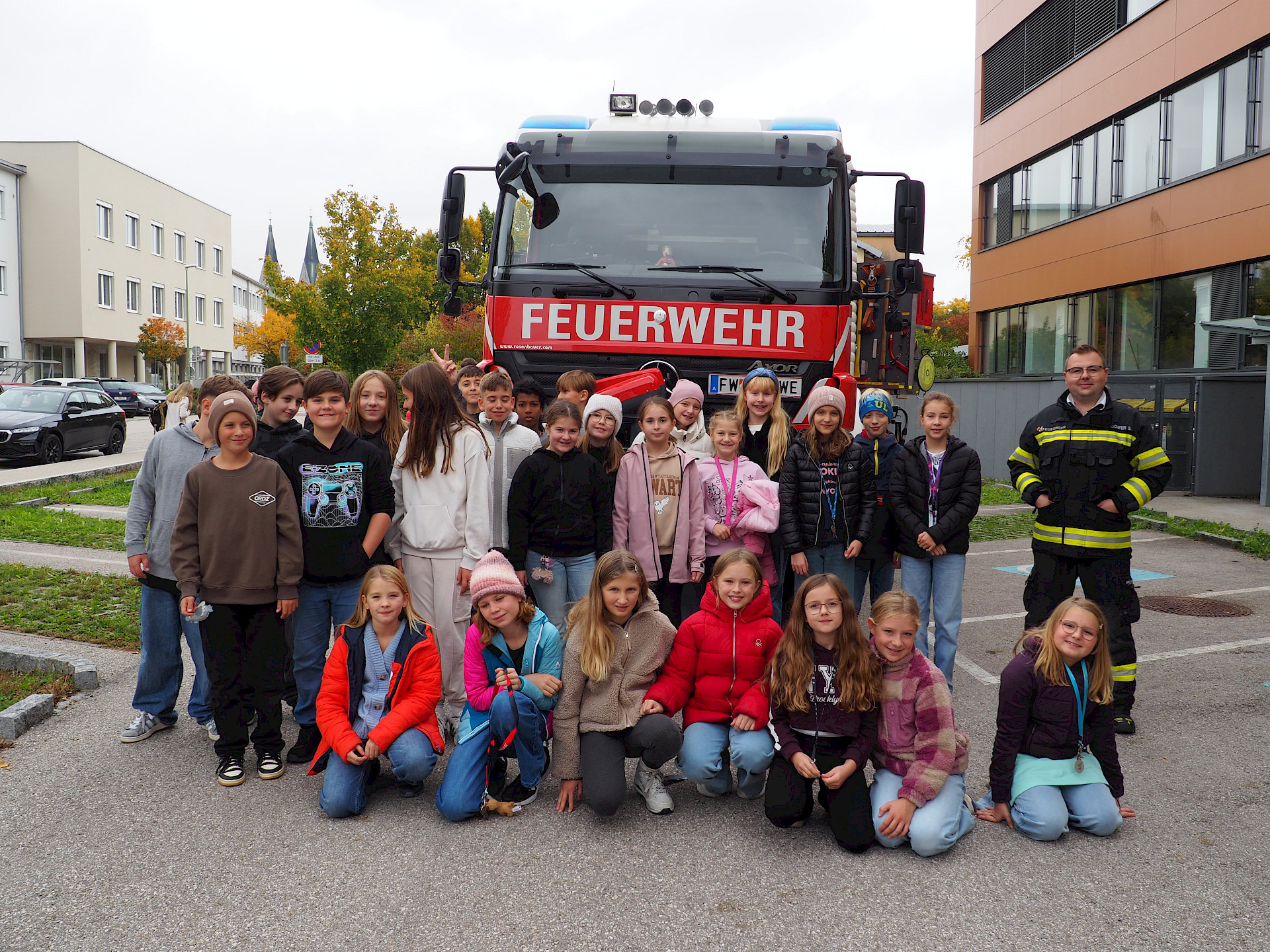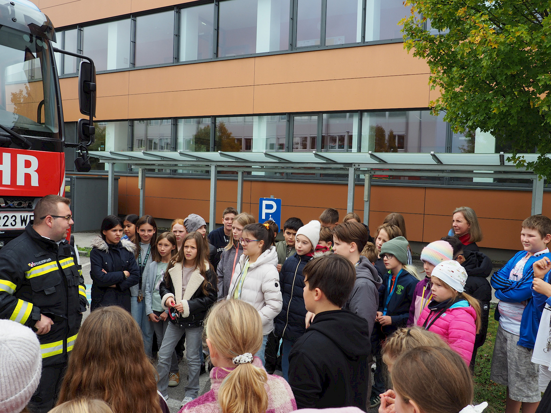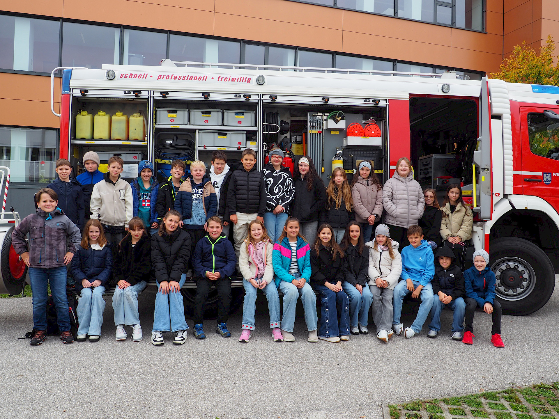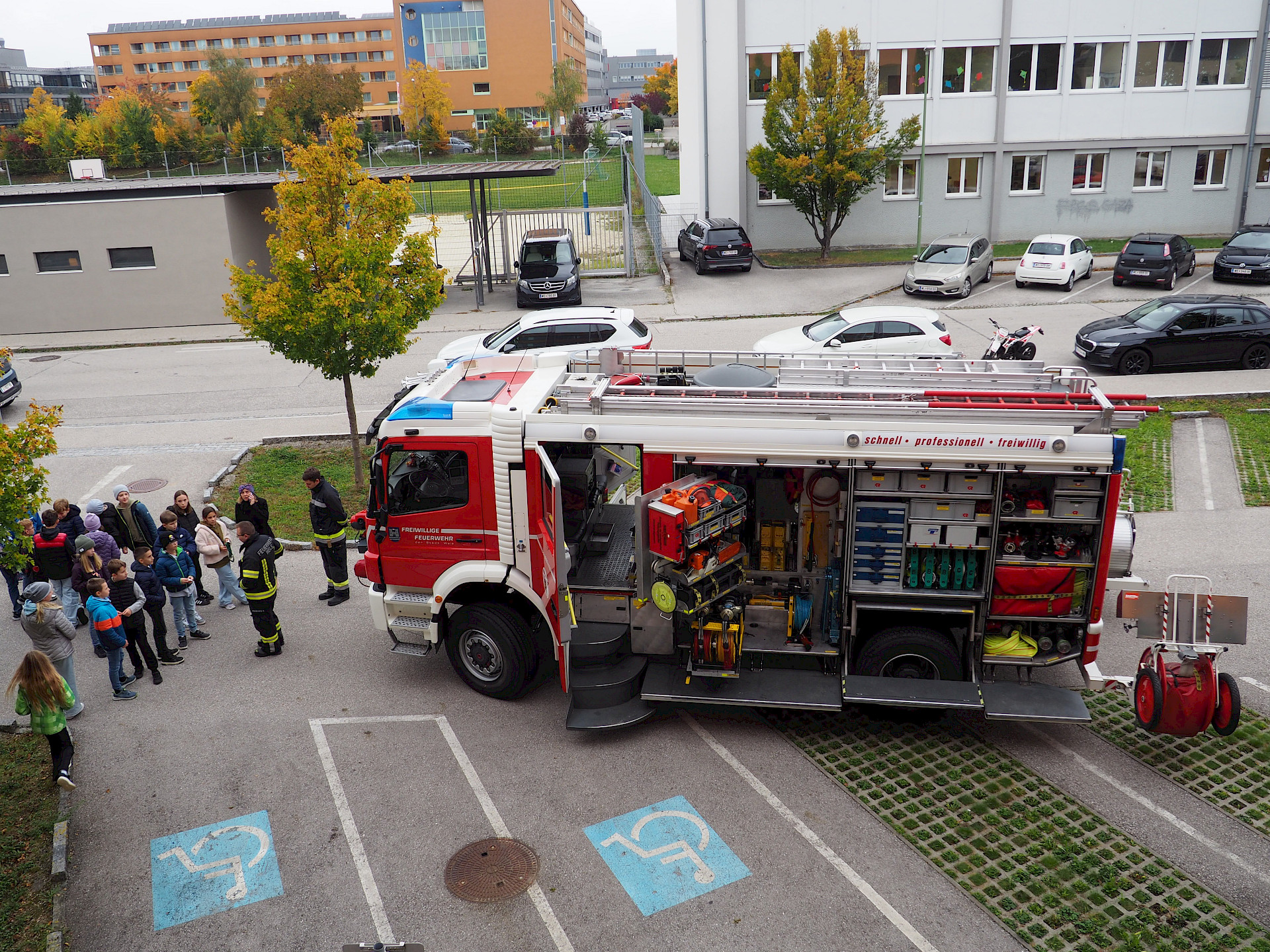 Für unsere Erstklässler*innen gab es zum Abschluss ein besonderes Highlight: Die Feuerwehr lud alle 1. Klassen ein, das große Einsatzfahrzeug aus nächster Nähe zu bestaunen. Die Kinder erfuhren spannende technische Details, bekamen Einblicke in vergangene Einsätze und durften sogar Fragen zu Ausrüstung, Notfalltechnik und Arbeitsablauf stellen.