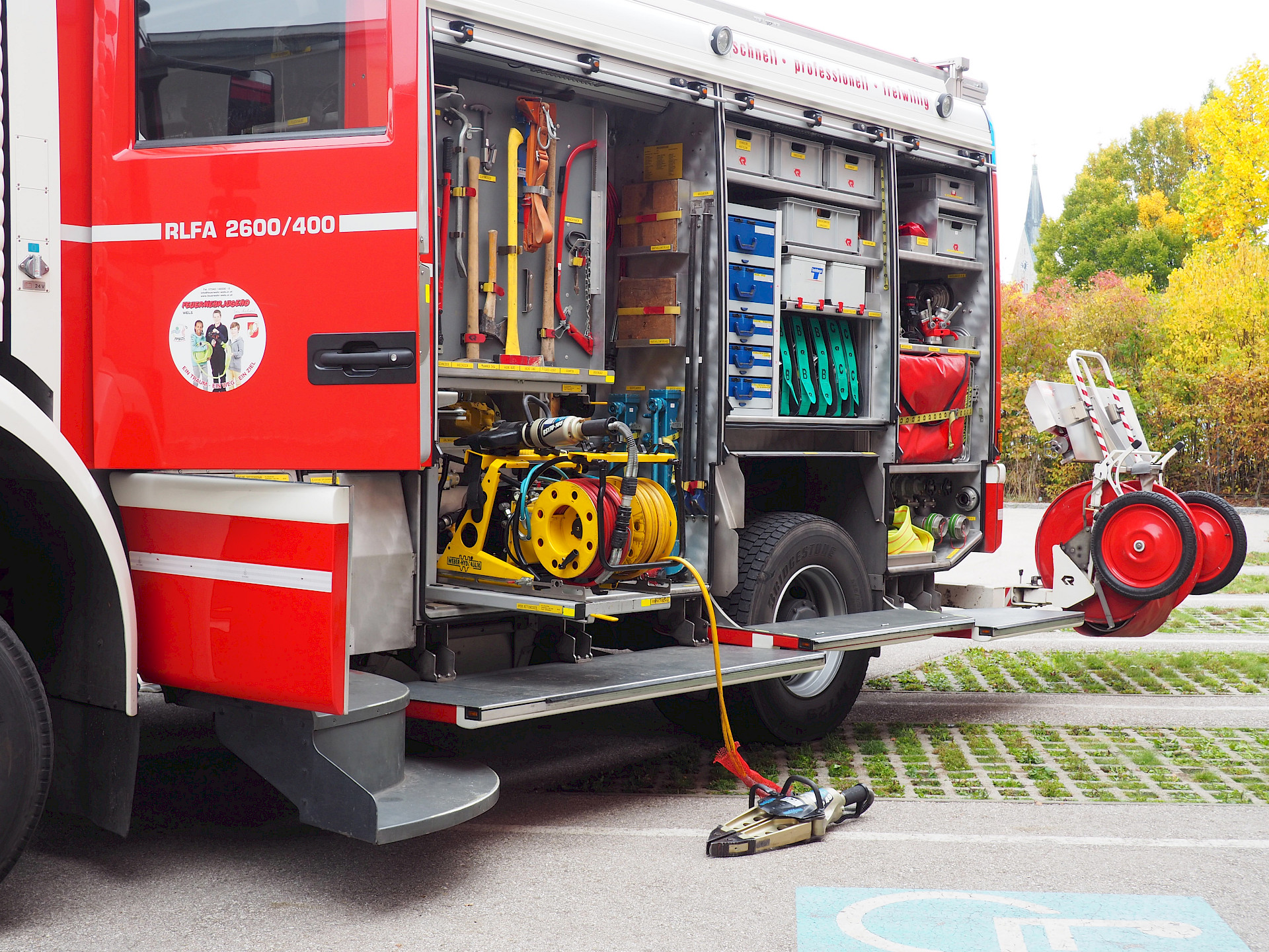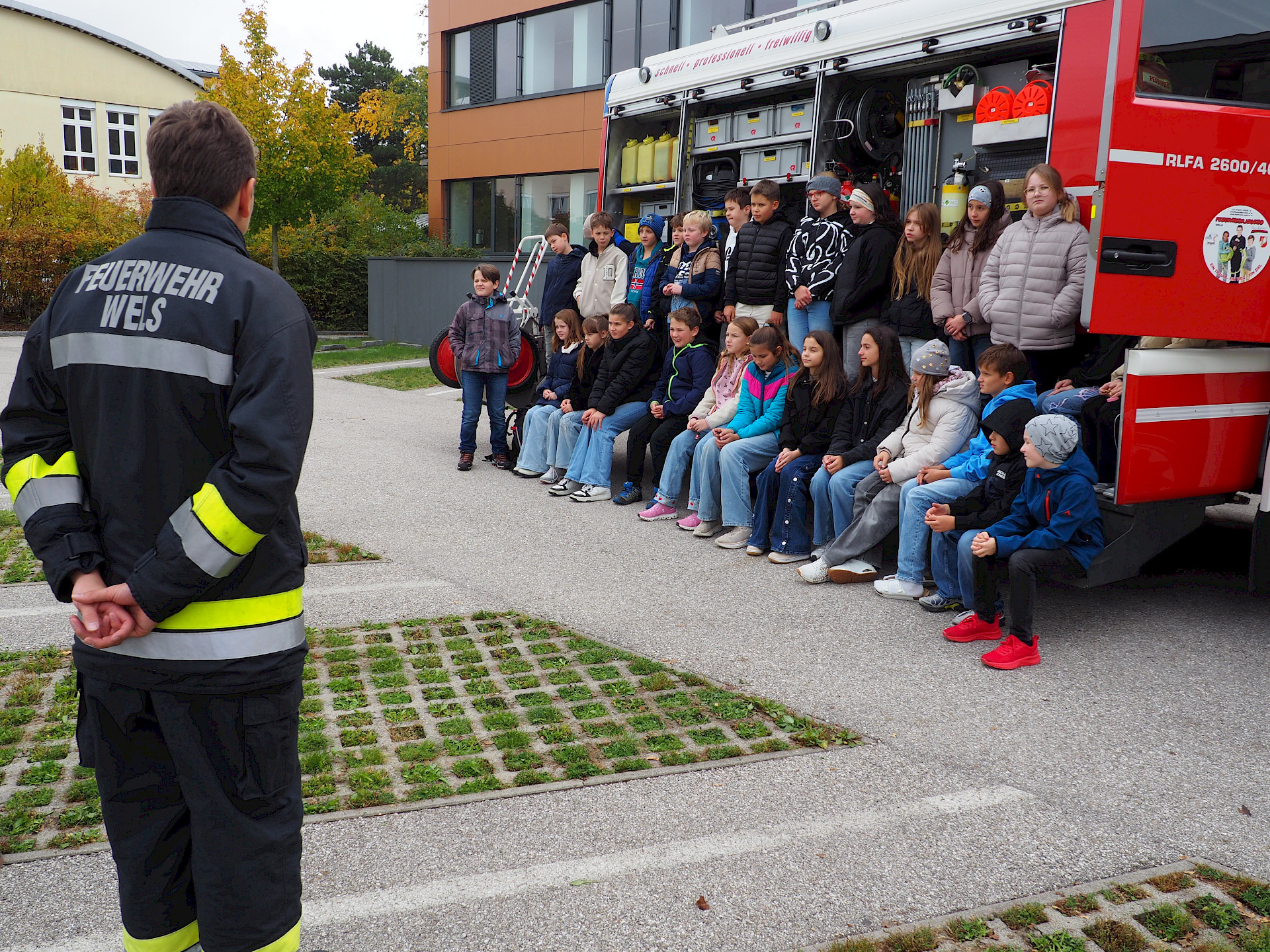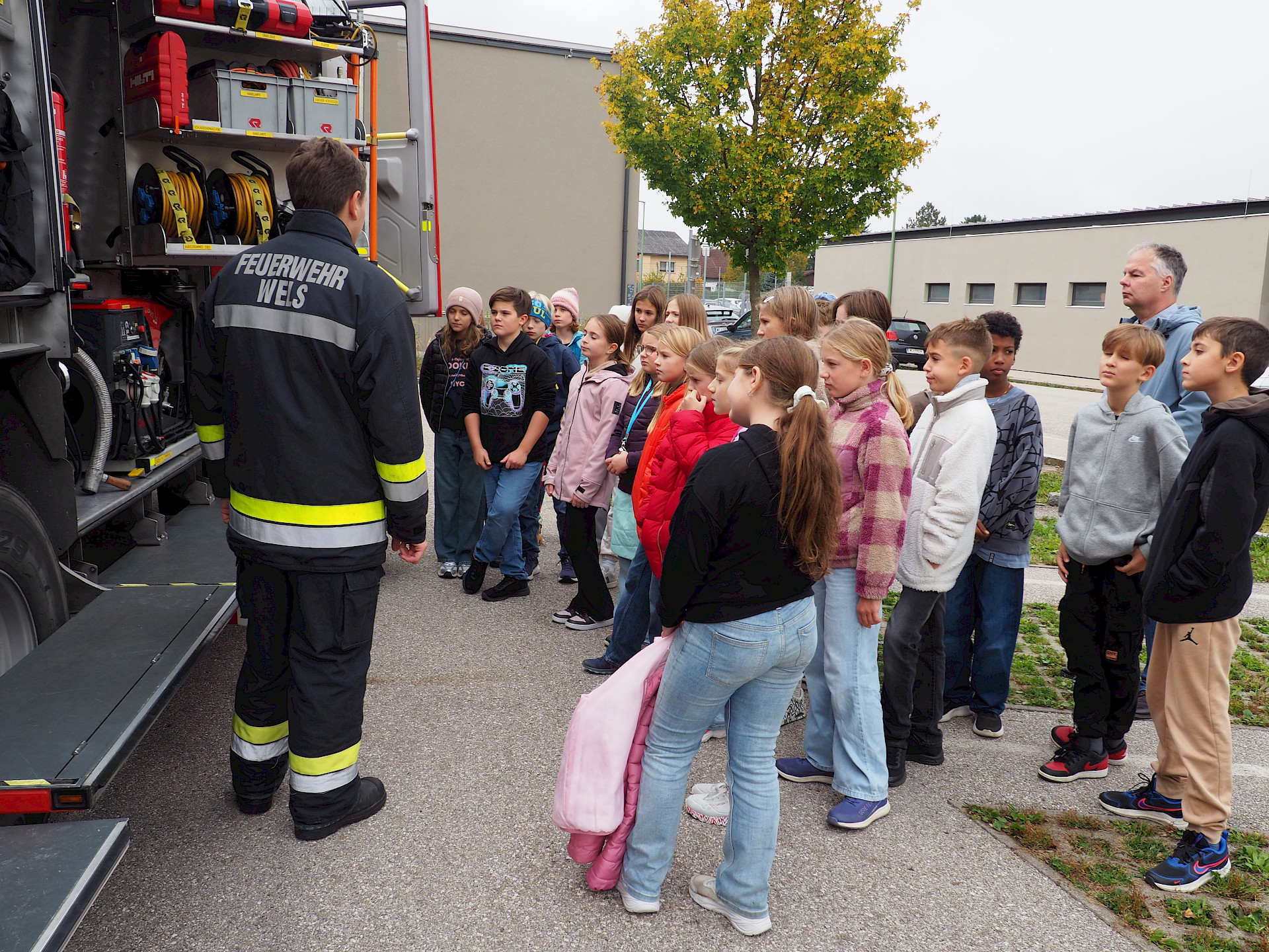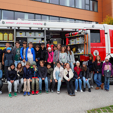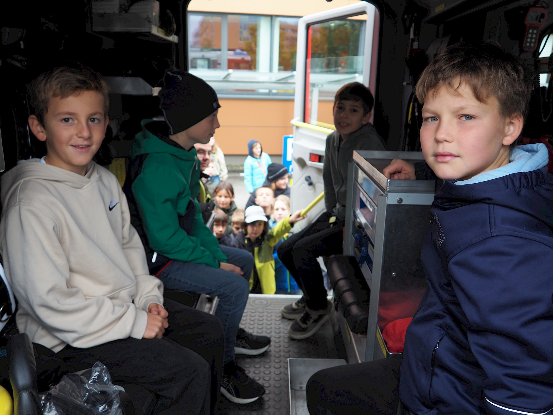 Für unsere Erstklässler*innen gab es zum Abschluss ein besonderes Highlight: Die Feuerwehr lud alle 1. Klassen ein, das große Einsatzfahrzeug aus nächster Nähe zu bestaunen. Die Kinder erfuhren spannende technische Details, bekamen Einblicke in vergangene Einsätze und durften sogar Fragen zu Ausrüstung, Notfalltechnik und Arbeitsablauf stellen.