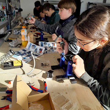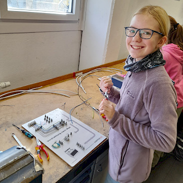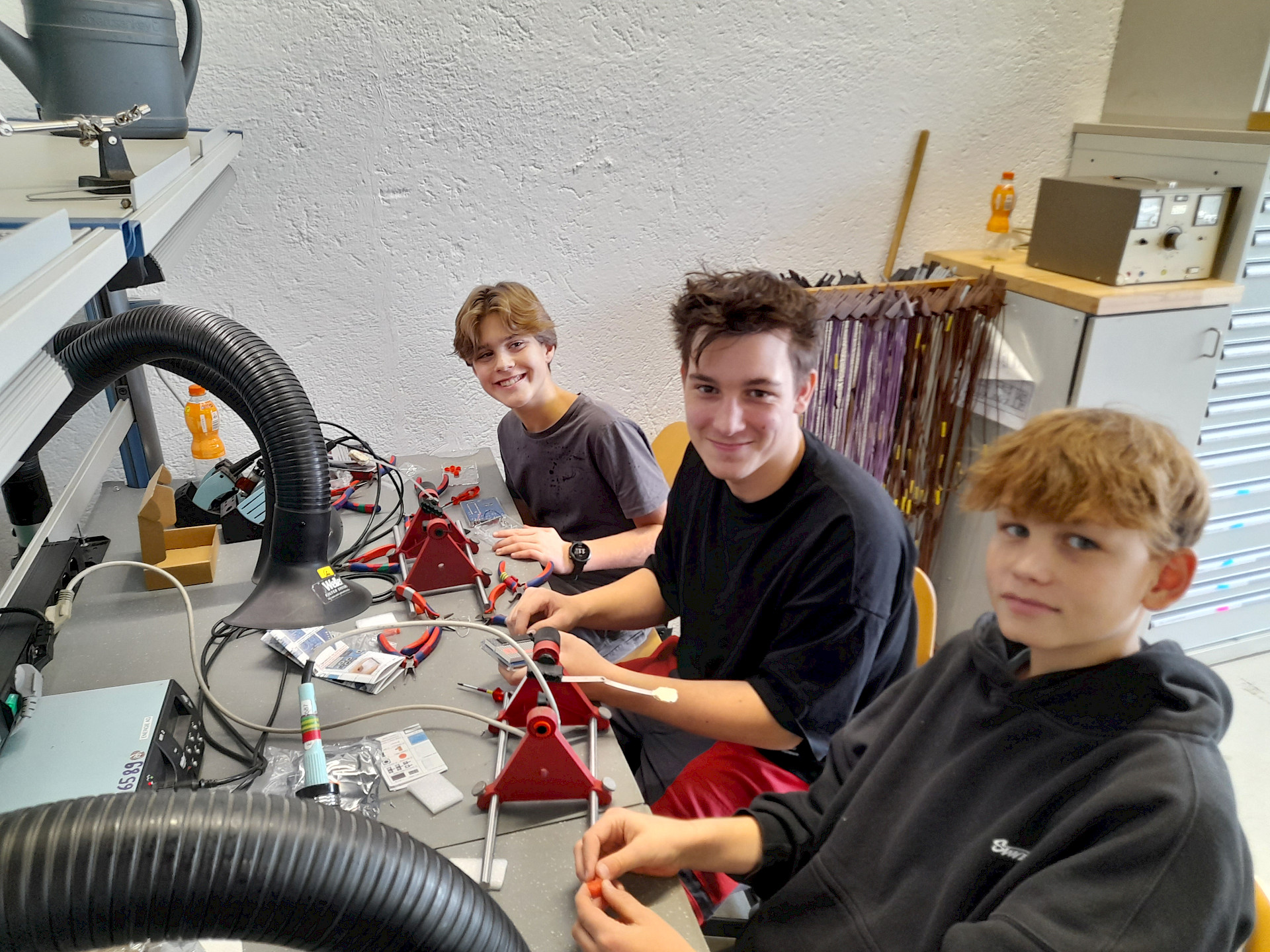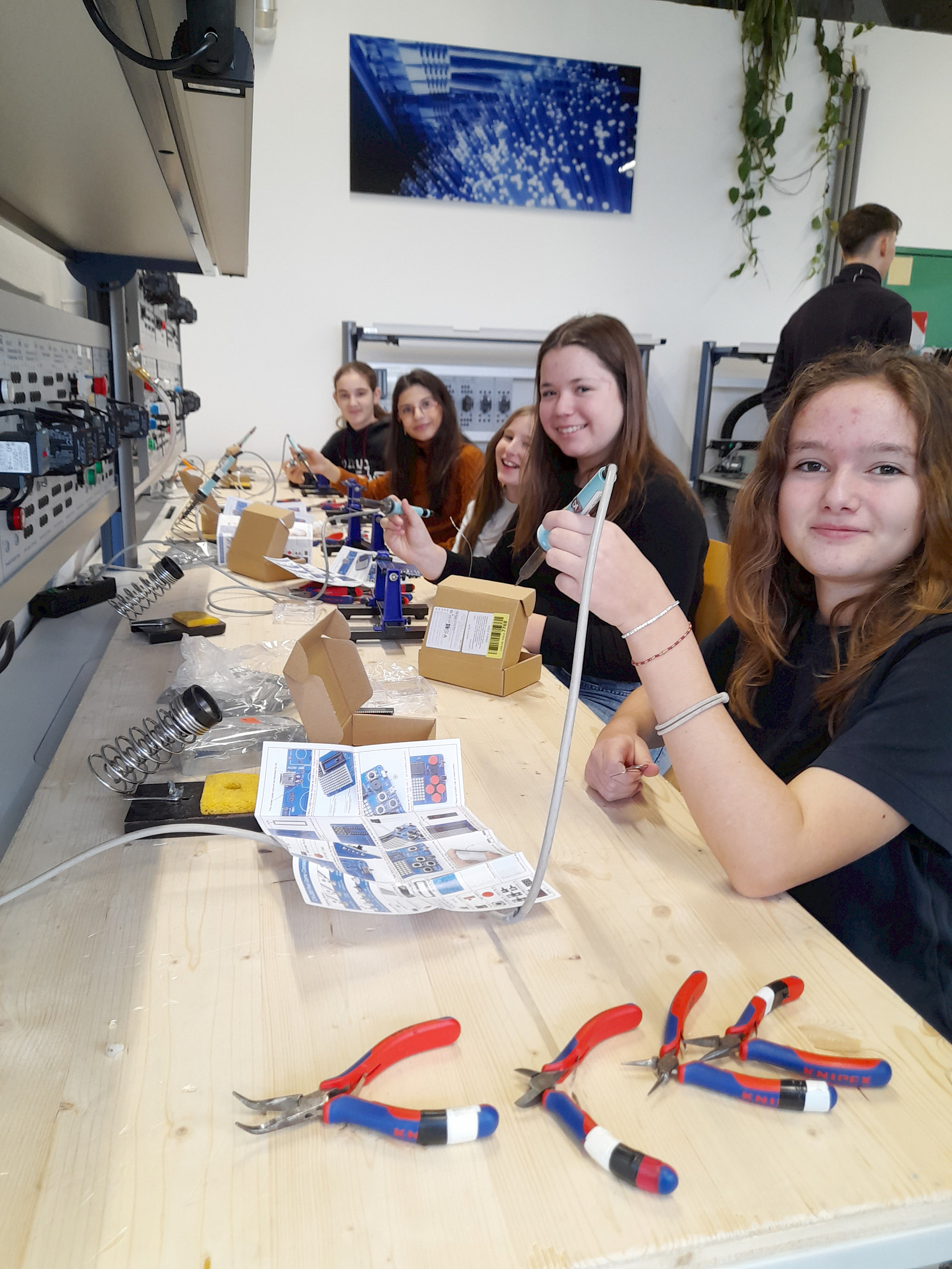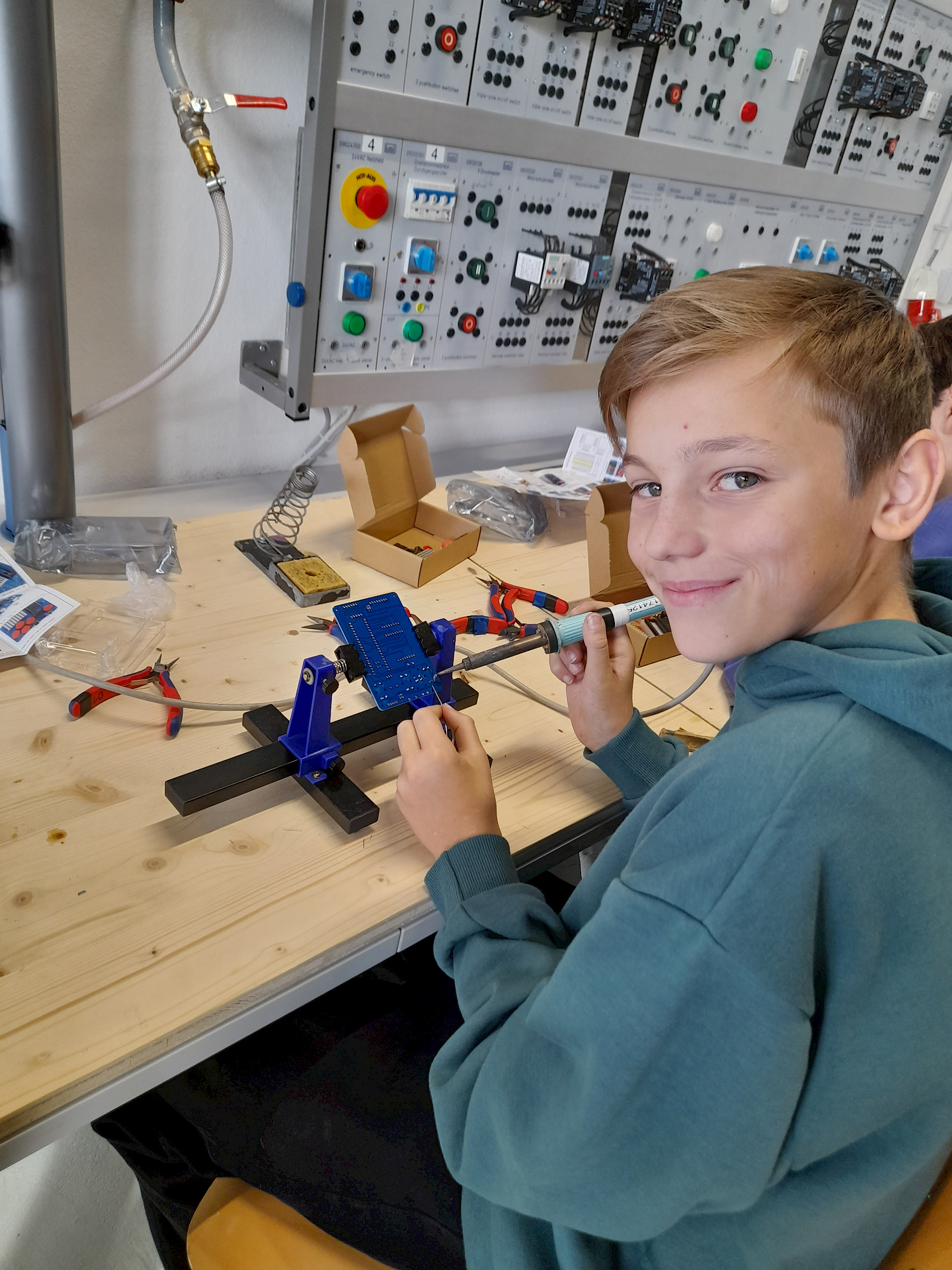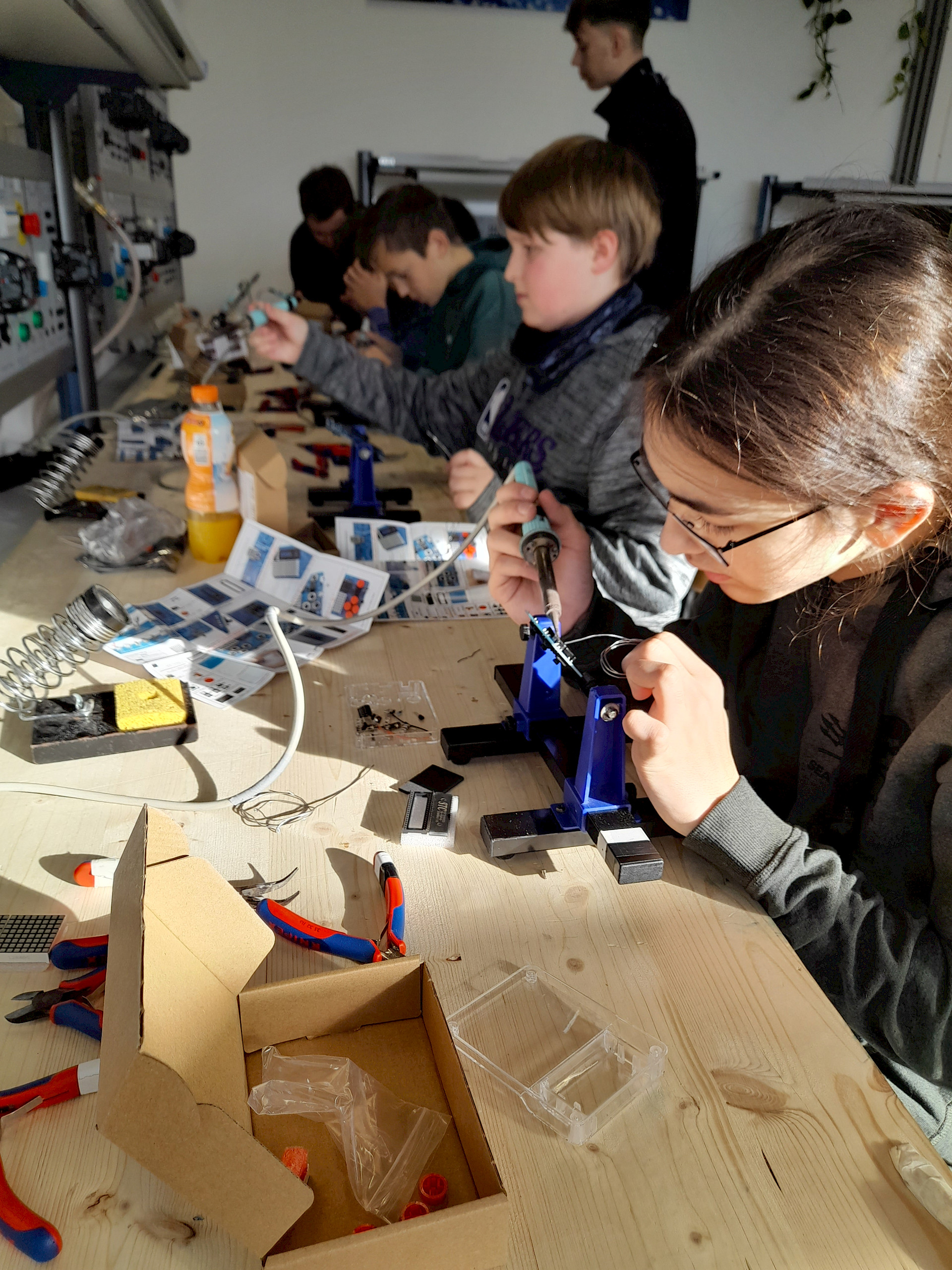 In der ersten Station löteten die Schüler*innen ein elektronisches Tetris-Spiel nach einer Bausatzanleitung. Dabei lernten sie den fachgerechten Umgang mit dem Lötkolben, die Bedeutung sauberer Lötstellen und den Aufbau eines einfachen elektronischen Schaltkreises.