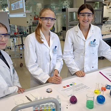 Mit diesem Chemie-Basis-Wissen im Gepäck begann das Abenteuer. Die Schüler*innen fanden sich in einem verschlossenen Labor wieder und ihre einzige Möglichkeit zu entkommen, bestand darin, verschiedene chemische Rätsel zu lösen. So wurden eifrig pH‑Werte und Temperaturen gemessen, Lösungen gemischt und Salze erhitzt. Die dabei erhaltenen Ziffern und Buchstaben führten zu den nächsten Hinweisen, die jedoch erst mit der geeigneten Methode sichtbar gemacht werden mussten. Glücklicherweise gelang es allen Schüler*innen rechtzeitig aus dem Labor zu entkommen und wieder nach Hause zurückzukehren.