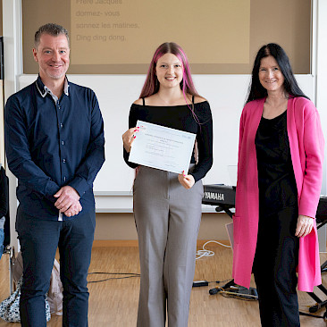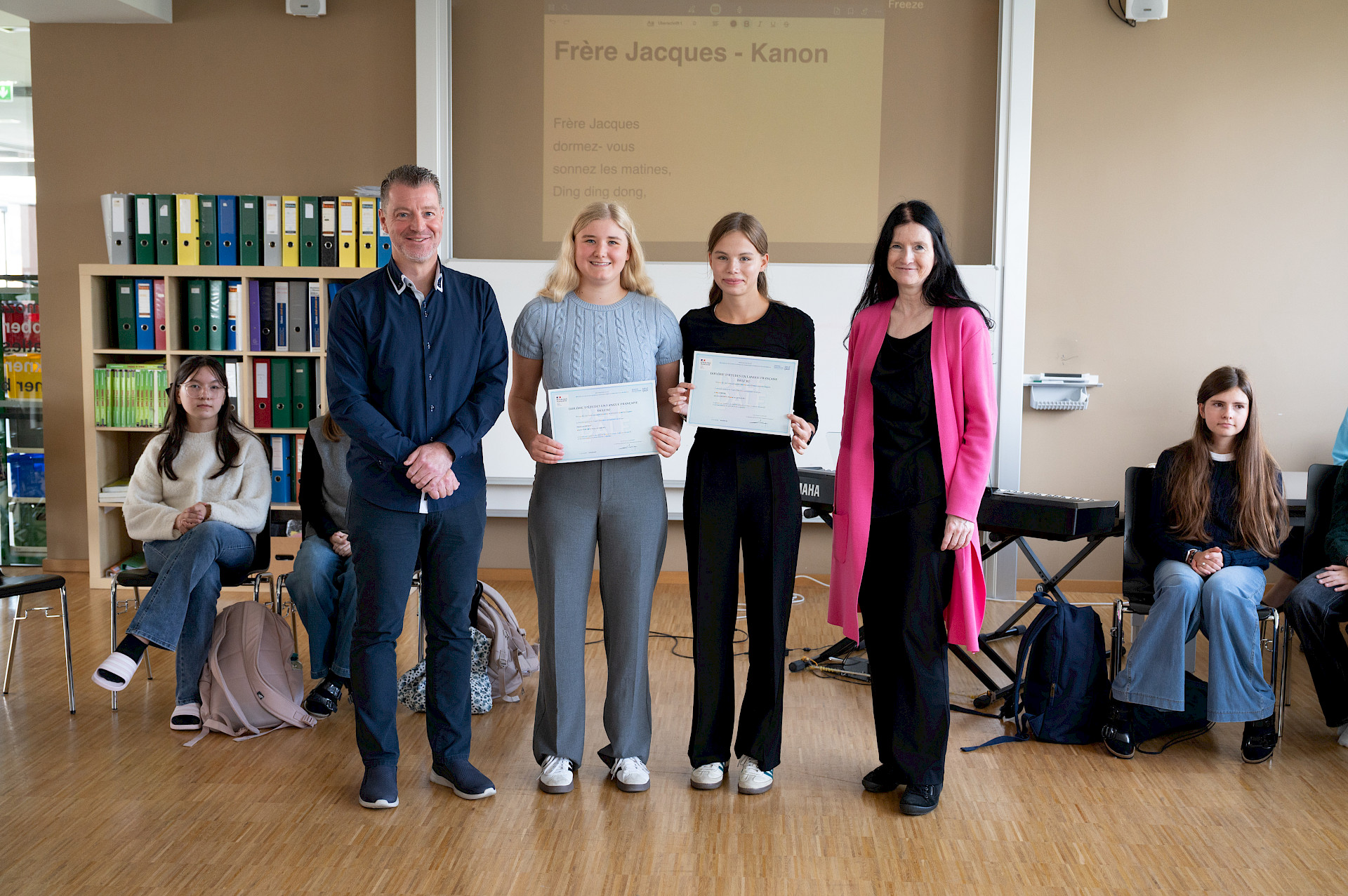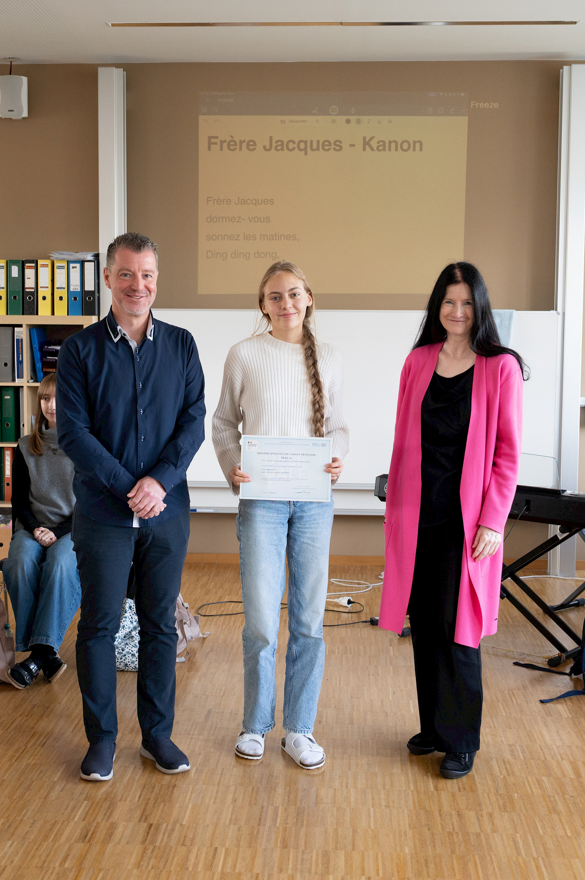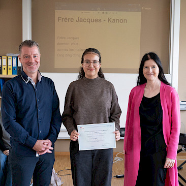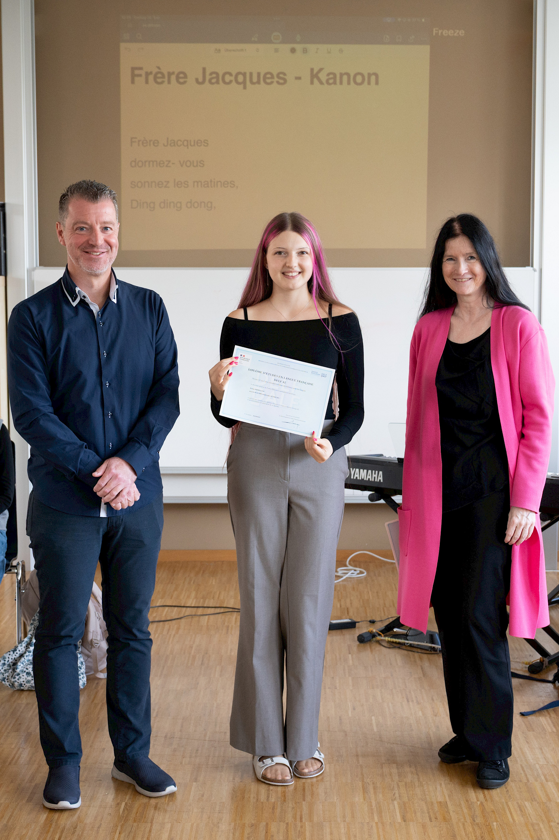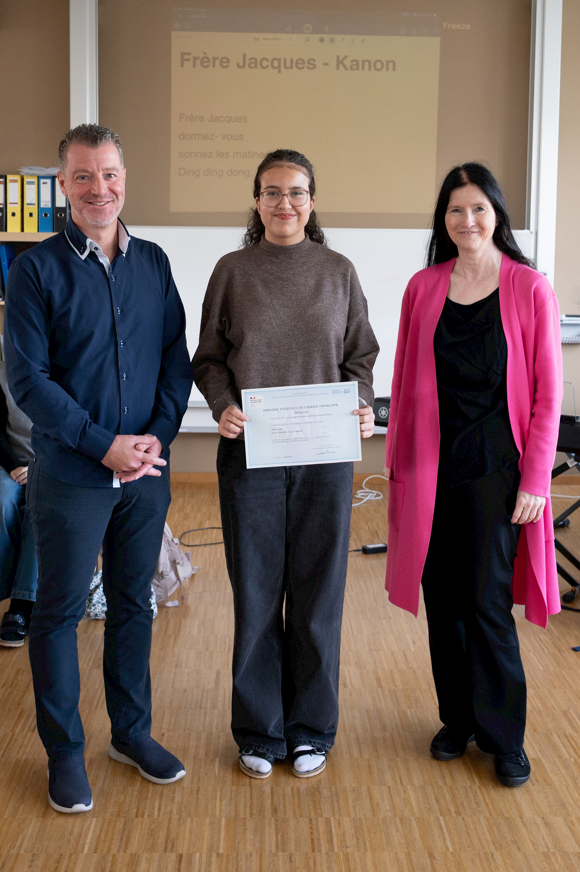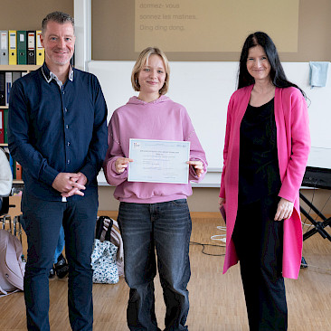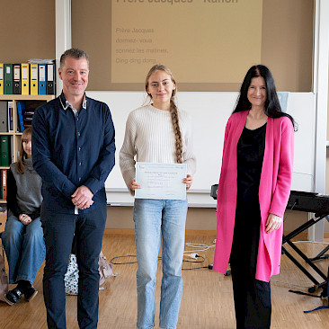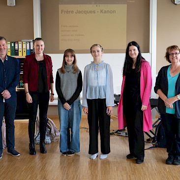 In der sechsten Einheit bildeten die Klassen 3A und 4A in blauen, weißen und roten T-Shirts die französische Flagge auf unserem Campus nach. Bei diesem erfreulichen Anblick ließ sich sogar die Sonne wieder blicken. Danach übersiedelten wir in den Musiksaal, wo die schulinternen Siegerinnen des französischen Vorlesewettbewerbs prämiert und die DELF-Zertifikate des vergangenen Schuljahres von Direktor MMMag. Florian Koblinger feierlich überreicht wurden. Den stimmungsvollen Abschluss bildete der Kanon „Frère Jacques“, den Frau Mag. Brigitte Panic-Unfried mit der 3A einstudiert hatte.
