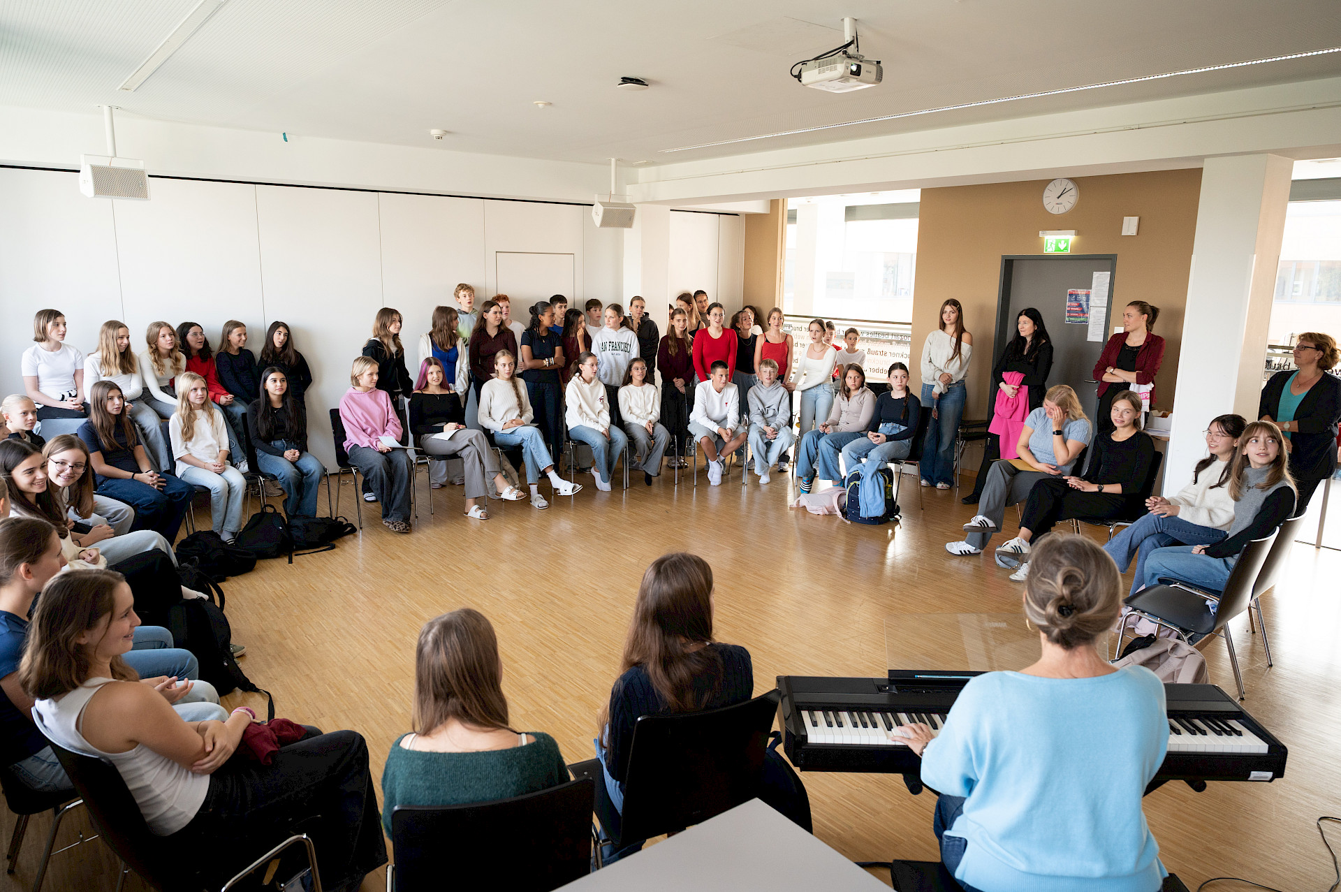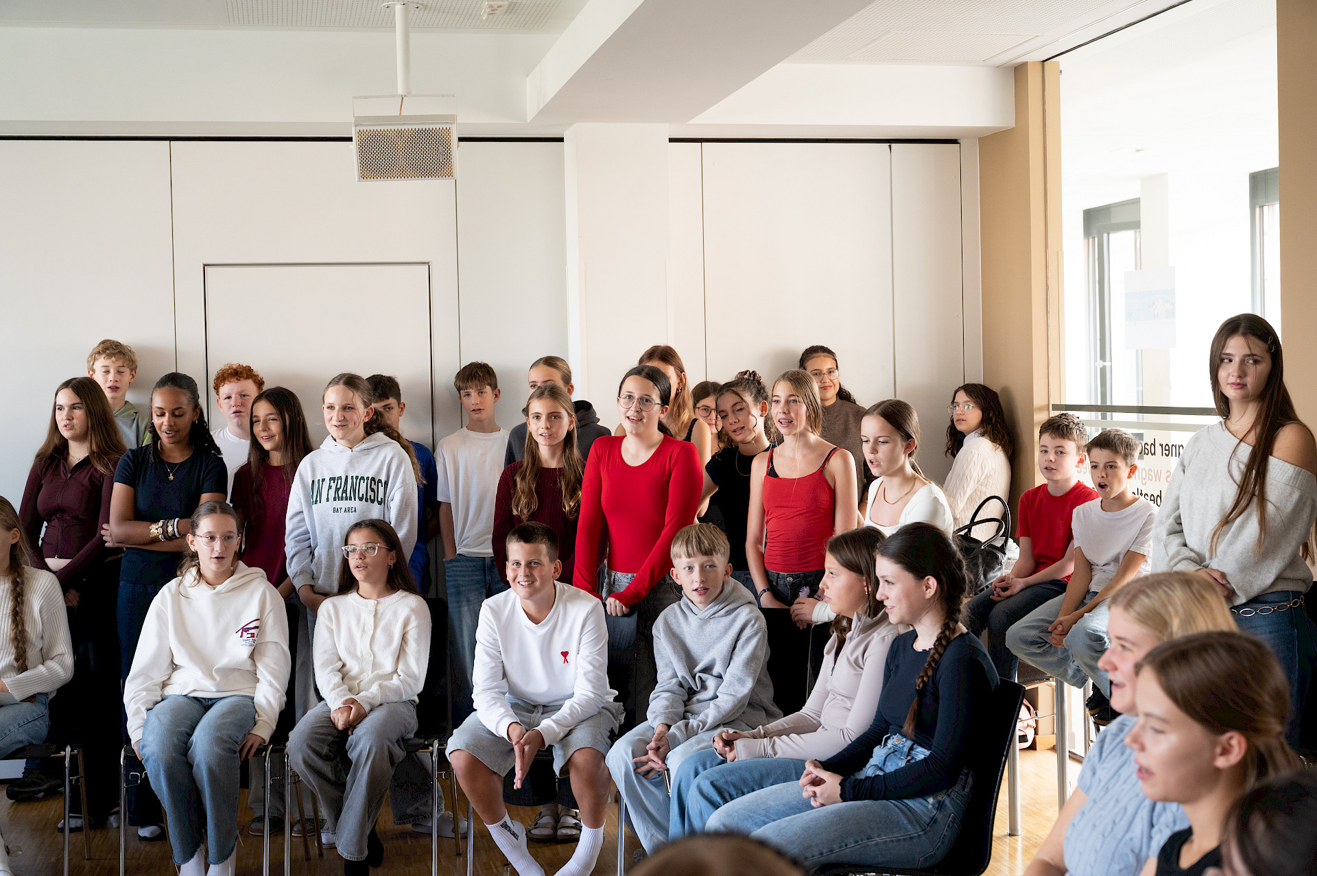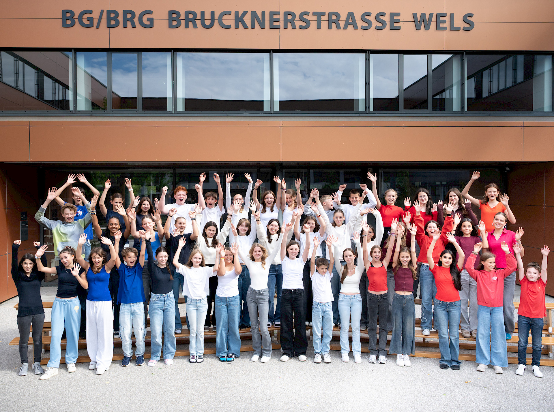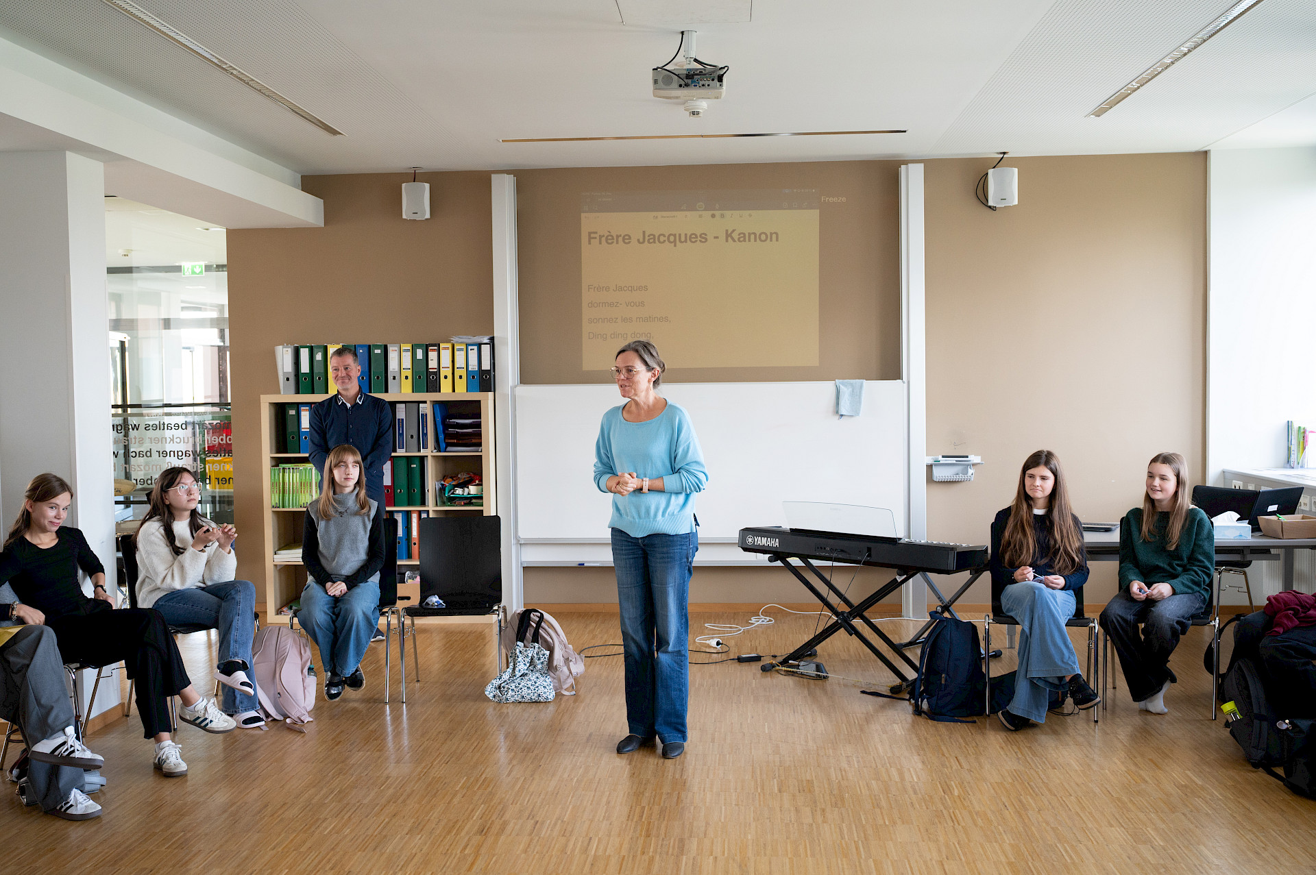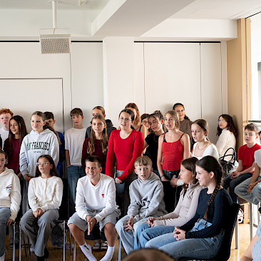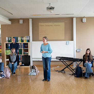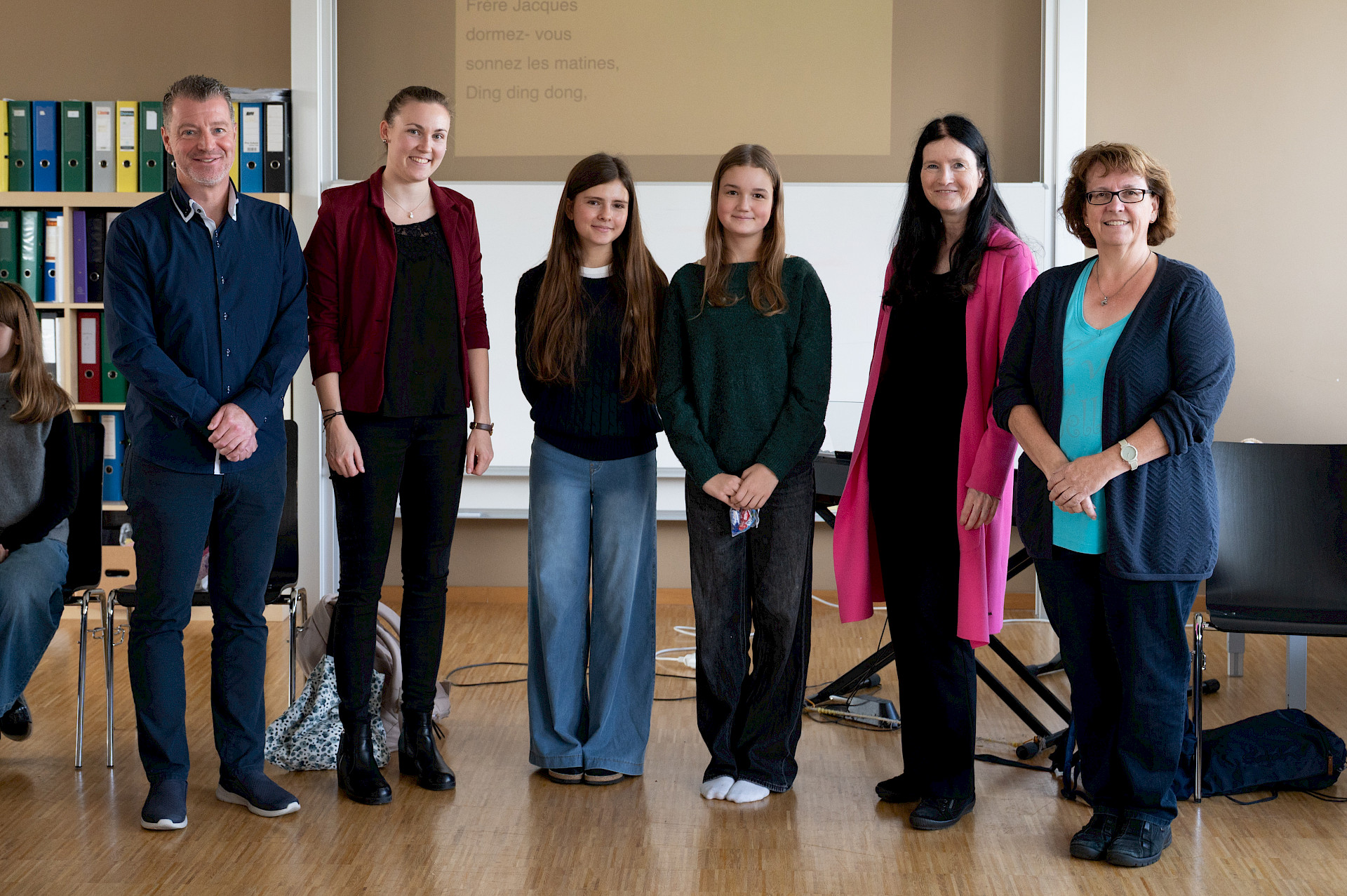 In der sechsten Einheit bildeten die Klassen 3A und 4A in blauen, weißen und roten T-Shirts die französische Flagge auf unserem Campus nach. Bei diesem erfreulichen Anblick ließ sich sogar die Sonne wieder blicken. Danach übersiedelten wir in den Musiksaal, wo die schulinternen Siegerinnen des französischen Vorlesewettbewerbs prämiert und die DELF-Zertifikate des vergangenen Schuljahres von Direktor MMMag. Florian Koblinger feierlich überreicht wurden. Den stimmungsvollen Abschluss bildete der Kanon „Frère Jacques“, den Frau Mag. Brigitte Panic-Unfried mit der 3A einstudiert hatte.