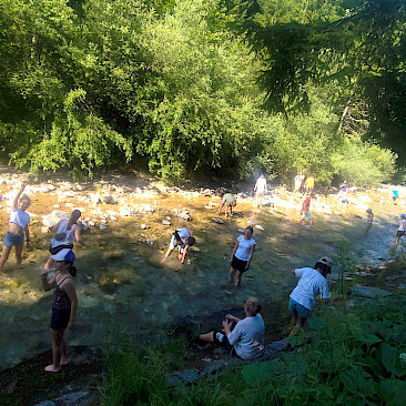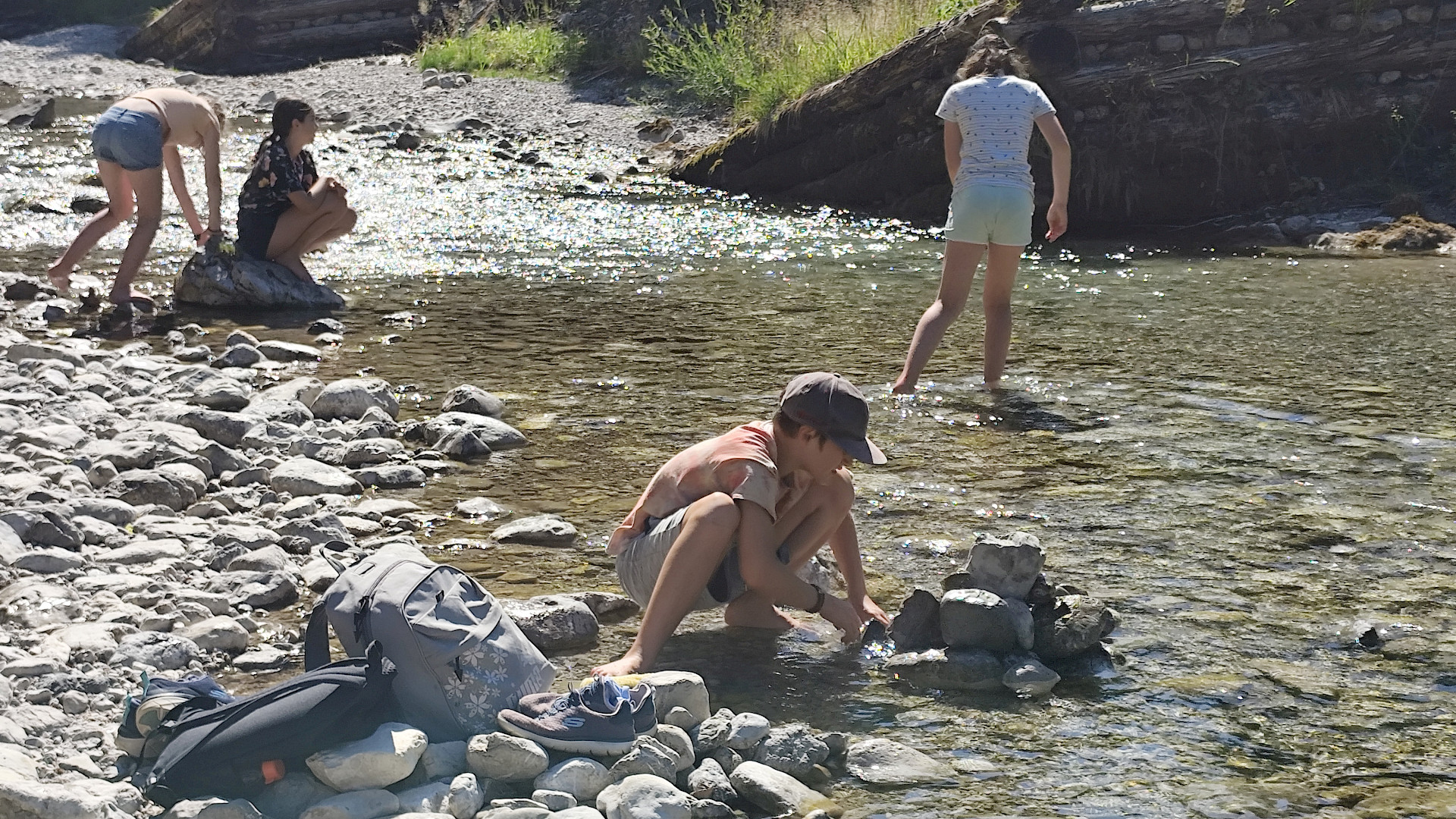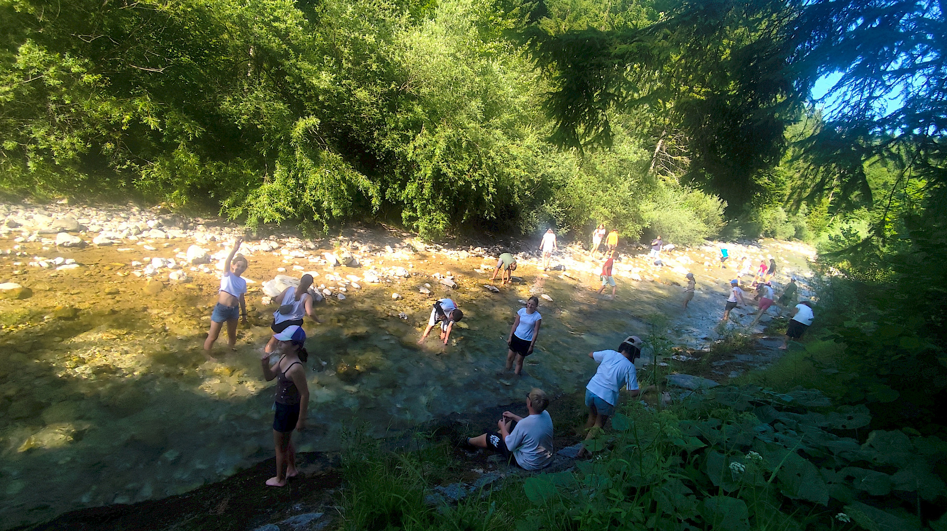Auf der Wanderung zurück zum Bahnhof genossen alle die Landschaft und es wurden im Schindlbach abgekühlt, „Stoamandl“ und Dämme gebaut – herrlich.