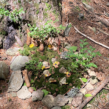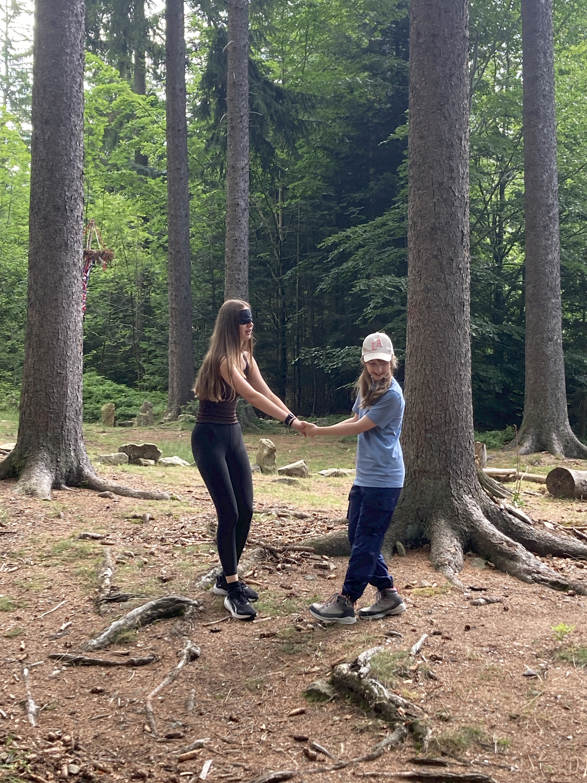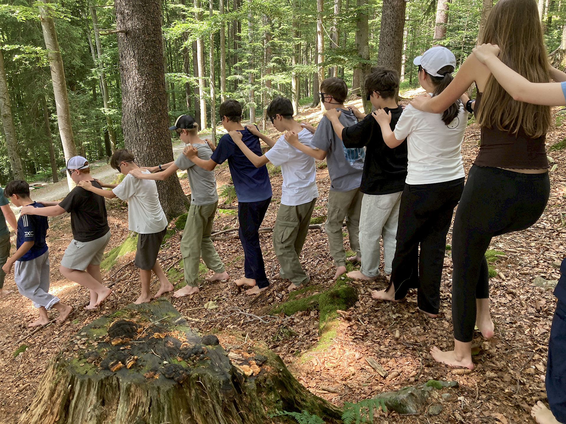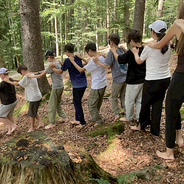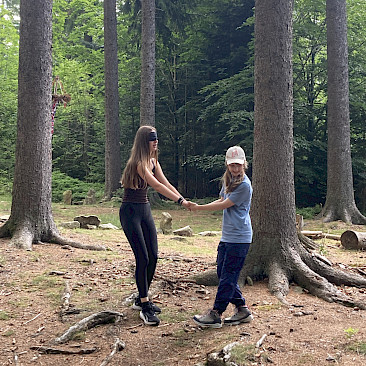Der Wald wurde dabei mit allen Sinnen erlebt: Wir lauschten den Geräuschen der Natur, erfühlten Materialien des Waldes und gestalteten daraus kleine Kunstwerke. Diese kreative Arbeit stärkte nicht nur unsere Wahrnehmung, sondern auch das Gemeinschaftsgefühl der Klasse. Nach dem Mittagessen wartete ein abwechslungsreiches Nachmittagsprogramm: Gemeinsam bauten wir eine Kugelbahn aus Naturmaterialien und stellten uns einer besonderen Herausforderung – barfuß und mit verbundenen Augen einem Seil durch den Wald zu folgen. Für manche war das eine große Überwindung, für alle aber ein spannendes Erlebnis. Ein Highlight des Tages war das Spiel „Wo ist der Waldvogel?“, eine abgewandelte Form des bekannten „Hase läuft über das Feld“. Mit viel Lachen und Bewegung verging der erste Tag wie im Flug. Am Abend stand die Gemeinschaft erneut im Mittelpunkt: Ob bei Gesellschaftsspielen, einem lockeren Volleyballspiel oder einem Spaziergang über das Gelände – die Kinder konnten die Ruhe und die besondere Atmosphäre des Böhmerwaldes genießen.