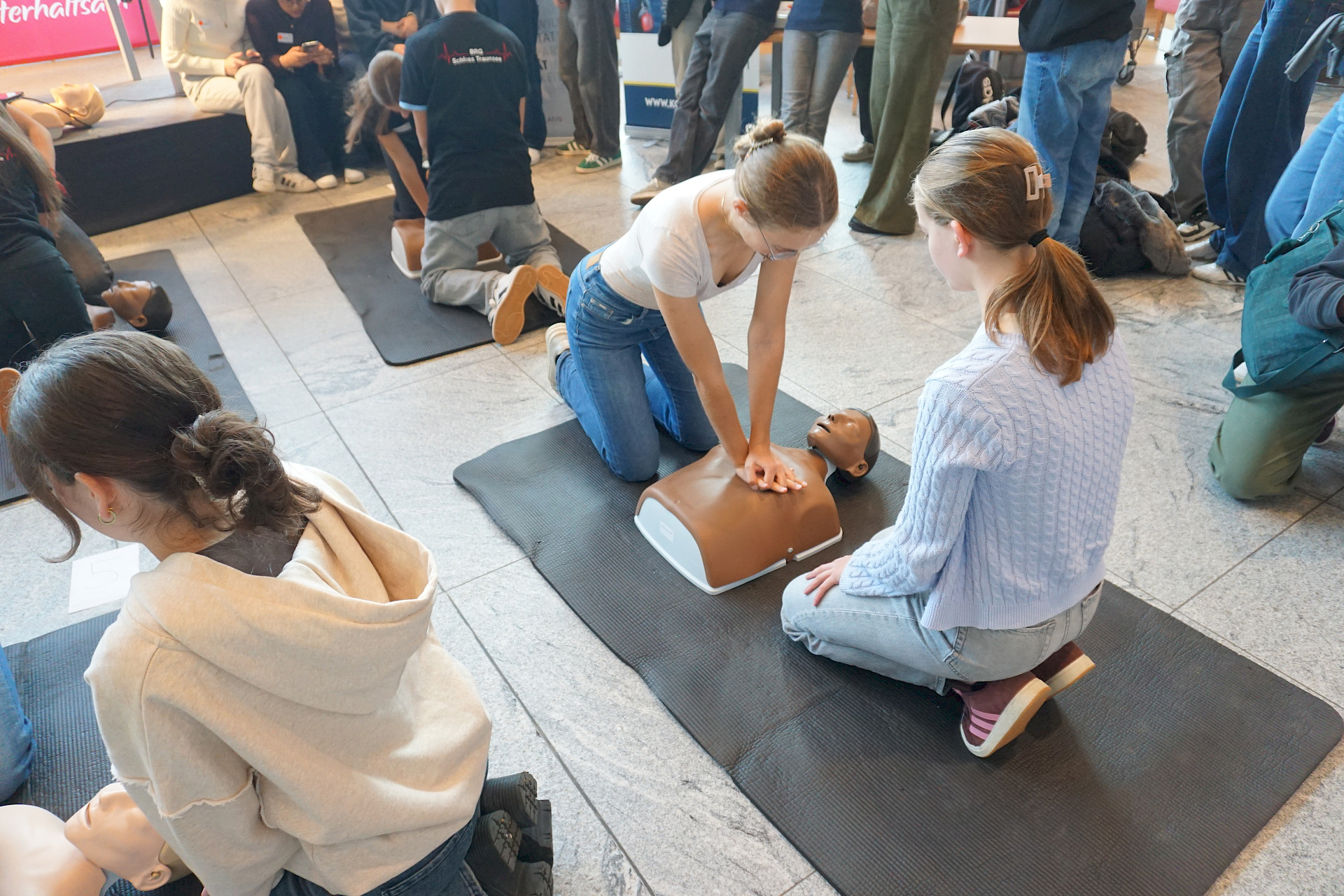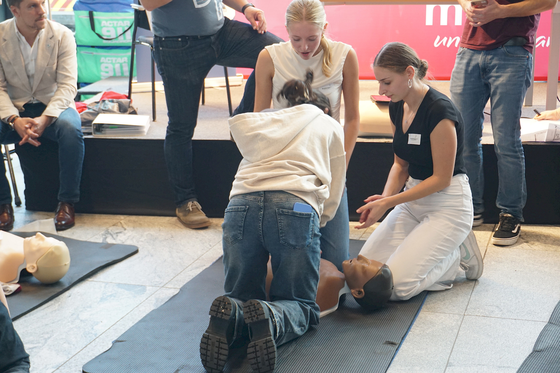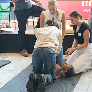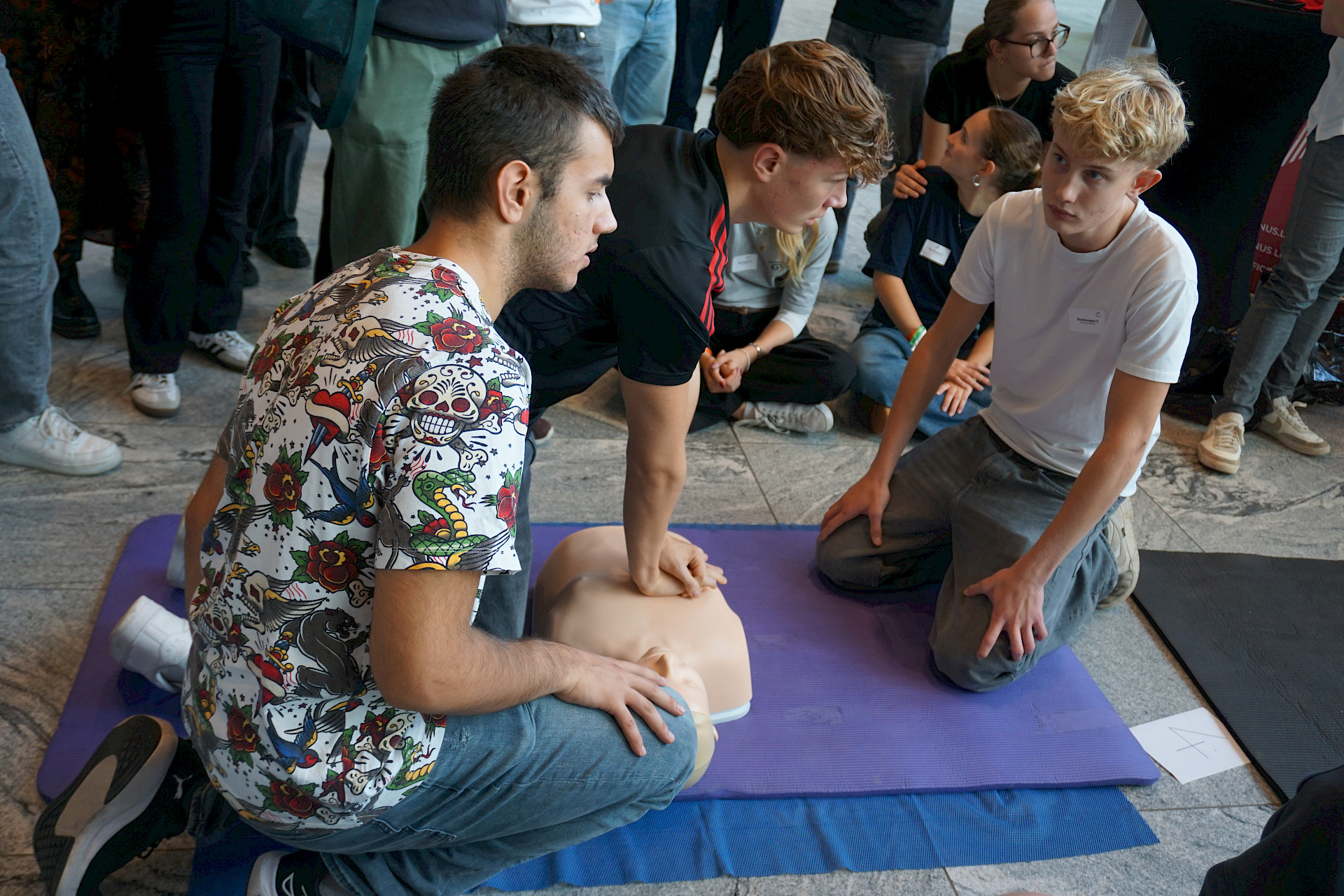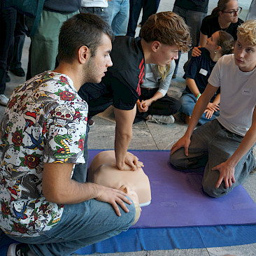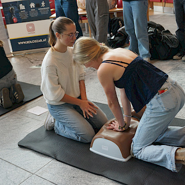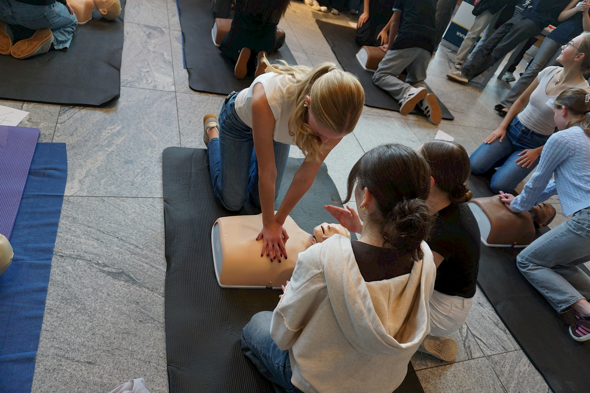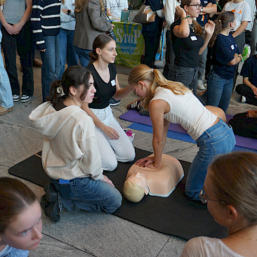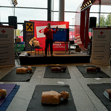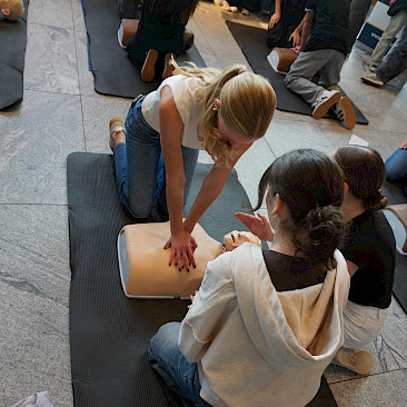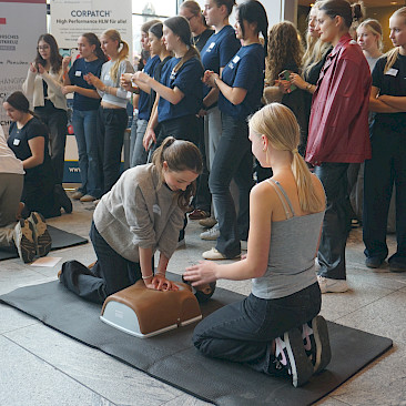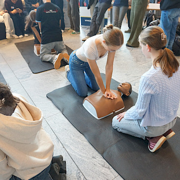 Eingeladen waren alle Schulen des Landes, und die Halle war erfüllt von Spannung, Motivation und dem charakteristischen „Drücken im Takt“. In 2er- bzw. 3er-Teams traten die Teilnehmer*innen an Übungspuppen an, deren Leistung in Echtzeit auf Bildschirmen ausgewertet wurde. Bewertet wurden unter anderem Drucktiefe, Rhythmus und Effektivität der Herzdruckmassage – ganz wie im echten Leben, nur mit viel Jubel und Anfeuerung rundherum!