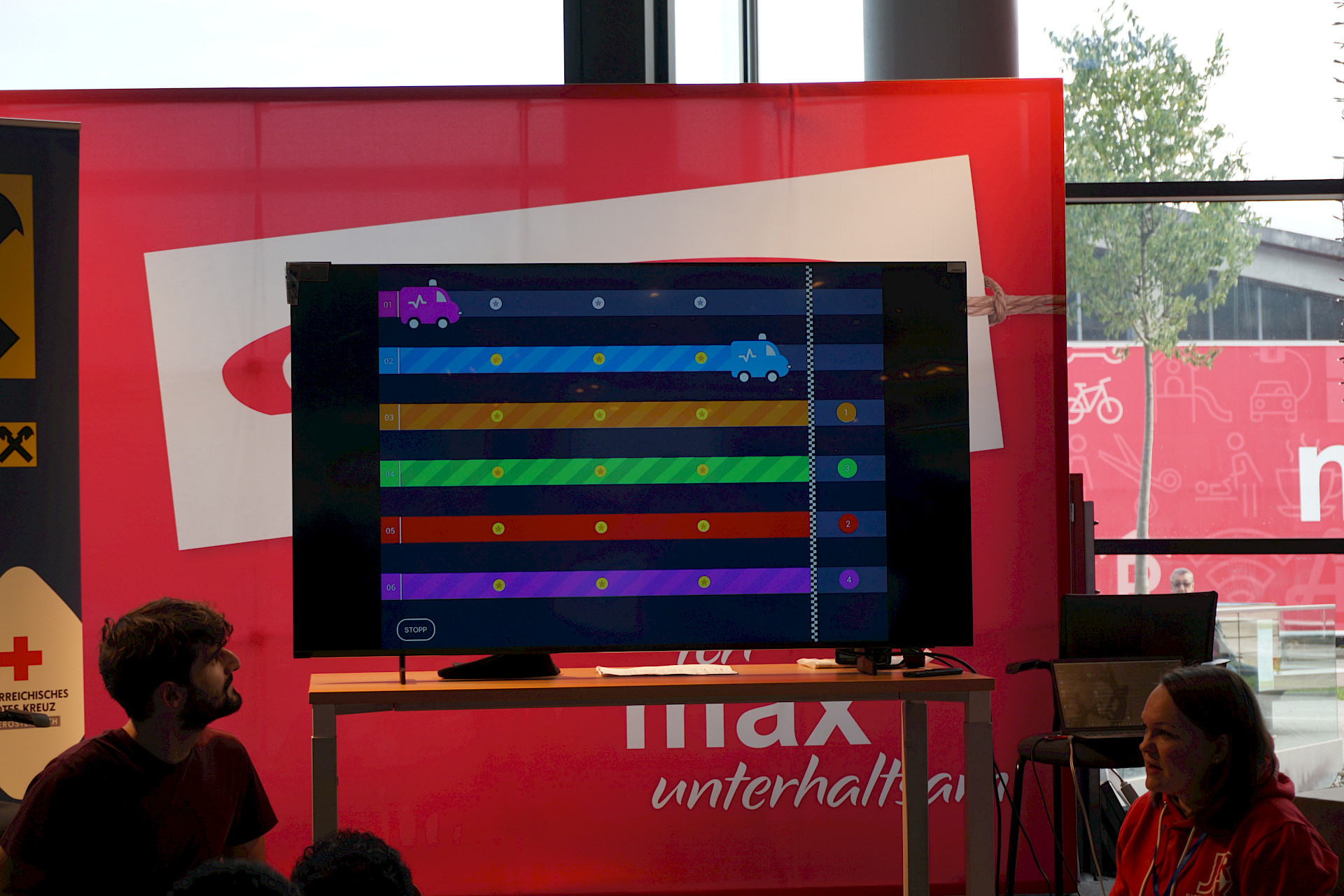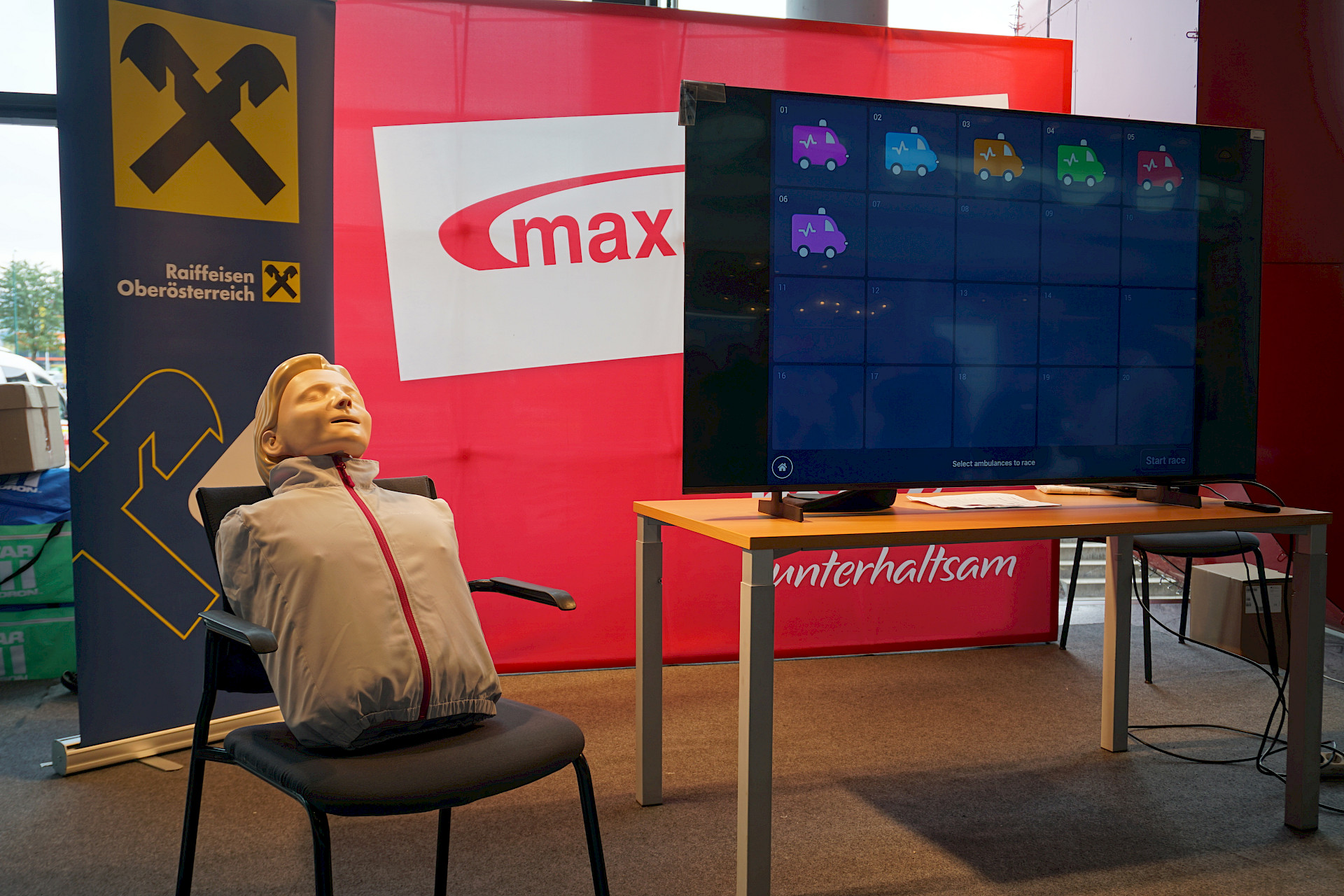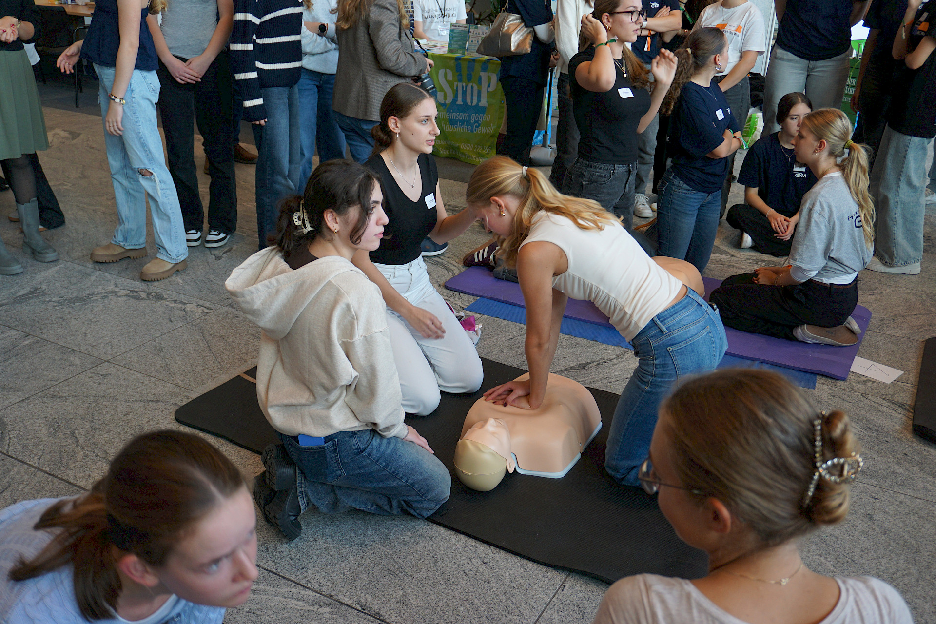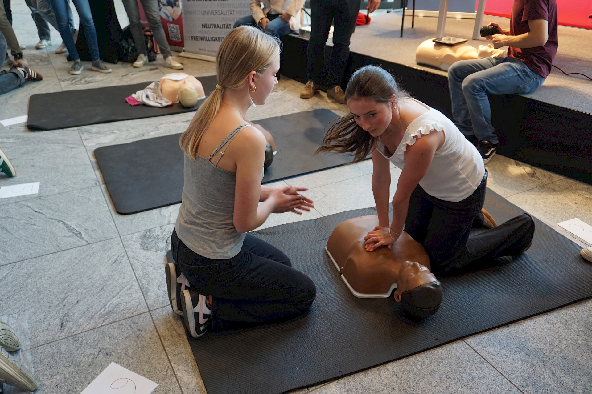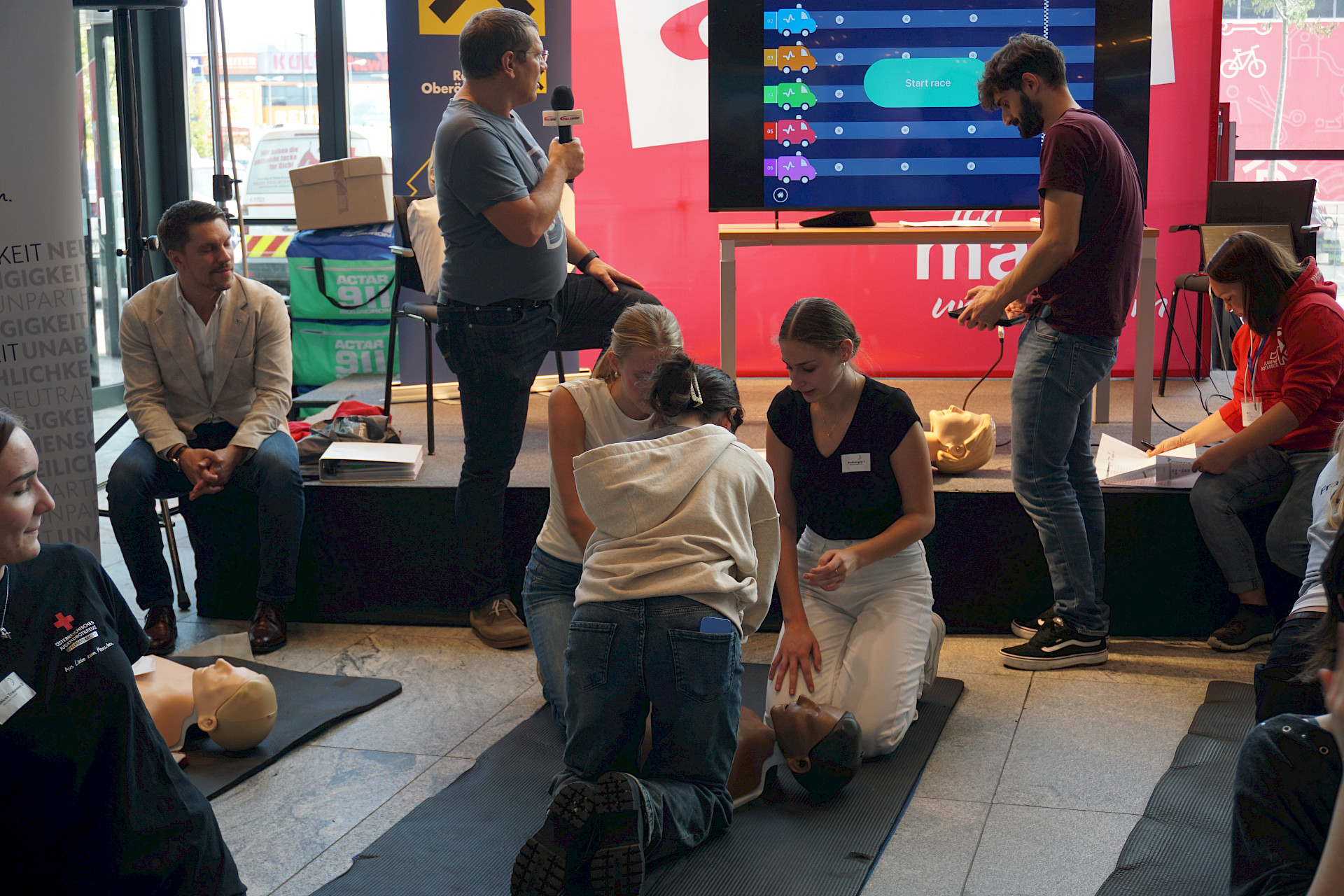 Eingeladen waren alle Schulen des Landes, und die Halle war erfüllt von Spannung, Motivation und dem charakteristischen „Drücken im Takt“. In 2er- bzw. 3er-Teams traten die Teilnehmer*innen an Übungspuppen an, deren Leistung in Echtzeit auf Bildschirmen ausgewertet wurde. Bewertet wurden unter anderem Drucktiefe, Rhythmus und Effektivität der Herzdruckmassage – ganz wie im echten Leben, nur mit viel Jubel und Anfeuerung rundherum!