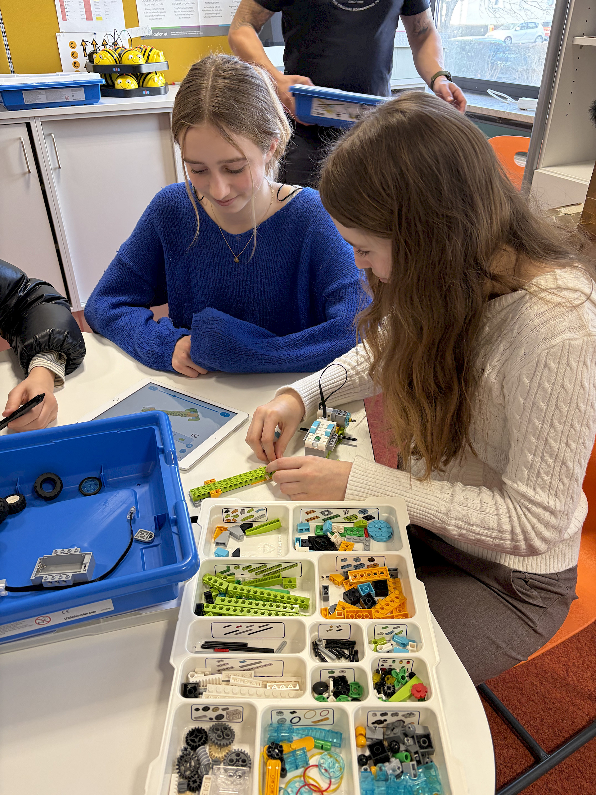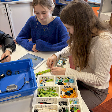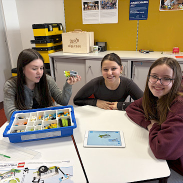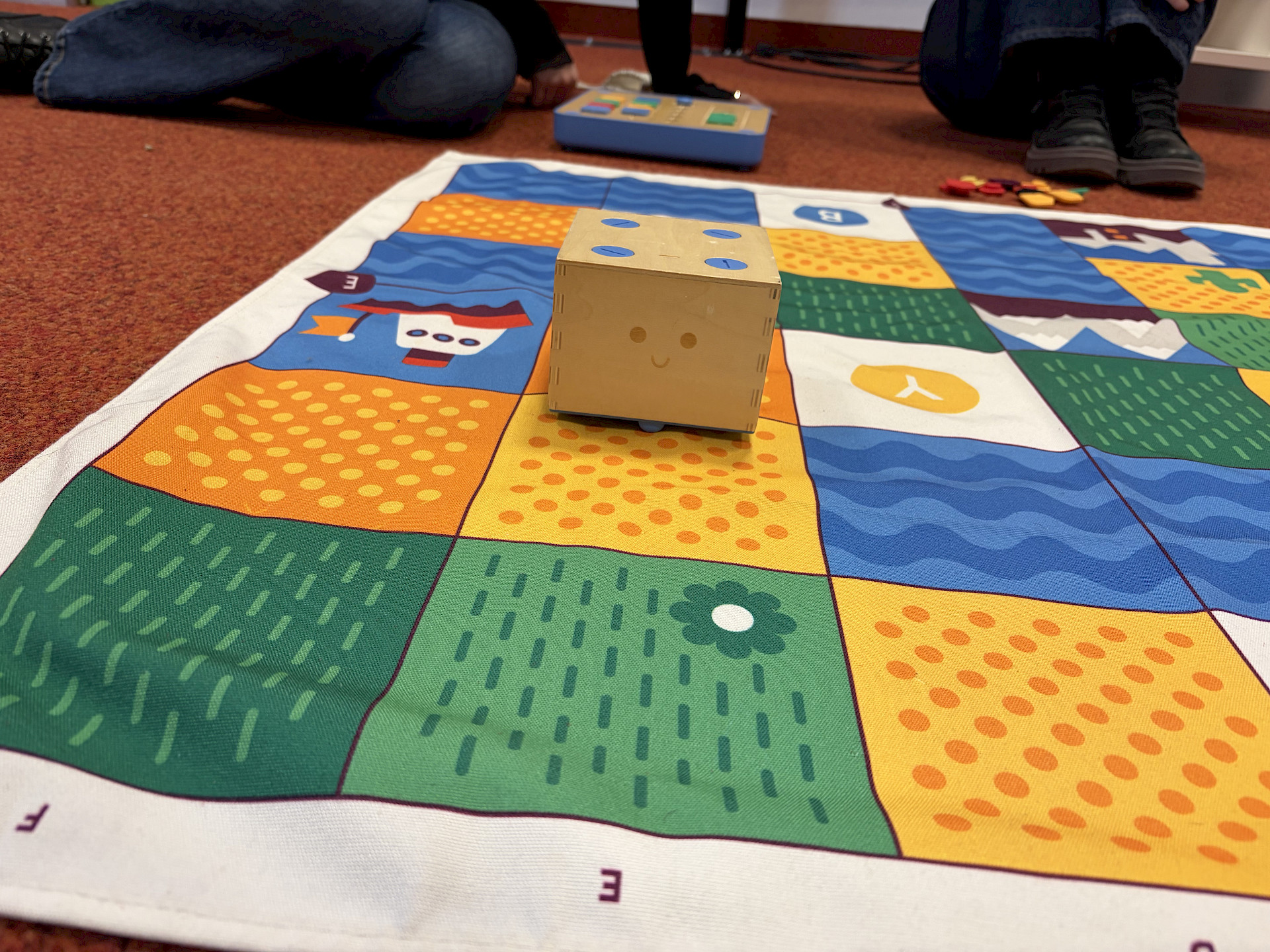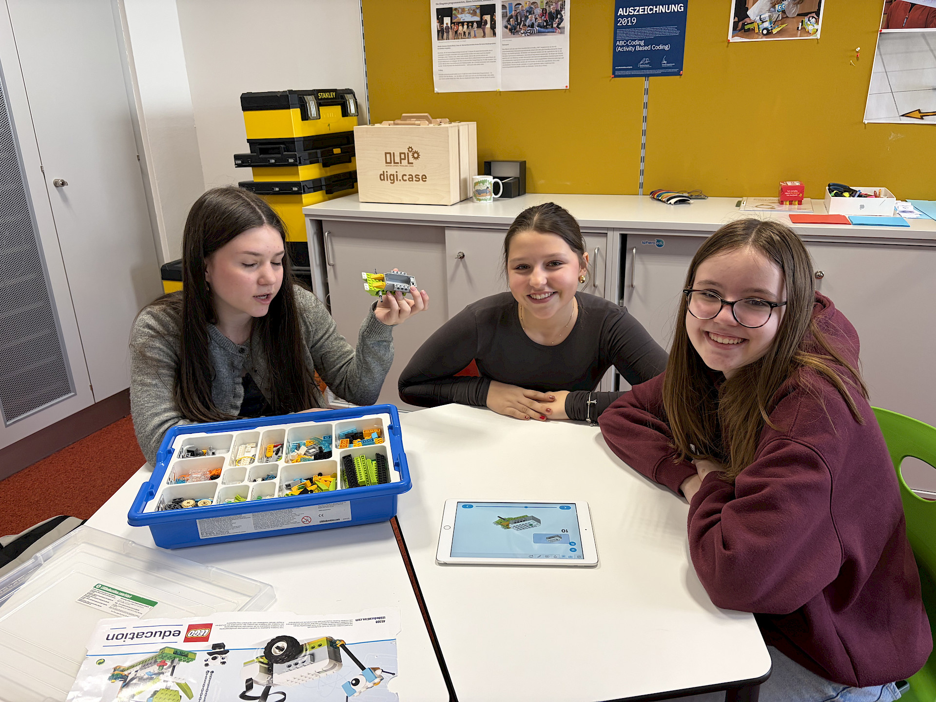Besonders großen Spaß hatten die Schüler*innen beim Programmieren der Bee Bots. Mit diesen einfach zu bedienenden Robotern gelang der Einstieg in die Welt des Codings spielerisch und anschaulich. Um den Perspektivenwechsel gut zu verstehen, programmierten sie die Bee Bots in einer kleinen Land- bzw. Stadtumgebung auf einem Spieleteppich und mussten dabei genau überlegen, welche Befehle notwendig sind, um das gewünschte Ziel zu erreichen. Anschließend wurden Legoautos gebaut und mit Lego Education Sets programmiert. Hier wurde nicht nur getüftelt, sondern auch geforscht: Wie wird mein Auto schneller? Welche Soundeffekte kann ich einsetzen? Welche Faktoren beeinflussen die Bewegung? Ganz nebenbei wurden physikalische Hintergründe erforscht und ausprobiert. Natürlich durfte auch ein kreative „Pimp up“ mit zusätzlichen Legosteinen nicht fehlen – Technik und Gestaltung gingen Hand in Hand.