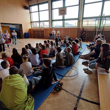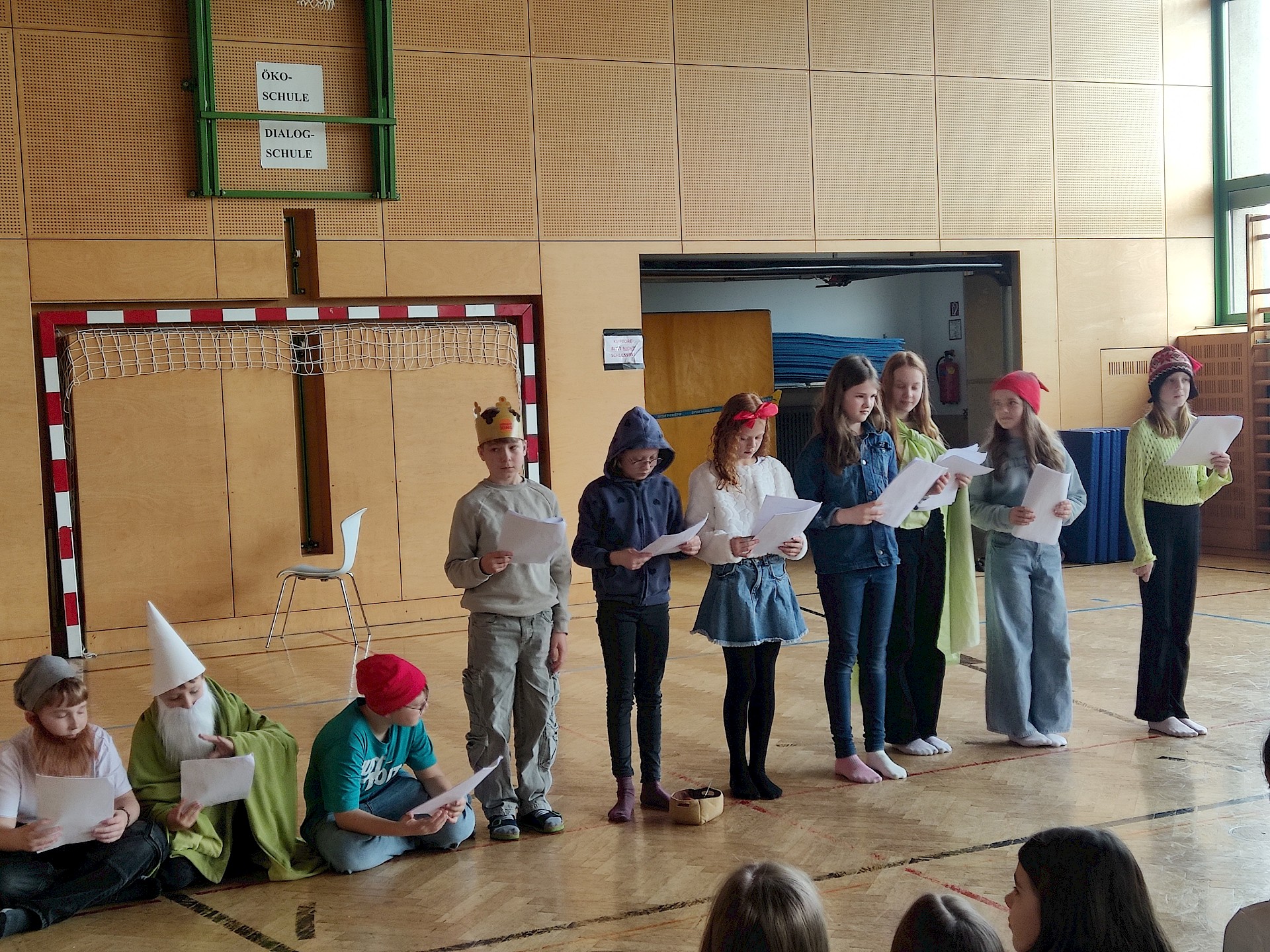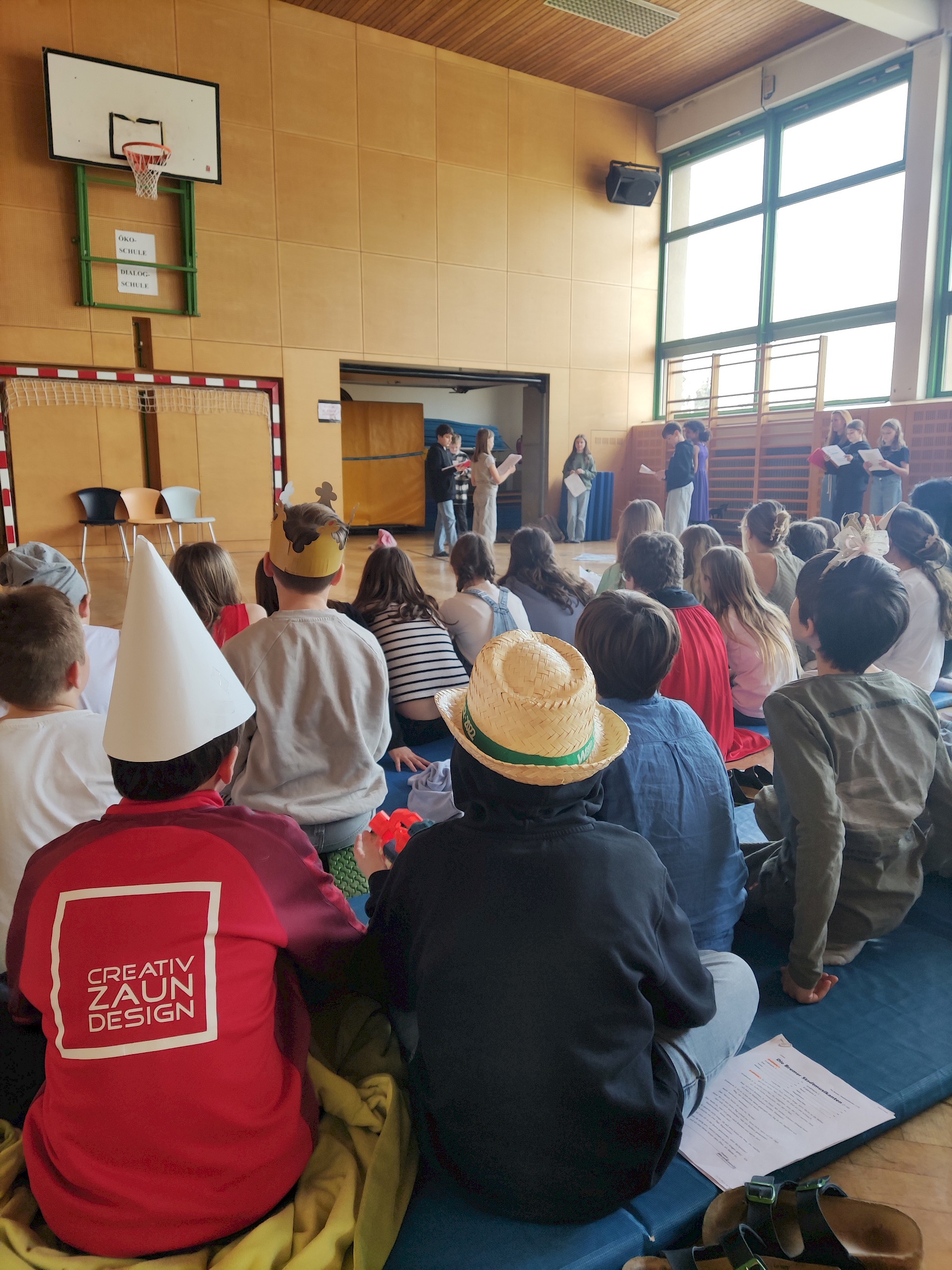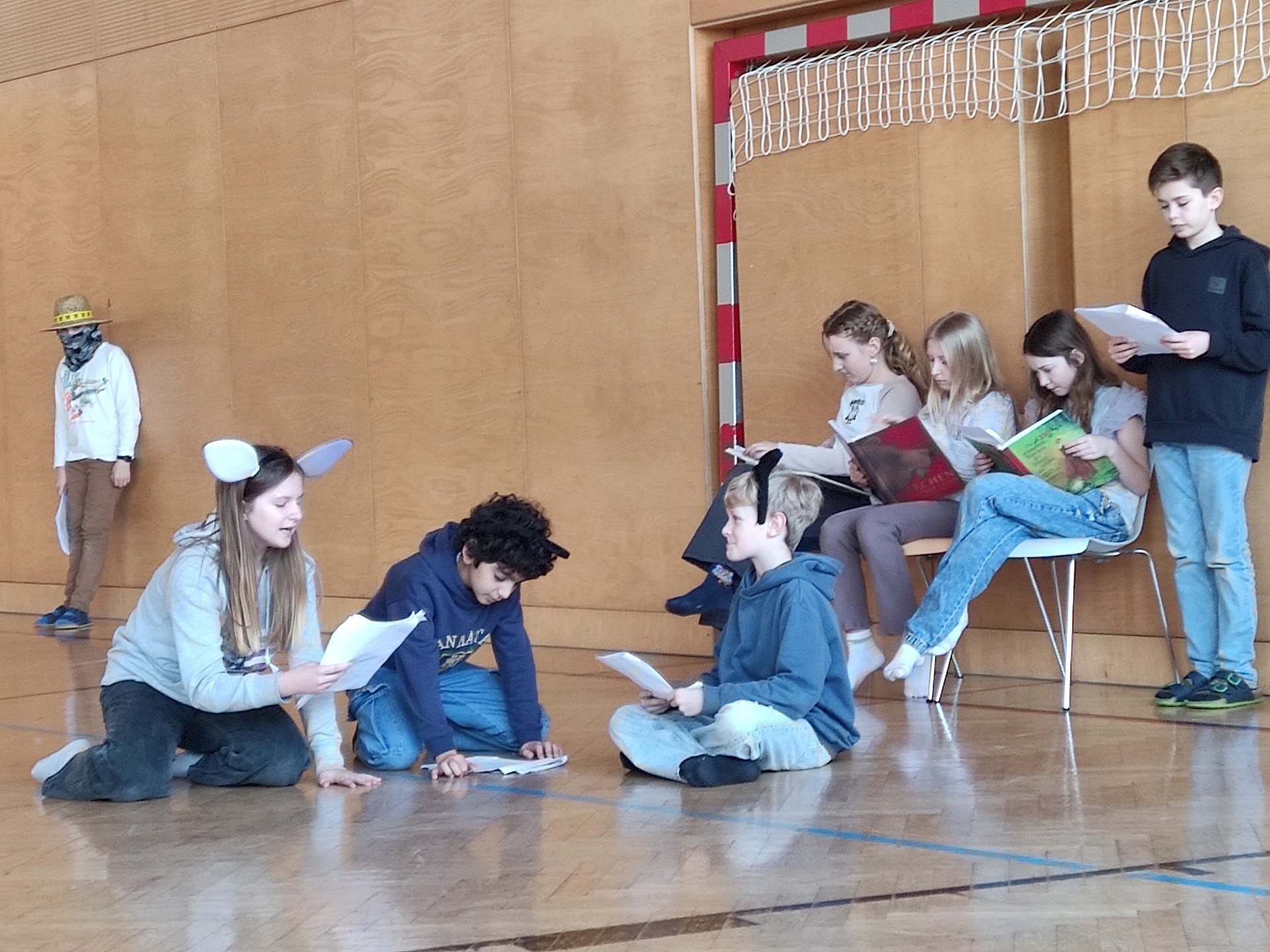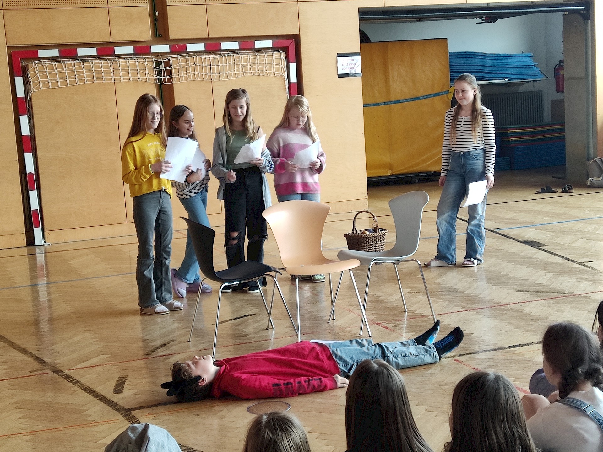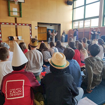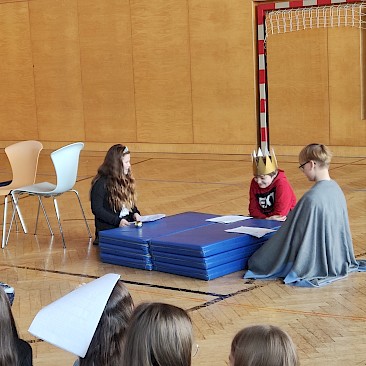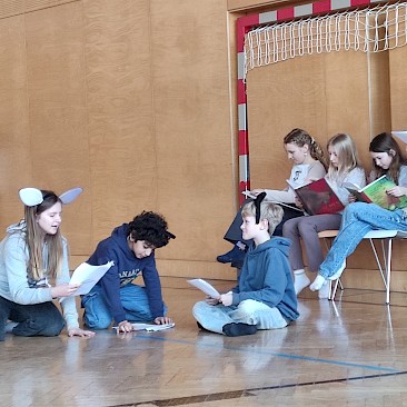 Am Vorlesetag selbst beteiligten sich aktiv drei Klassen (1A, 1B, 1D) mit ihren Deutschlehr*innen. Zwei Unterrichtsstunden lang trafen sich die Klassen im Turnsaal und spielten sich gegenseitig zuvor einstudierte „Lesetheater“ zum Thema „Märchen“ vor. Dabei inszenierten die Gruppen Märchen wie bei einem Theaterstück - der Text selbst musste allerdings nicht auswendig gelernt werden, sondern konnte vorgelesen werden. Mit viel Eifer und großem Engagement wurden die Stücke mit Kulissen und Kostümen aufgepeppt.