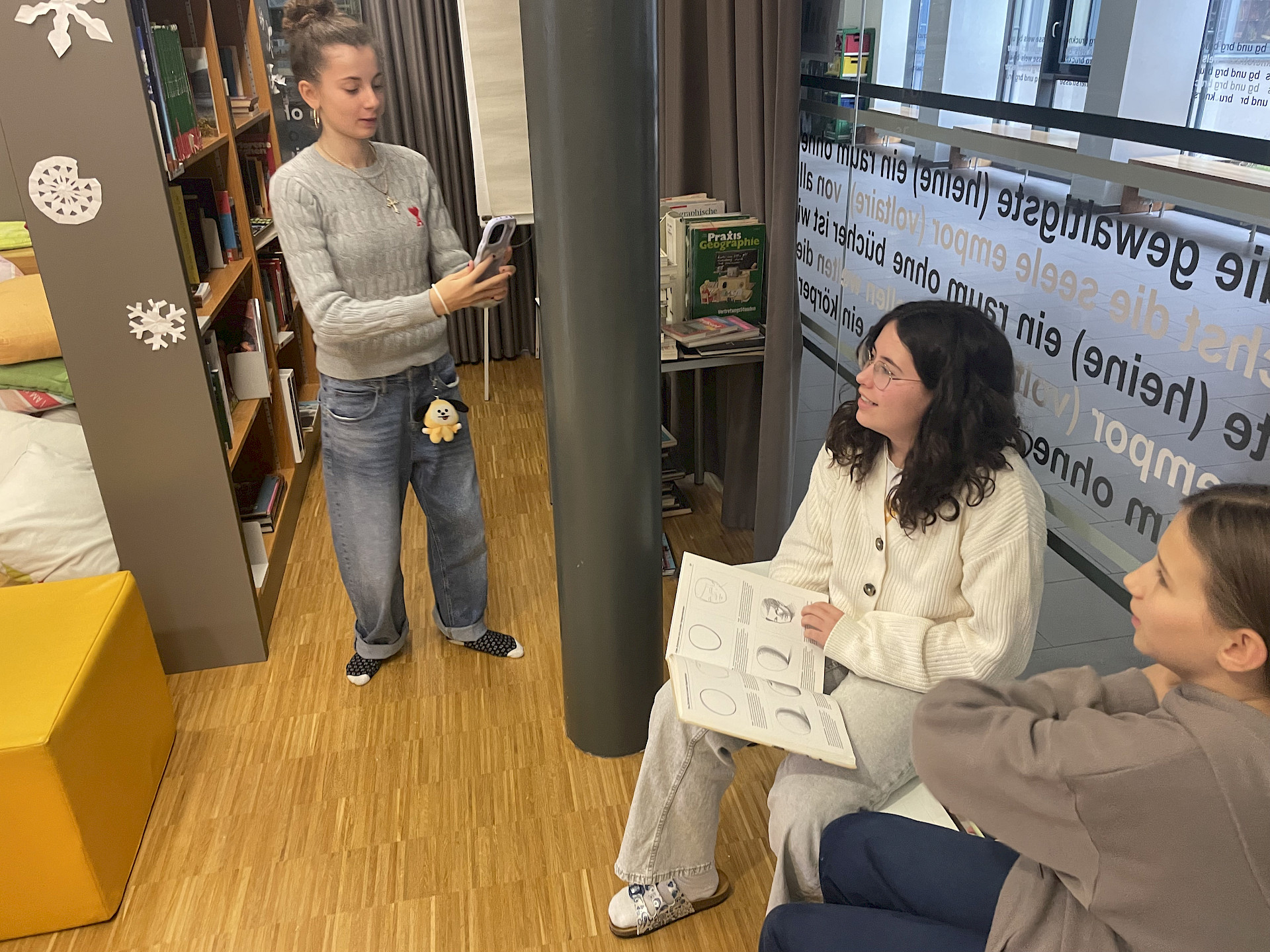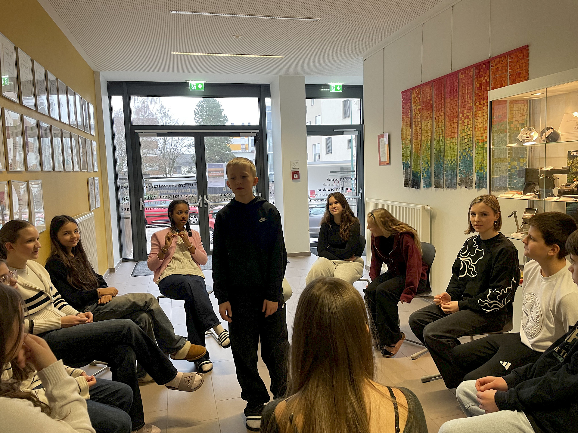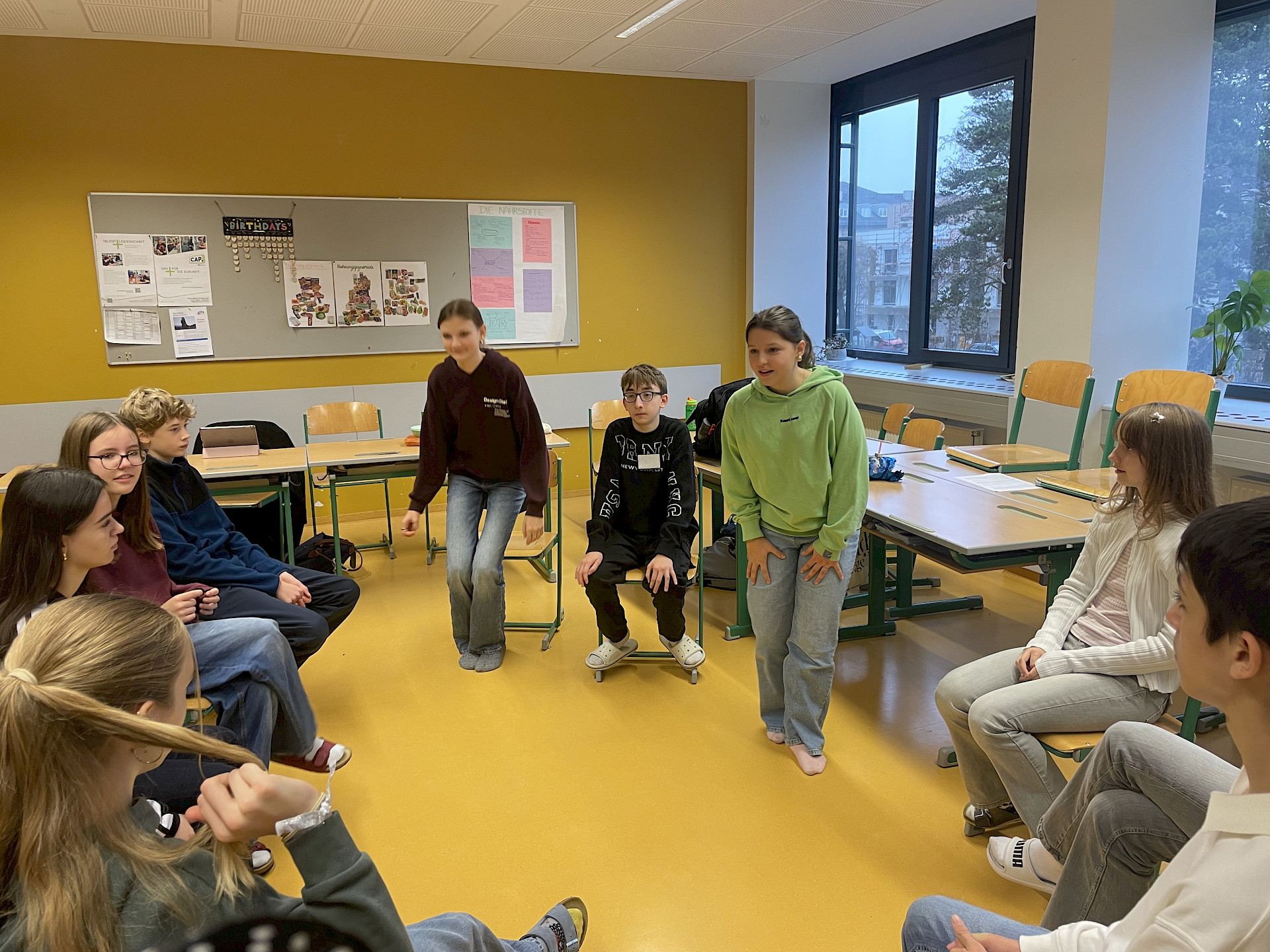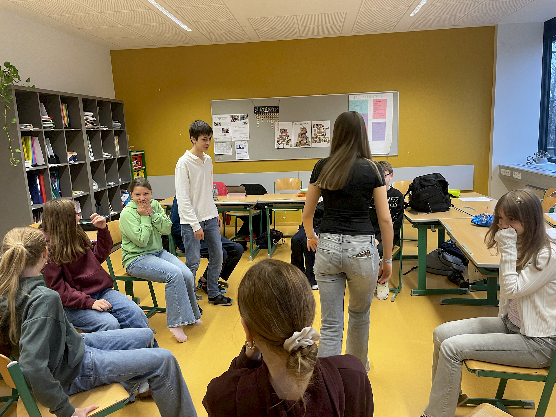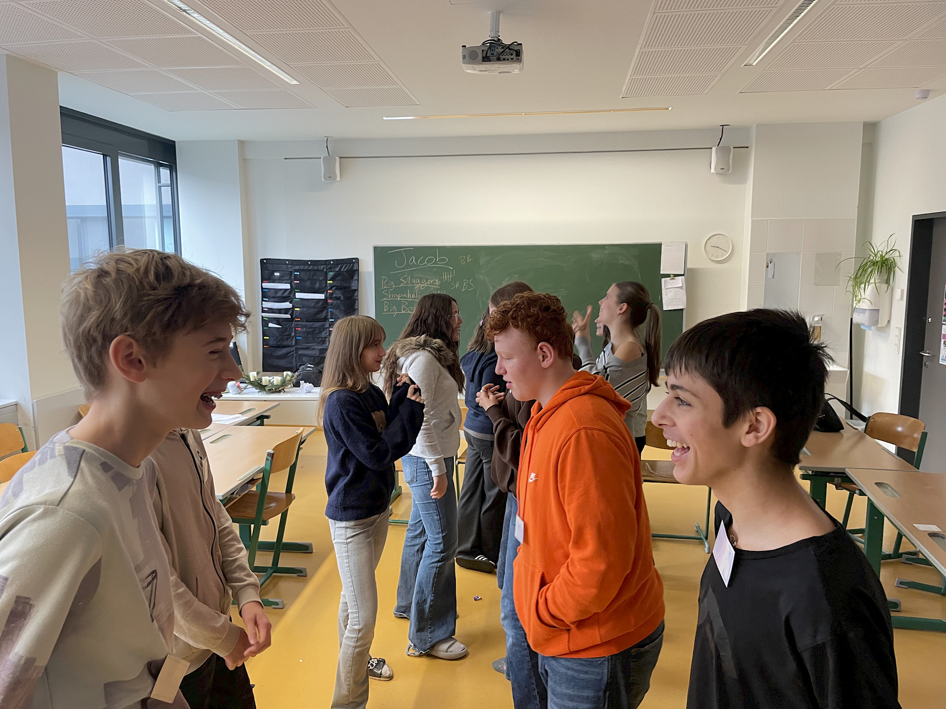 Unter der Anleitung von Siofra (aus Irland) und Jacob (aus den USA) hieß es täglich sechs Einheiten lang “English only“ und die Schüler/innen bekamen pro Workshop-Tag eine Aufgabe gestellt: zum einen hatten sie einen Werbespot (3A) bzw. einen Kurzfilm (4A) zu drehen, zum anderen ein Theaterstück zu einem selbstgewählten Thema zu schreiben, einzustudieren und aufzuführen. Mit verschiedenen Übungen aus der Theaterpädagogik bereiteten die zwei Natives die Schüler*innen auf ihre Rollen und Aufgaben vor und unterstützten sie beim Verfassen von Skripts und Drehbüchern sowie beim Umsetzen ihrer Ideen.