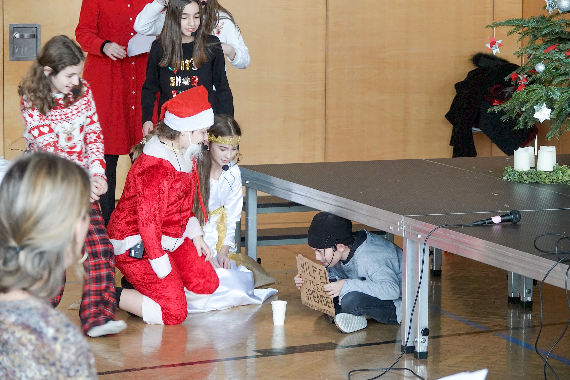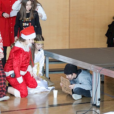 „Wahrheit oder Pflicht?“ – „Pflicht!“ – „Dann…musst du den Weihnachtsmann anrufen!“ Zum Glück findet sich die Telefonnummer im allwissenden Internet. Der Weihnachtsmann freut sich über den Anruf, sind doch seine Elfen auf Urlaub, weil er vergessen hat, eine Urlaubssperre zu verhängen. Er ist ja nicht mehr der Allerjüngste…Hocherfreut, dass ihm die Kinder helfen wollen, kommt er in den Turnsaal in der Brucknerstraße 16. Aber halt – da ist ja schon jemand: Das Christkind hat den Anruf mitgehört und ist mindestens genauso gestresst wie Father Christmas. „Wem sollen wir jetzt helfen?“ fragen die Kinder. Die Lösung liegt auf der Hand: ein Battle! Weihnachtsmann gegen Christkind! Während der Weihnachtsmann den Tanzbewerb klar für sich entscheidet, punktet das Christkind bei der Quizshow: Das berühmteste Weihnachtslied ist natürlich nicht „Last Christmas“, sondern „Stille Nacht“. Das weiß doch jedes (Christ-)Kind. „Dann helfen wir eben beiden.“ Und so bekommt auch noch der Obdachlose unter der Brücke rechtzeitig sein Weihnachtsgeschenk.