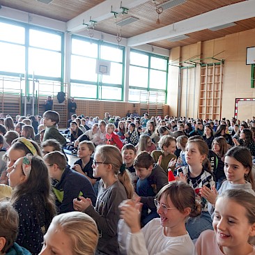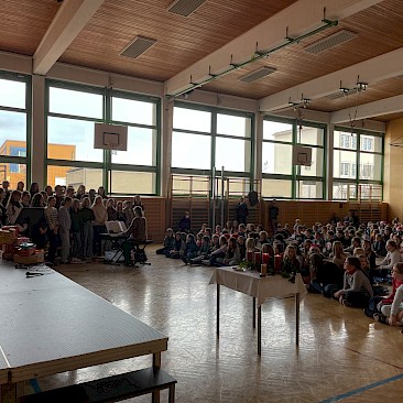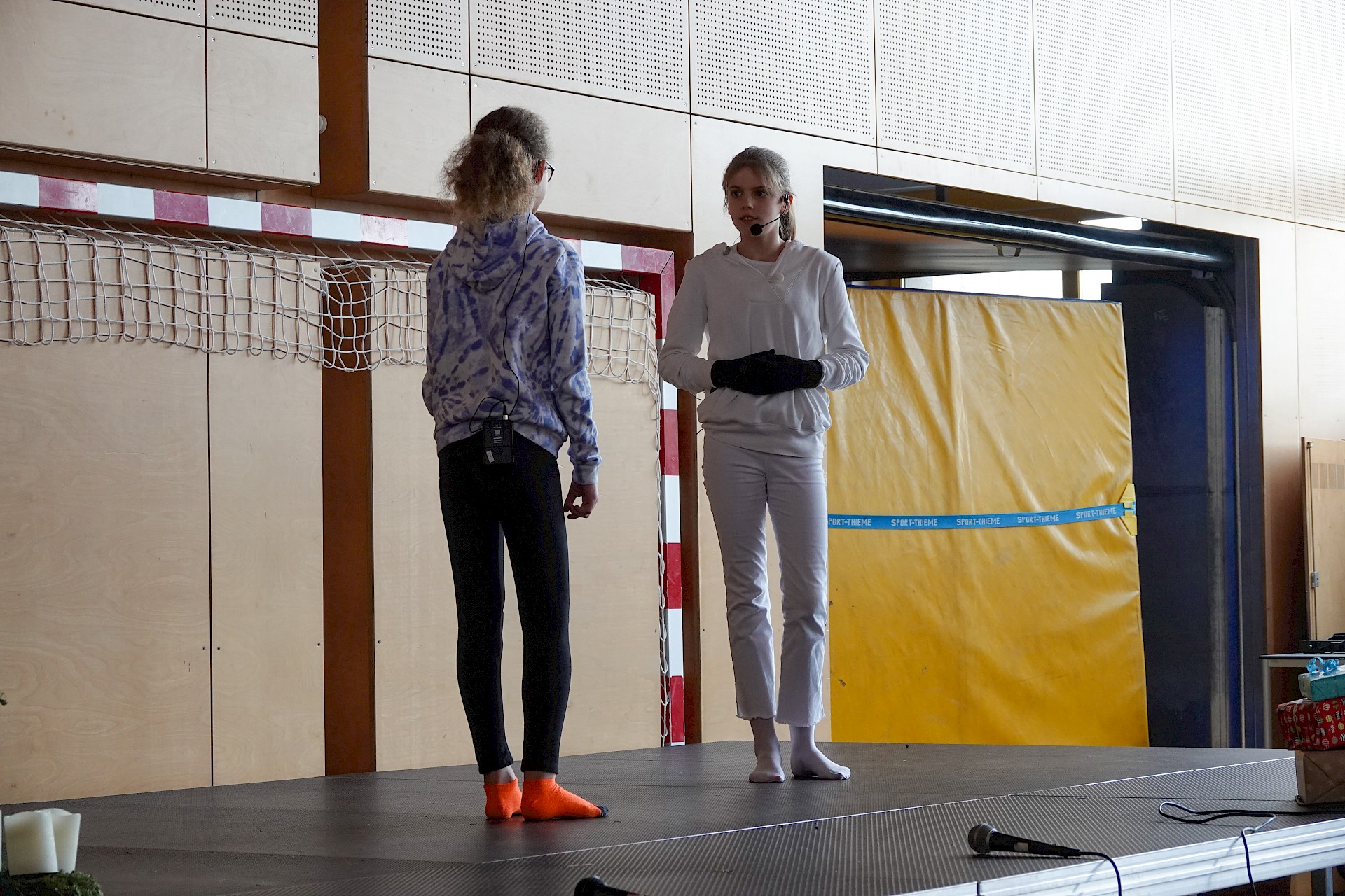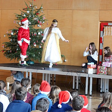 Juhu! Wir spielen wieder vor Publikum! Zum ersten Mal nach der coronabedingten Pause durften wir wieder live performen. Unser erster Auftritt fand bei der traditionellen Weihnachtsfeier für die Klassen der Unterstufe im Turnsaal statt. Da sich erfreulicherweise so viele theaterbegeisterte Kinder angemeldet hatten, arbeiteten wir in zwei Gruppen: alle Erstklässler*innen (Gruppe A) und die „alten Hasen“ beziehungsweise „Häsinnen“ (Gruppe B). Die Stücke haben wir – wie fast immer – gemeinsam entwickelt.