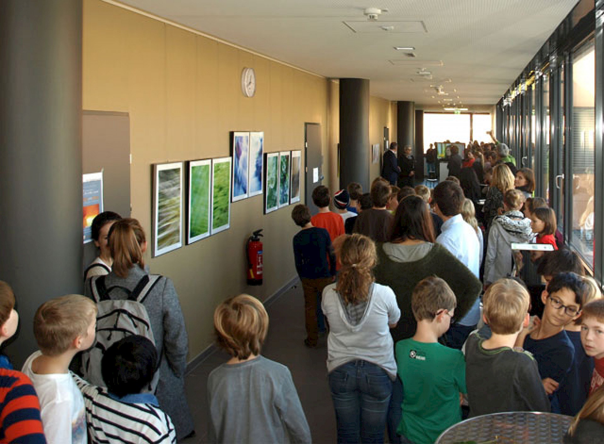 Künstler*innen, Lehrer*innen, Eltern und viele Schüler*innen trafen sich bei der Ausstellung, bewunderten die eindrucksstarken Bilder und lauschten fasziniert dem Spiel unseres Konzertpianisten Alex Kapl (7A).