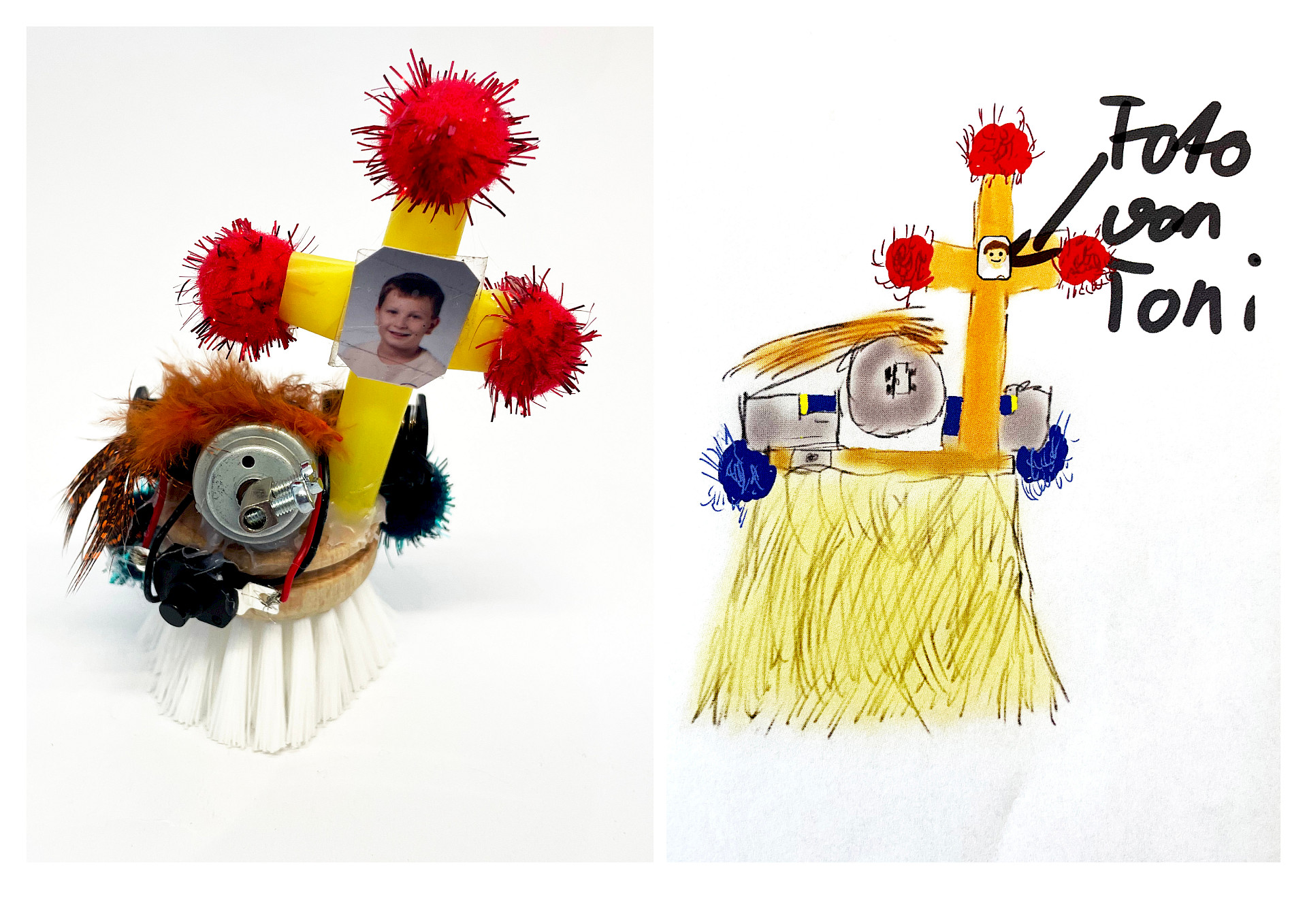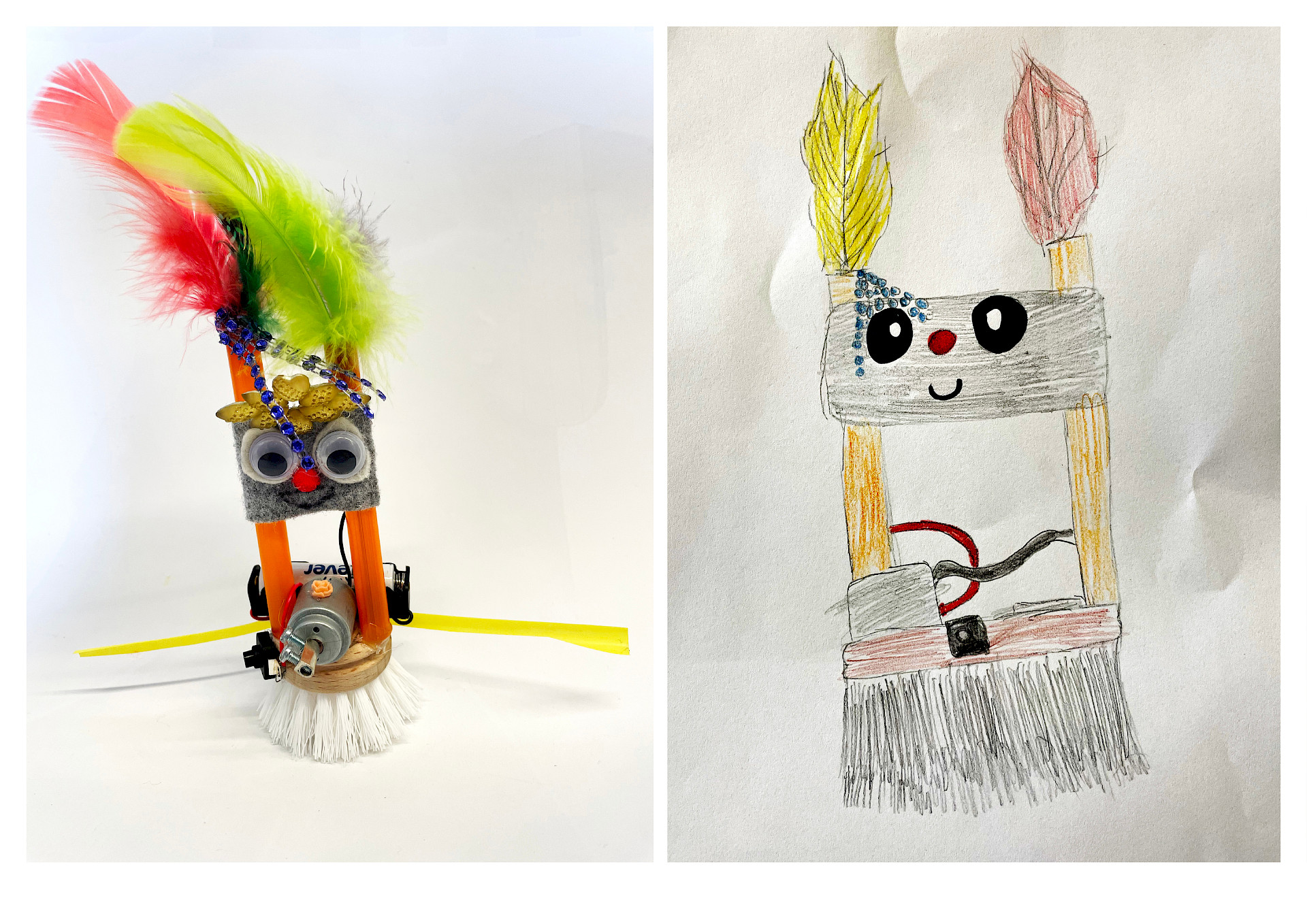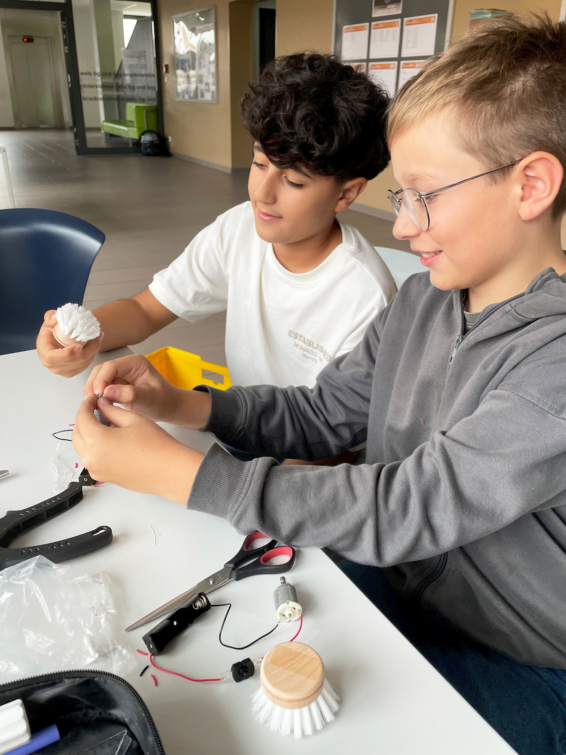 Die einfachen Materialien wie Bürstenköpfe und Bastelmaterial wurden mit kleinen Motoren und Batterien bestückt und erhielten eine Verkabelung zu einem Einschaltknopf. Es entstanden bewegliche Mini-Roboter, die durch Vibration in Gang gesetzt werden. Nach einer kurzen Einführung zum Ziel des Projekts experimentierten die Kinder frei mit den Materialien, erprobten verschiedene Lösungswege und fanden gemeinsam heraus, wie sie ihre Bürste sinnvoll „zum Laufen“ bringen konnten. Anschließend gestalteten sie ihre Roboter kreativ und individuell weiter.