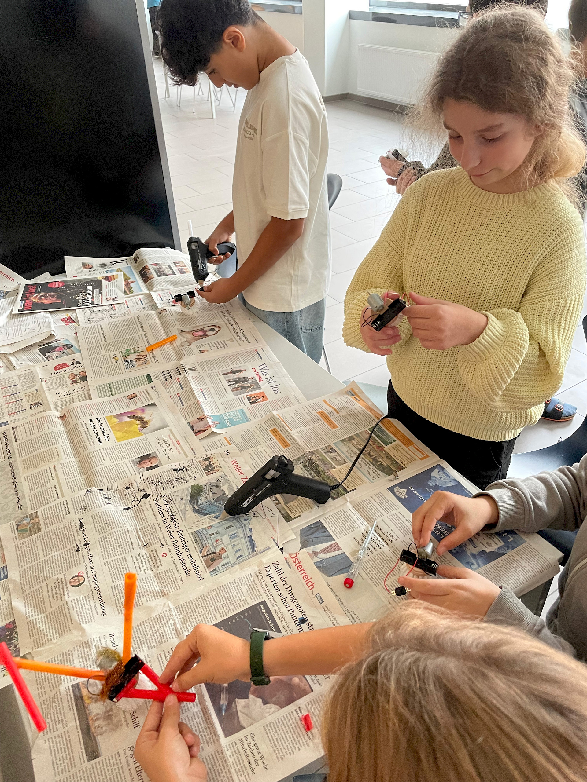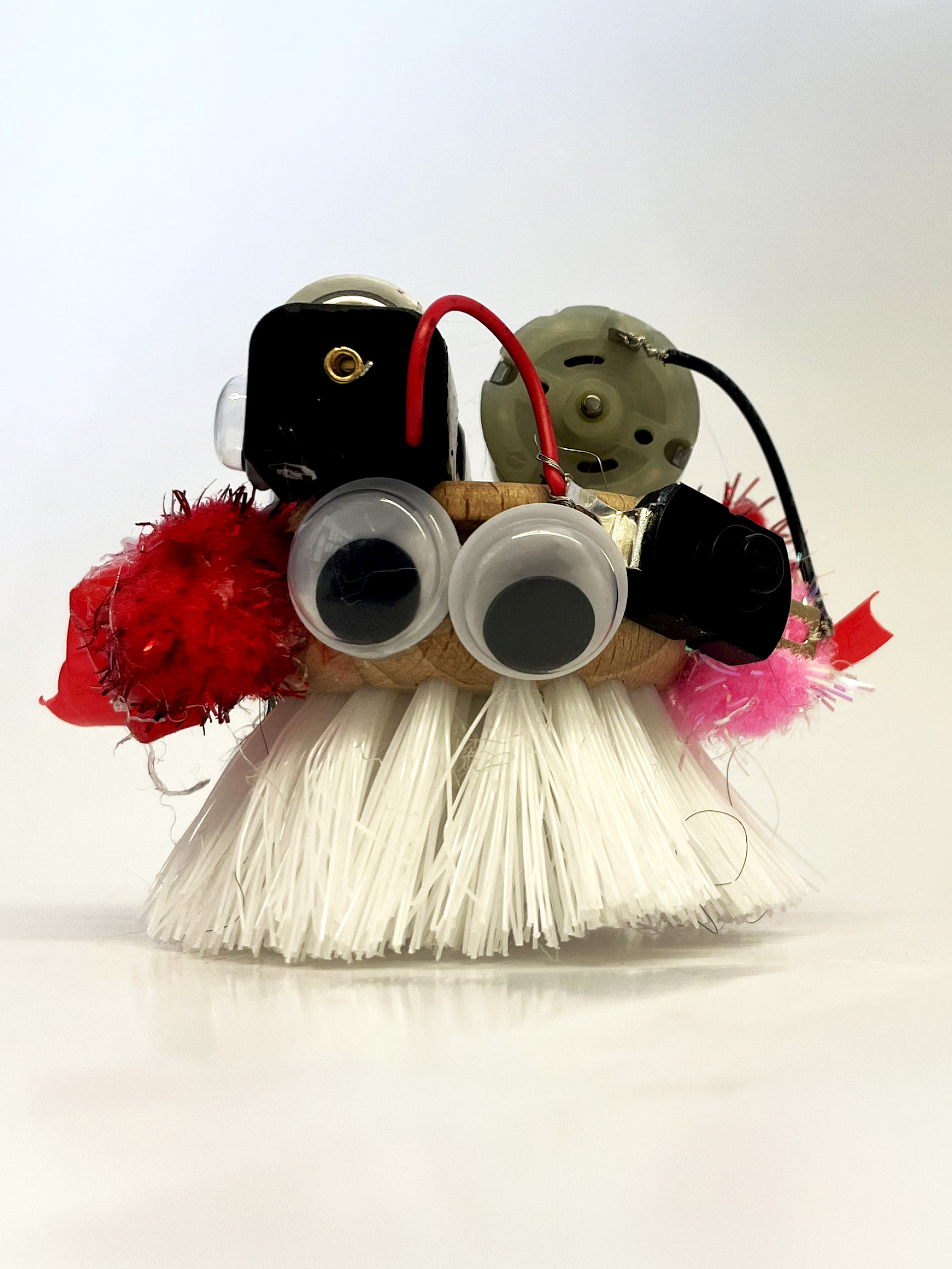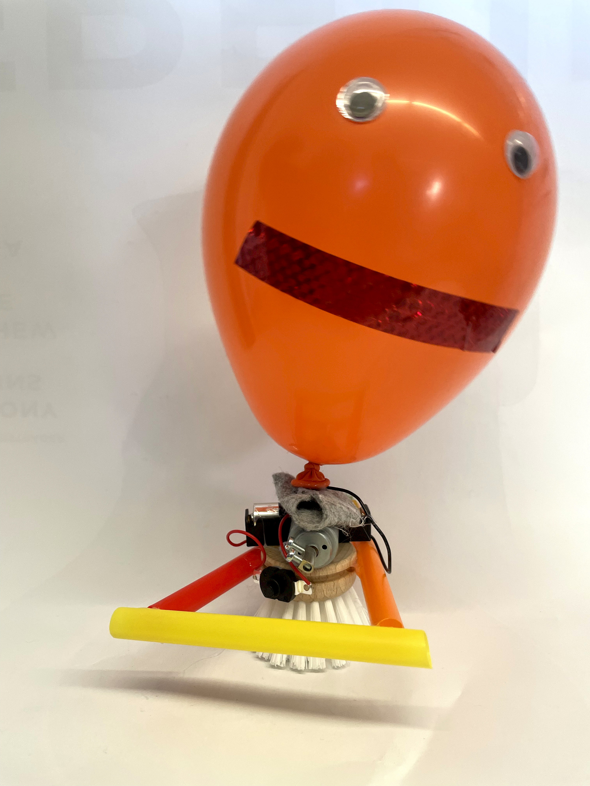 Die einfachen Materialien wie Bürstenköpfe und Bastelmaterial wurden mit kleinen Motoren und Batterien bestückt und erhielten eine Verkabelung zu einem Einschaltknopf. Es entstanden bewegliche Mini-Roboter, die durch Vibration in Gang gesetzt werden. Nach einer kurzen Einführung zum Ziel des Projekts experimentierten die Kinder frei mit den Materialien, erprobten verschiedene Lösungswege und fanden gemeinsam heraus, wie sie ihre Bürste sinnvoll „zum Laufen“ bringen konnten. Anschließend gestalteten sie ihre Roboter kreativ und individuell weiter.