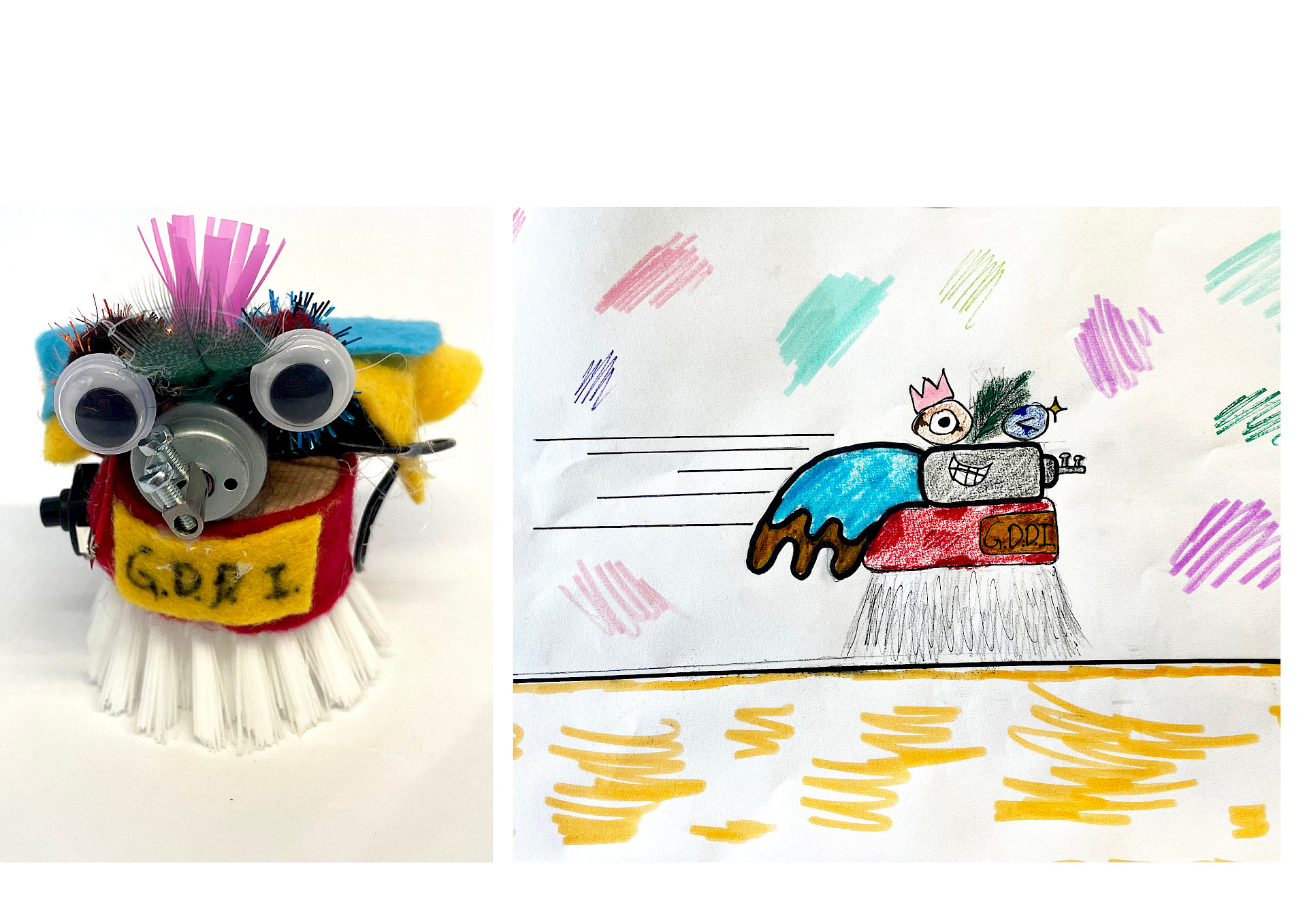 Die Schüler*innen der 2E gestalteten und erstellten im Kunstunterricht ihre eigenen Bürstenroboter.