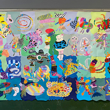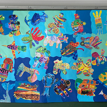 Nach dem Betrachten des Bildes und experimentellen Methoden wie dem Zufallsverfahren Cadavre Exquis entstanden fantasievolle Meereswesen. Mit viel Freude gestalteten die Schüler*innen ihre Gemeinschaftscollage – natürlich auf blauem Grund!