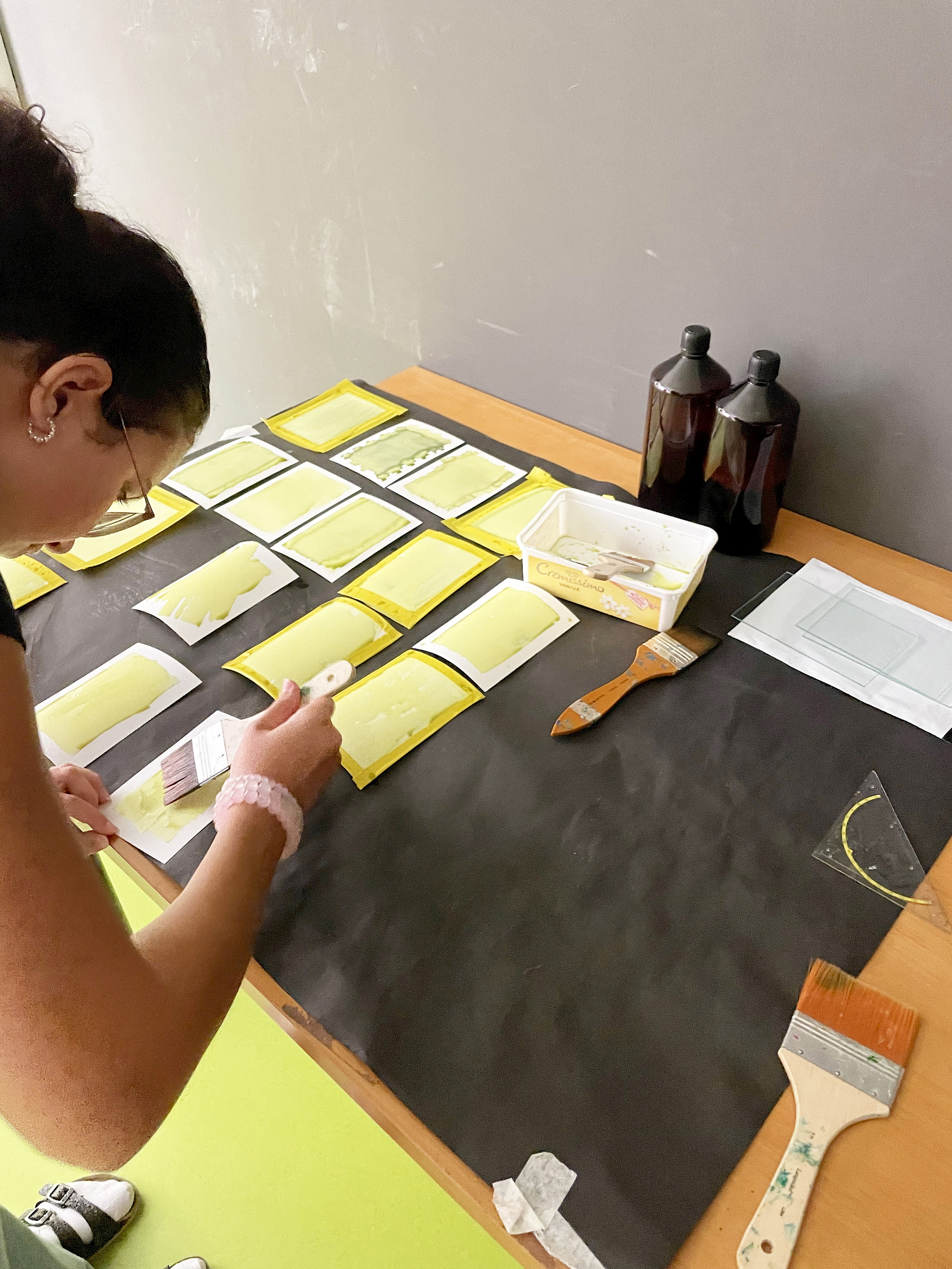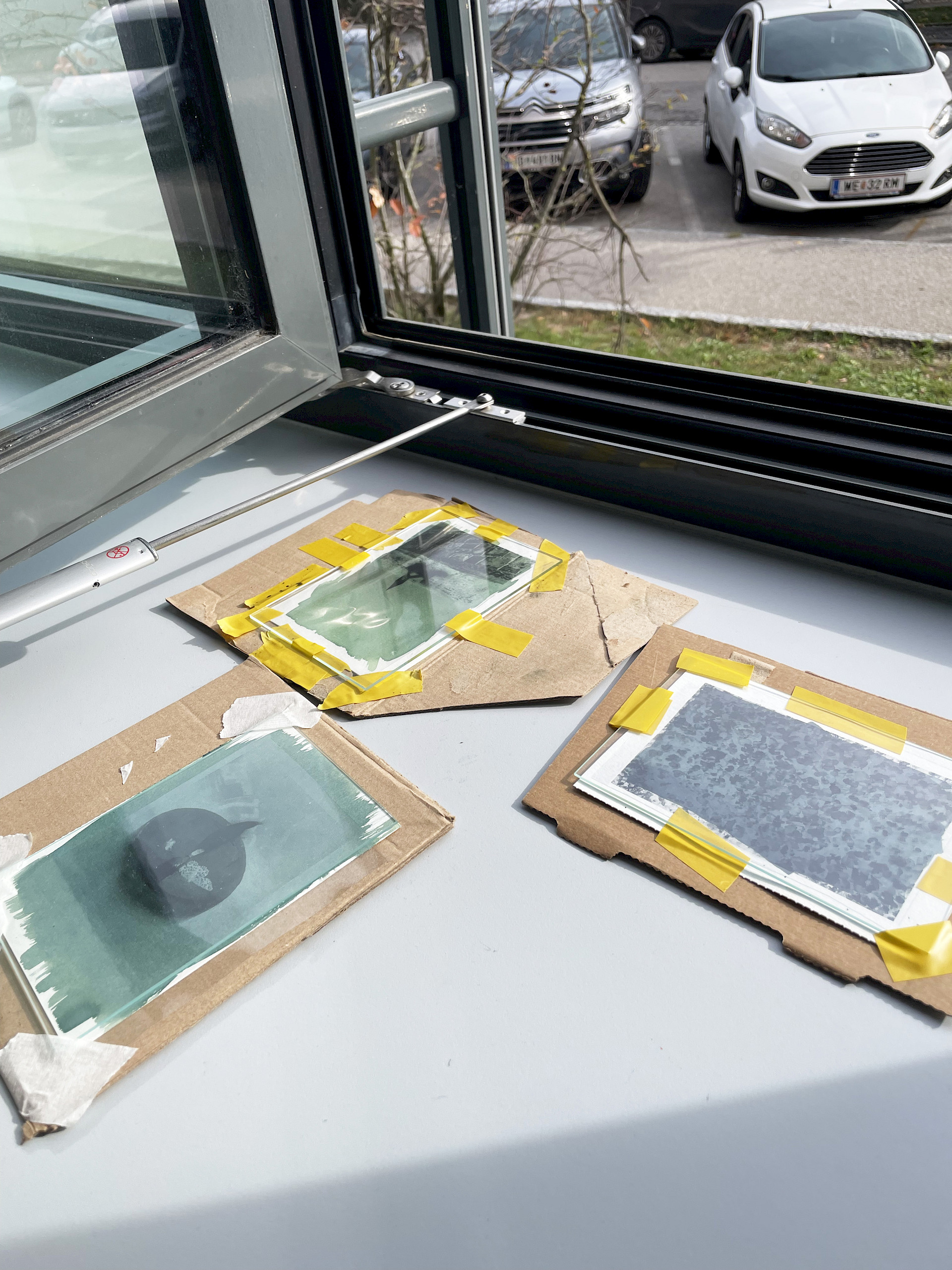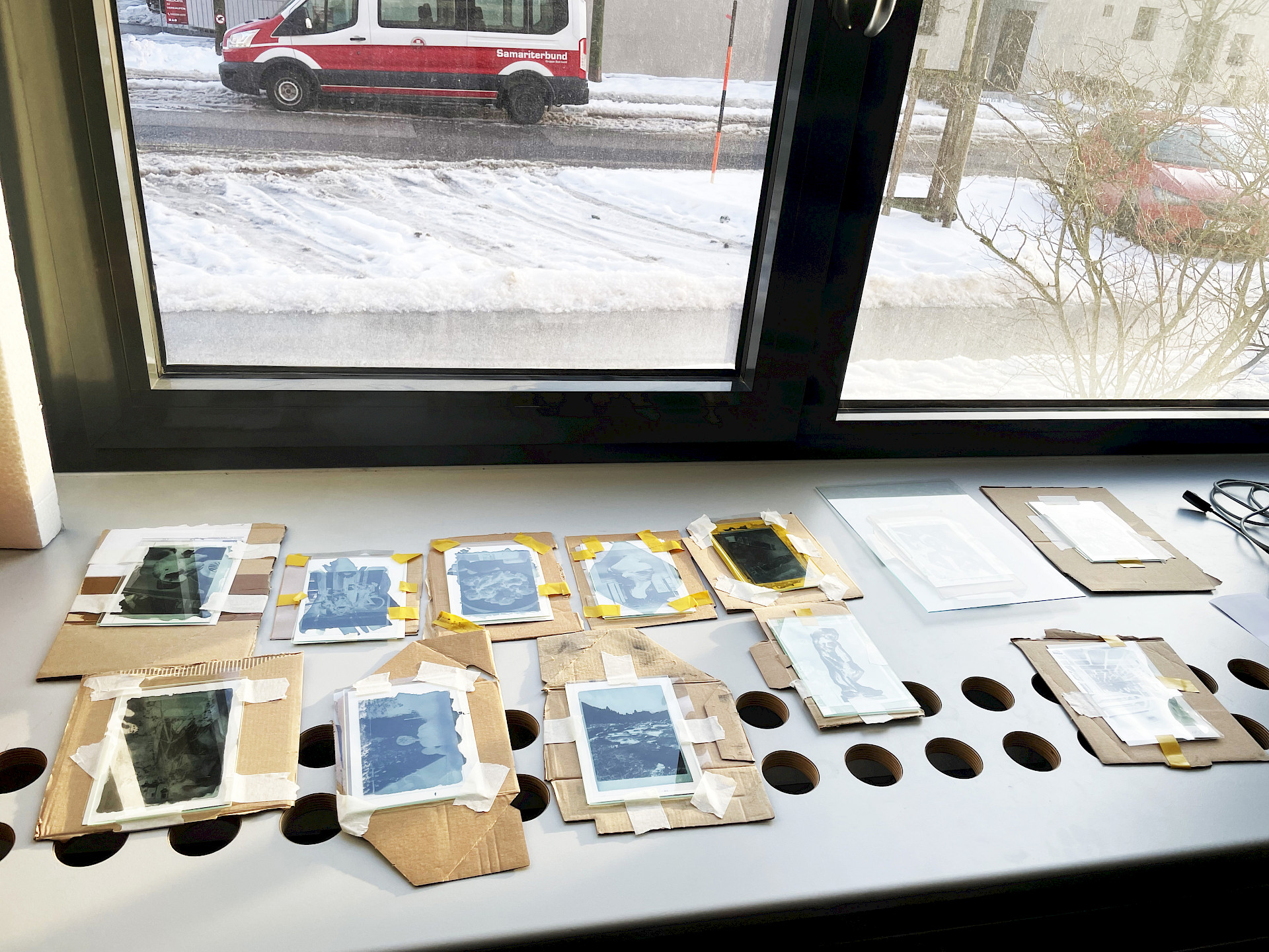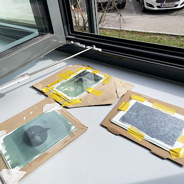 Für die praktische Umsetzung stellten die Schüler*innen zunächst ihr eigenes lichtempfindliches Papier her. Dazu wurde eine Lösung aus Ammoniumeisen(III)-citrat und Kaliumferricyanid auf Aquarellpapier aufgetragen und getrocknet. Die beschichteten Papiere wurden anschließend mit Negativen eigener Fotografien oder mit Gegenständen im Sonnenlicht belichtet. Durch das anschließende Auswaschen der überschüssigen Chemikalien entstanden die für die Cyanotypie typischen blauen Bilder im Postkartenformat.