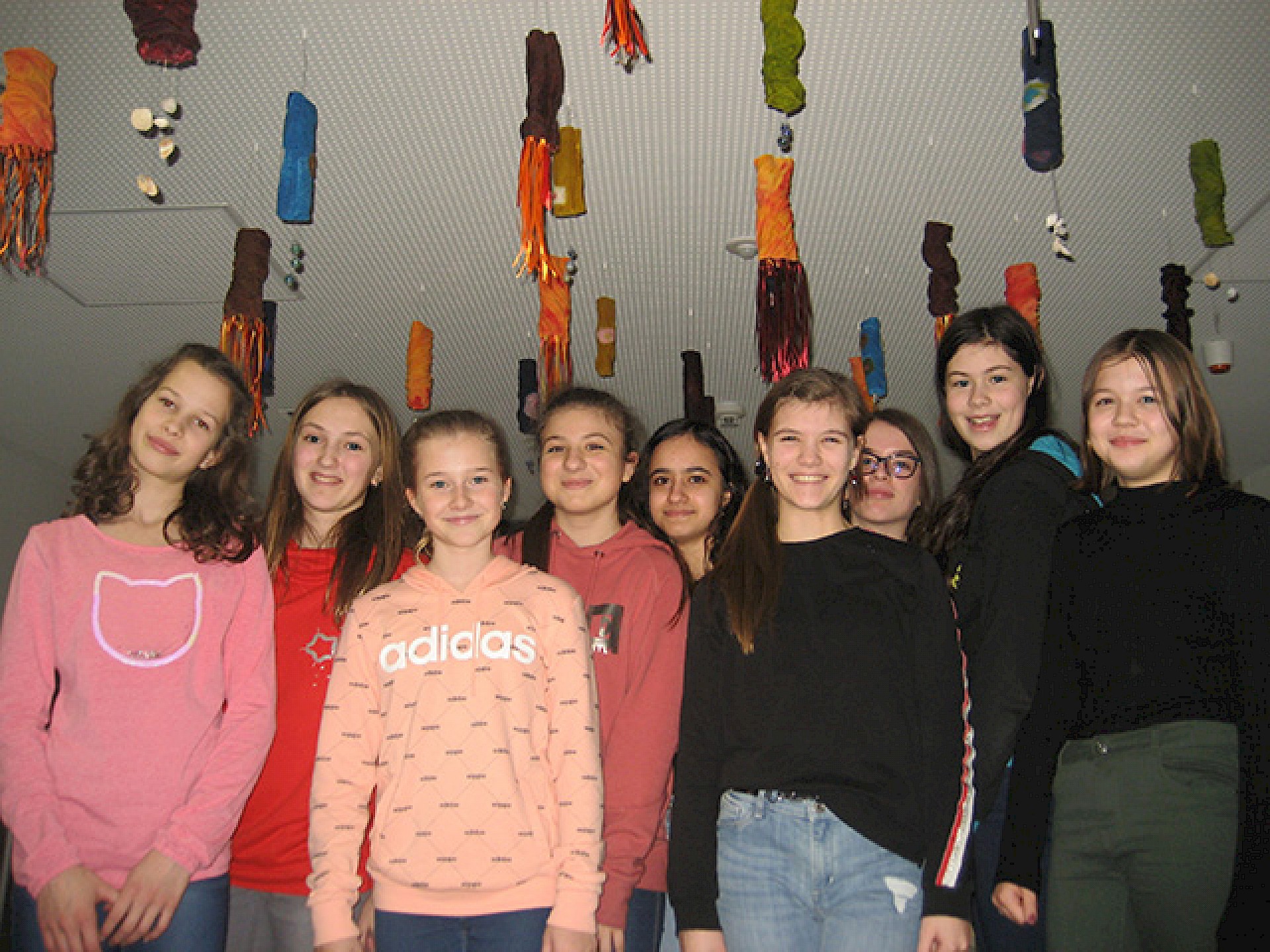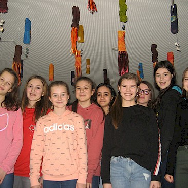 Für den Tag des Gymnasiums und zur Verschönerung der Schule fertigten die Schüler*nnen der 3NA-Klasse aus Resten der Tubes (textile Röhren), die mit der Textilkünstlerin Gerlinde Merl angefertigt wurden und im Stiegenaufgang an der Wallererstrasse zu bewundern sind, Hängeobjekte/Windspiele mit Muscheln, Bändern und mit Draht eingefassten Murmeln an.