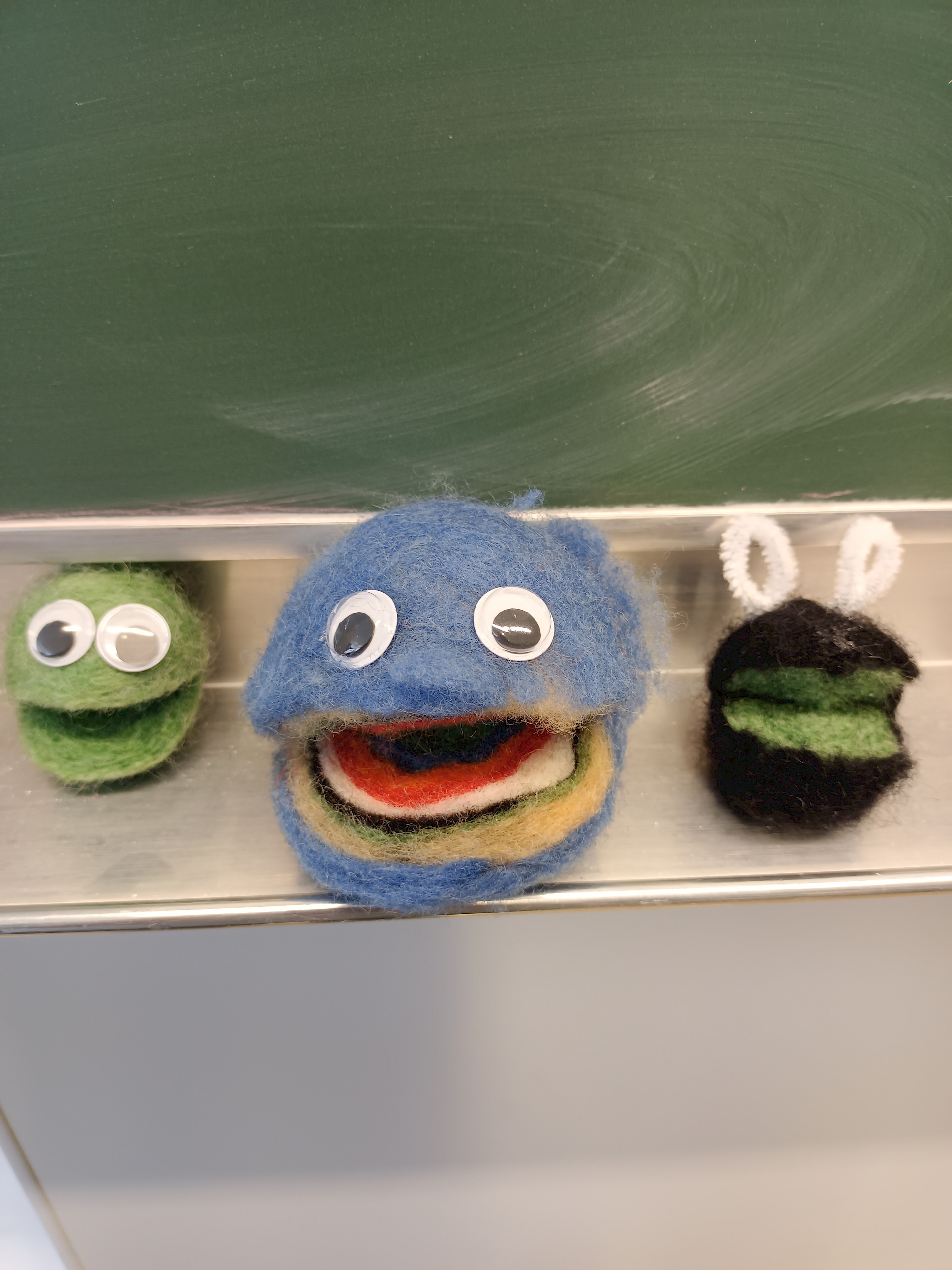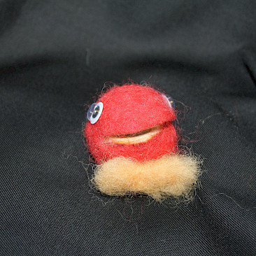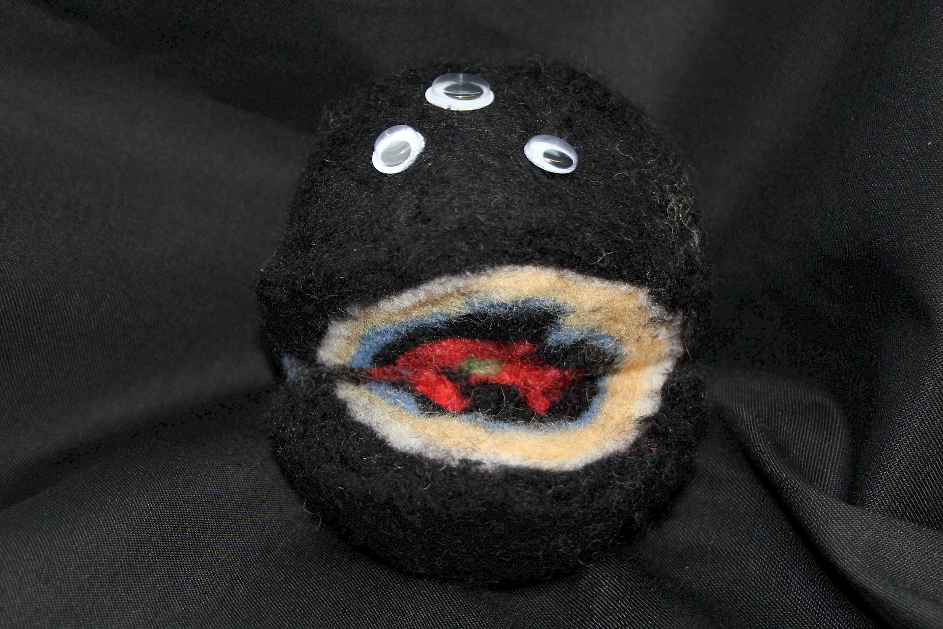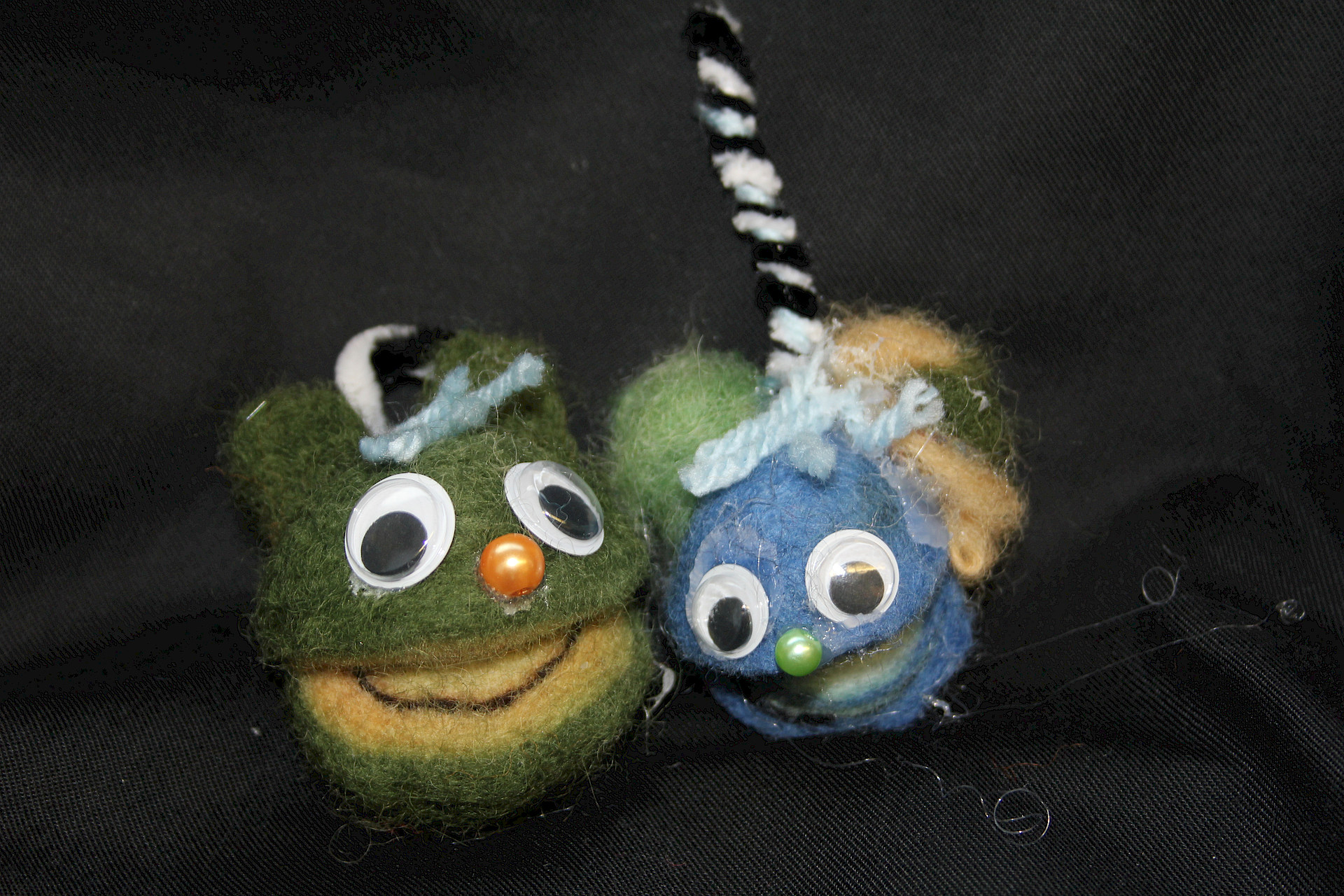 Durch die Nassfilztechnik wurden Filzkugeln in verschiedenen Farben schichtweise gefilzt und dann getrocknet. Danach konnte man die Filzkugeln auseinanderschneiden und weiter dekorieren zu kleinen Filzmonstern.