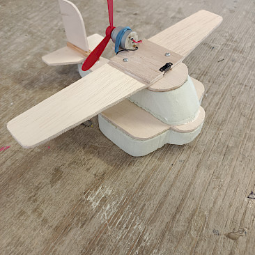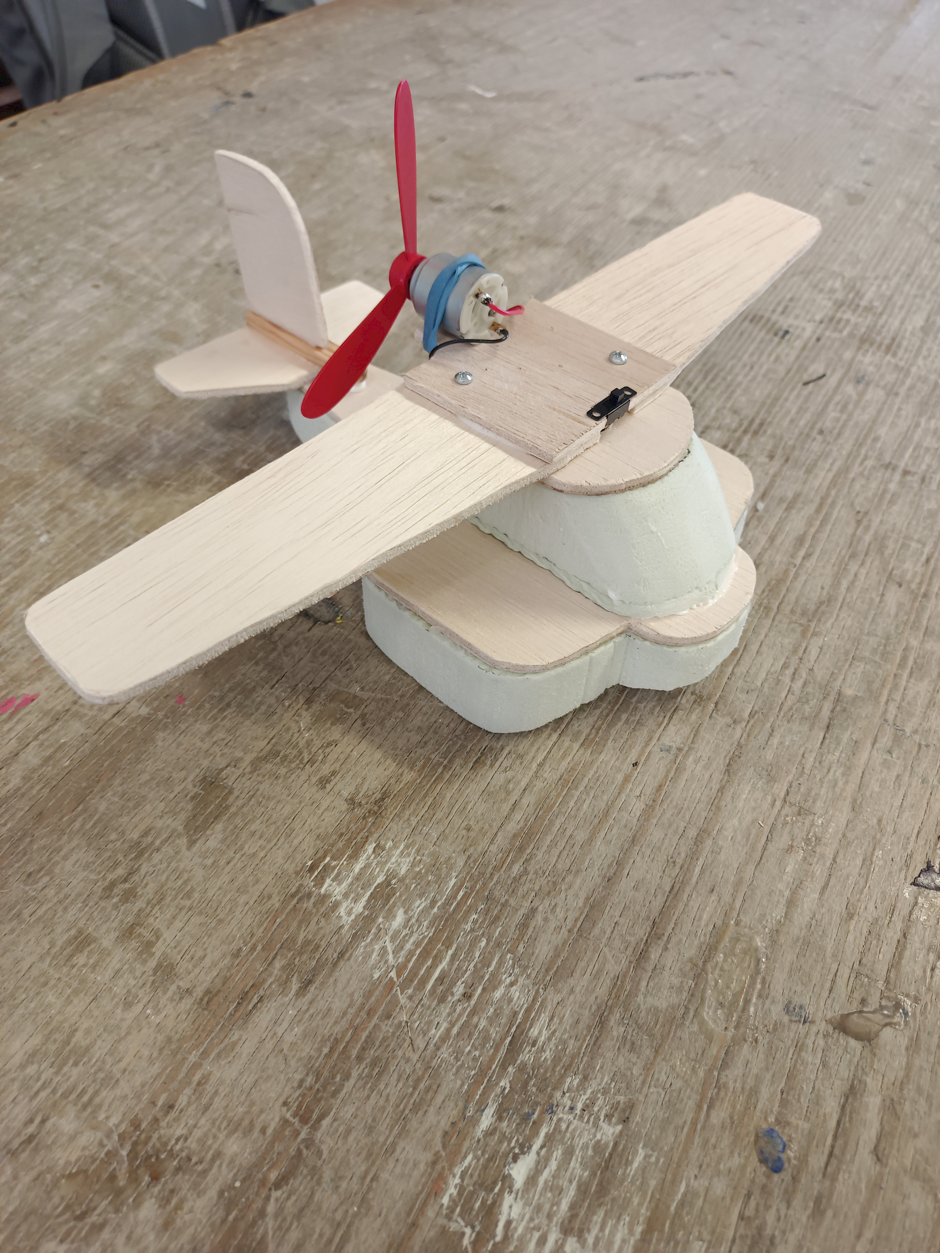 Auch ein Wasserflugzeug wurde von einem Schüler der 4B-Klasse gebaut. Dieses Flugzeug ist ein detailreiches Modell eines Propellerfliegers, der über das Wasser gleiten kann.