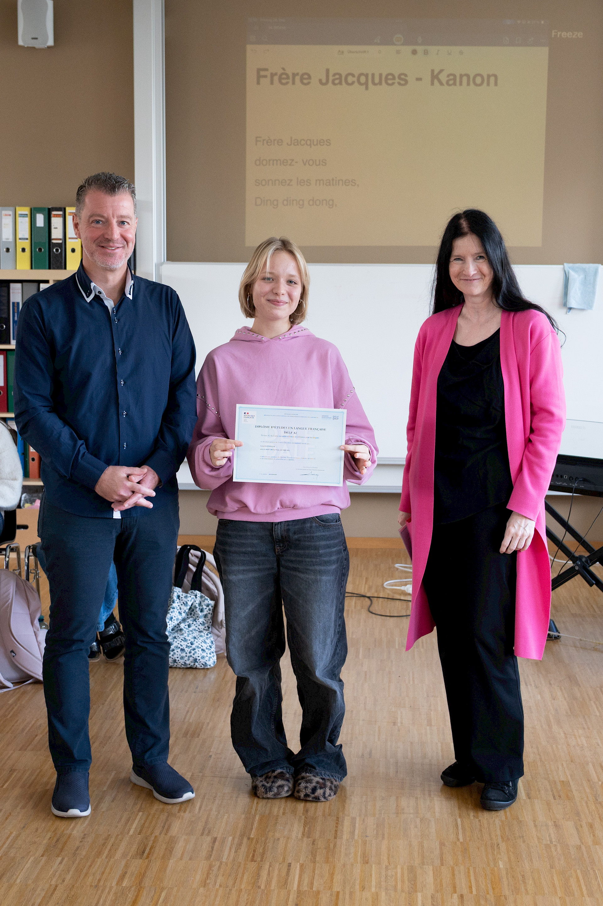 In der sechsten Einheit bildeten die Klassen 3A und 4A in blauen, weißen und roten T-Shirts die französische Flagge auf unserem Campus nach. Bei diesem erfreulichen Anblick ließ sich sogar die Sonne wieder blicken. Danach übersiedelten wir in den Musiksaal, wo die schulinternen Siegerinnen des französischen Vorlesewettbewerbs prämiert und die DELF-Zertifikate des vergangenen Schuljahres von Direktor MMMag. Florian Koblinger feierlich überreicht wurden. Den stimmungsvollen Abschluss bildete der Kanon „Frère Jacques“, den Frau Mag. Brigitte Panic-Unfried mit der 3A einstudiert hatte.