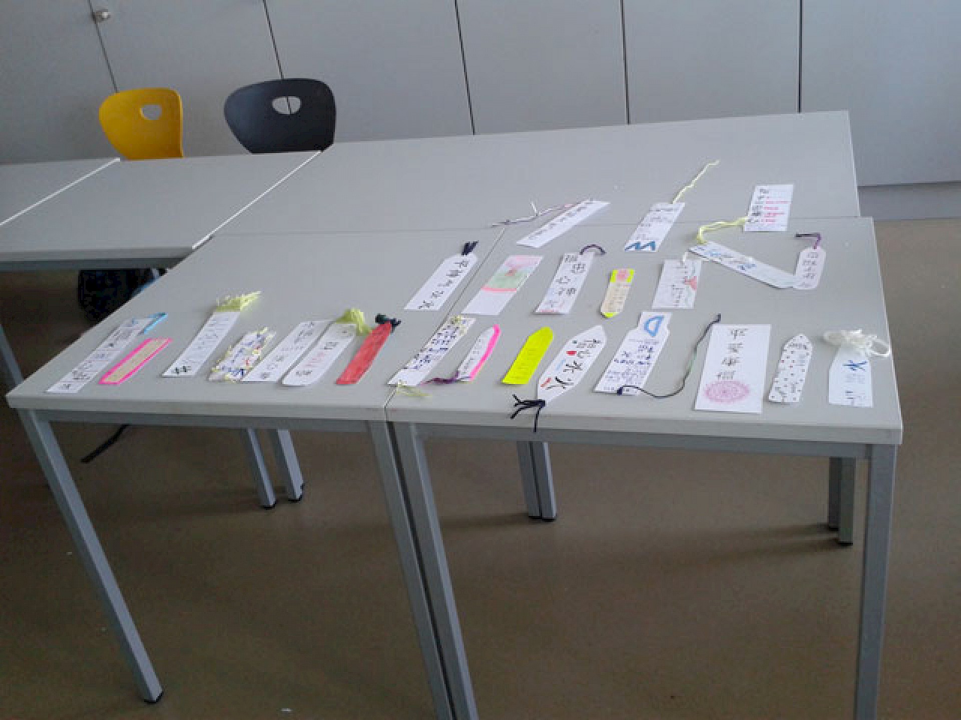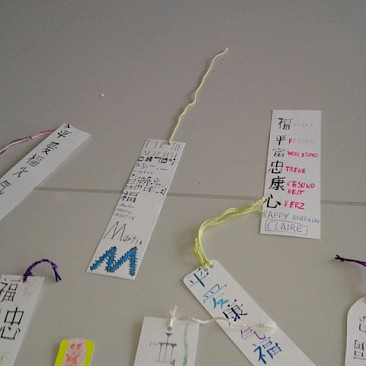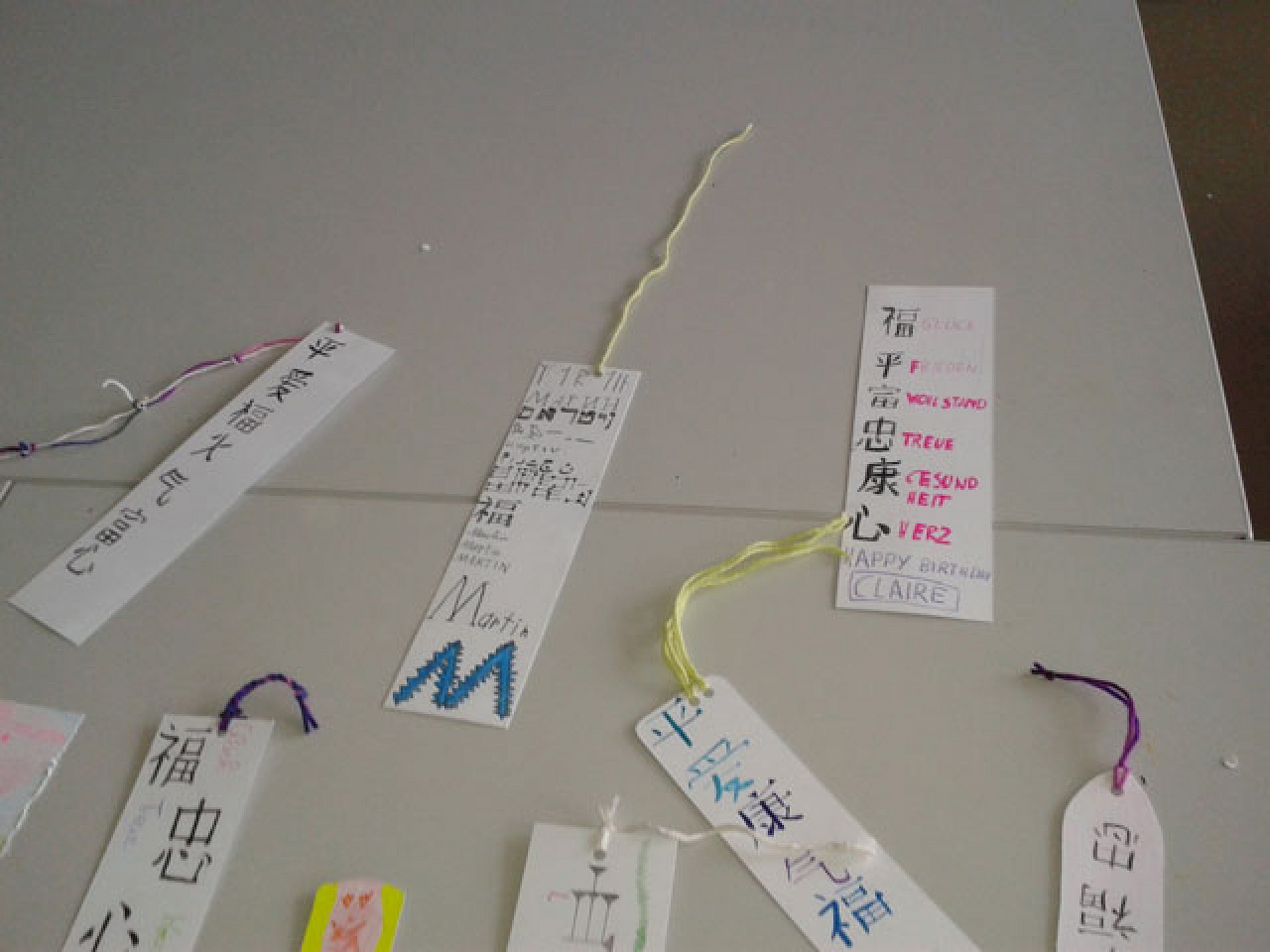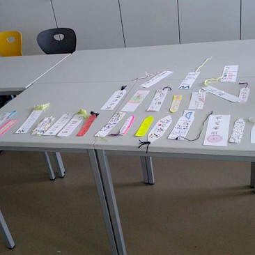 Danach ging es an die Lesezeichen-Produktion. Unter der fachkundigen Leitung von Frau Professor Prokop entwarfen alle Schüler*innen ihr persönliches Lesezeichen, wobei es galt, unterschiedliche Schriftarten (z.B. chinesische Schriftzeichen, Runen usw.) auszuprobieren.