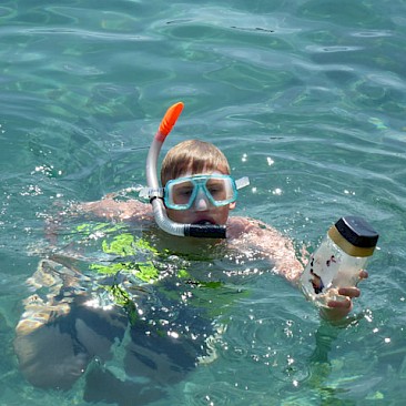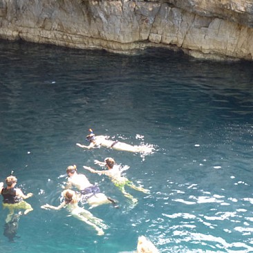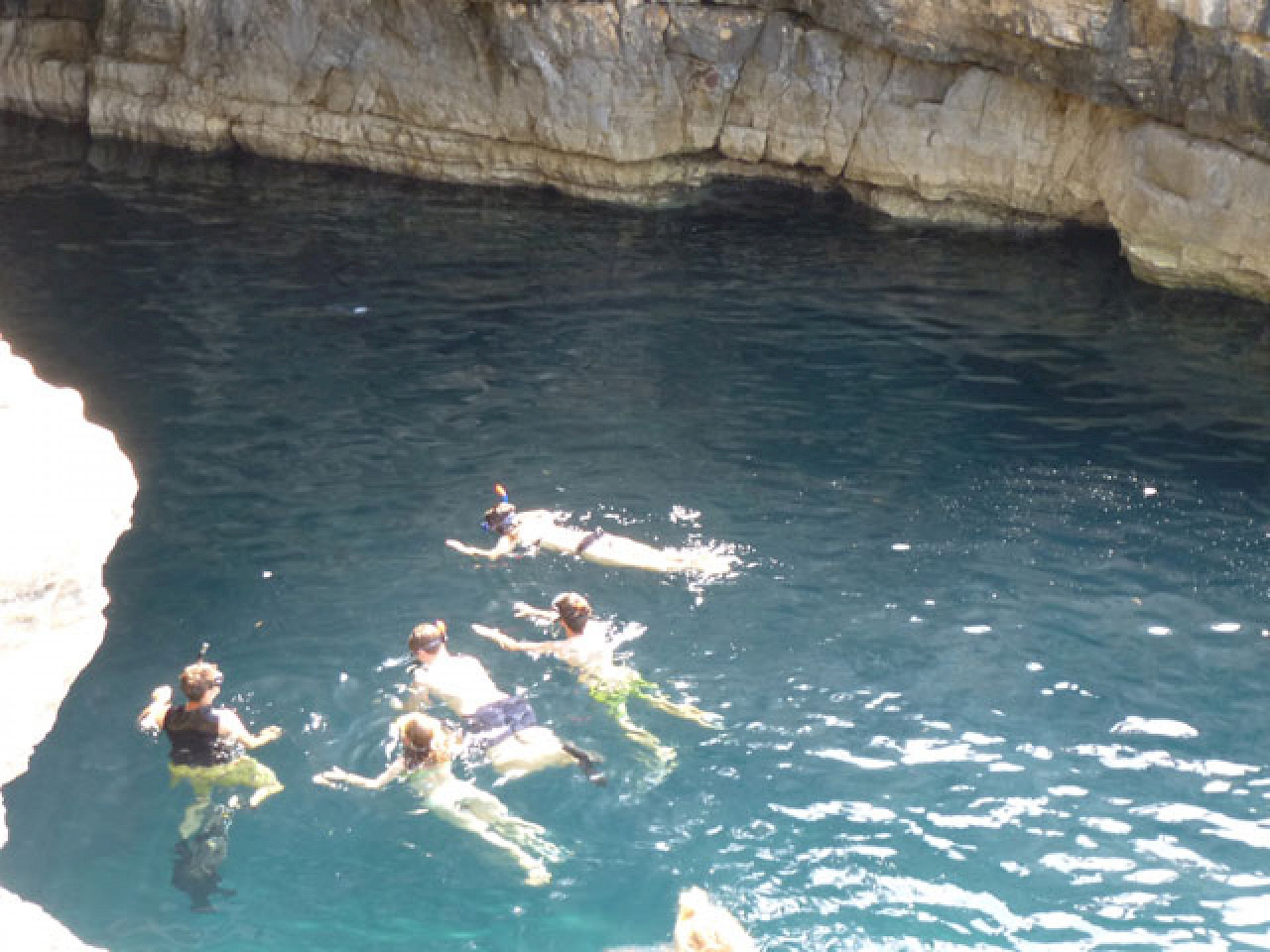 Nachdem diese Hürde genommen war beschäftigten wir uns in den folgenden Tagen mit den unterschiedlichsten Meeresbewohnern und ihren Eigenheiten. Das nette Team der Meeresschule unterstützte uns in Theorie und Praxis. Es wurden Fische bestimmt und zugeordnet, der Meeresboden nach Lebewesen wie Seegurken, Seespinnen, Krebsen und anderen Organismen untersucht. Das anschließende sezieren dieser "Tierchen" stieß aber nicht bei Allen auf Begeisterung. Höhepunkt dieser Erkundungen war die Bootsfahrt zu einer Grotte. Hier tauchten wir mit Taschenlampen ausgerüstet ein, in die faszinierende "Unterwasserwelt".