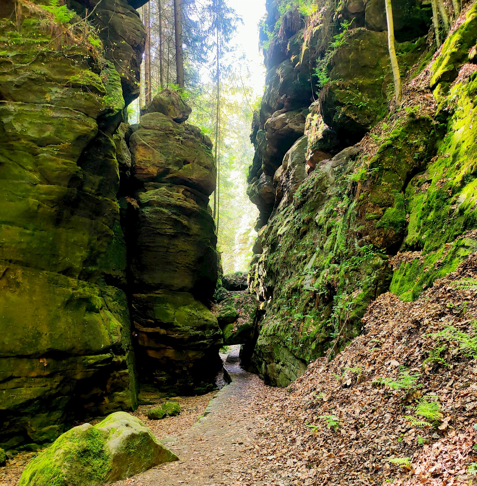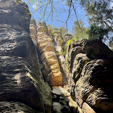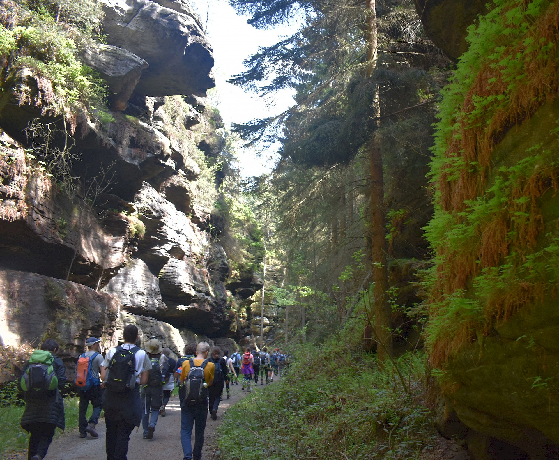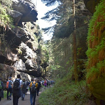 Einen Tag verbrachten wir auch im böhmischen Teil des grenzüberschreitenden Nationalparks. Dabei wanderten wir über das Prebischtor, dem größten natürlichen Felsentor Europas, weiter über das Felsenband des Gabrielensteigs bis zur Edmundsklamm am Fluss Kamnitz. Durch diese kehrten wir bei einer abenteuerlichen Kahnfahrt zurück nach Hřensko (Herrnskretschen). Die wilde Felsenlandschaft der Sächsischen Schweiz mit ihren Felsriffen und -zacken und den tiefen Schluchten ist das Ergebnis lang andauernder Erosionsprozesse. Ursprünglich wurden die Sande in einem tropischen Meer in der Kreide-Zeit vor 90 Millionen Jahren abgelagert.