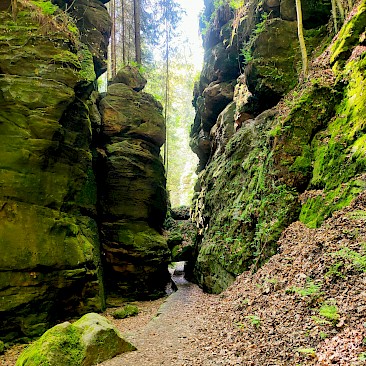 Überall im Elbsandsteingebirge der Sächsischen Schweiz trifft man auf schmale Steige und Durch- oder Übergänge (oft mit Drahtseilsicherungen), steile Leitern, Aussichtspunkte, lange Treppen, die das Gelände spannend und kurzweilig erschließen (in Sachsen auch „Stiegen“ genannt). Darauf wiesen auch schon am ersten Wandertag die klangvollen Geländenamen hin: Teufelsbrücke, Wolfschlucht, Höllgrund, Schwedenlöcher. Kein Wunder, dass diese einzigartigen landschaftlichen Schönheiten im 19. Jahrhundert vor allem von Malern der Romantik geradezu „gestürmt“ wurden und man in aller Welt darüber berichtete. So stützt sich das weltberühmte Gemälde von Caspar David Friedrich „Der Wanderer über dem Nebelmeer“ (1818) hauptsächlich auf Motive aus der Sächsischen Schweiz.