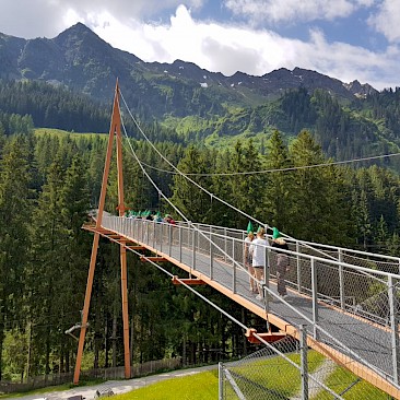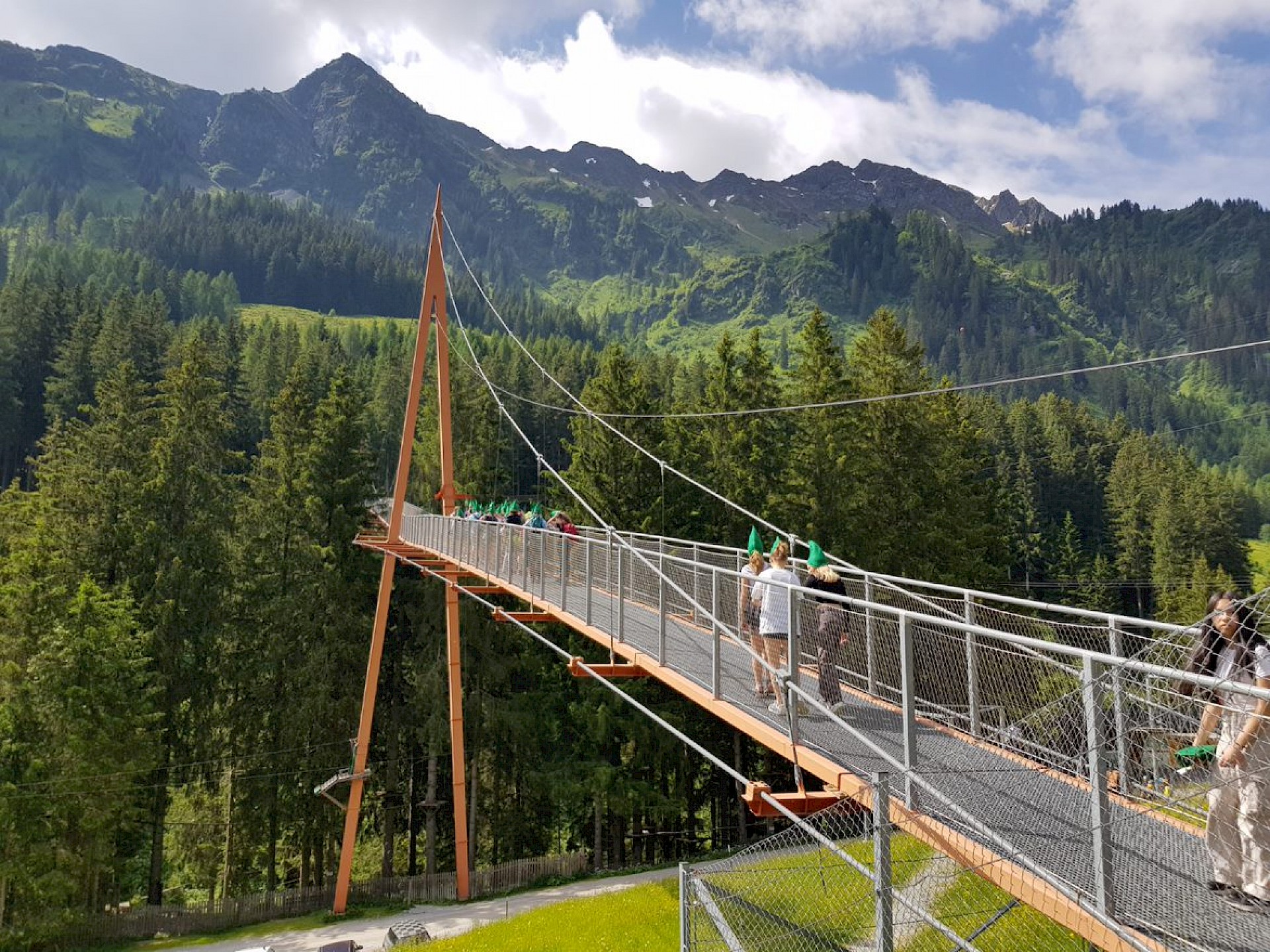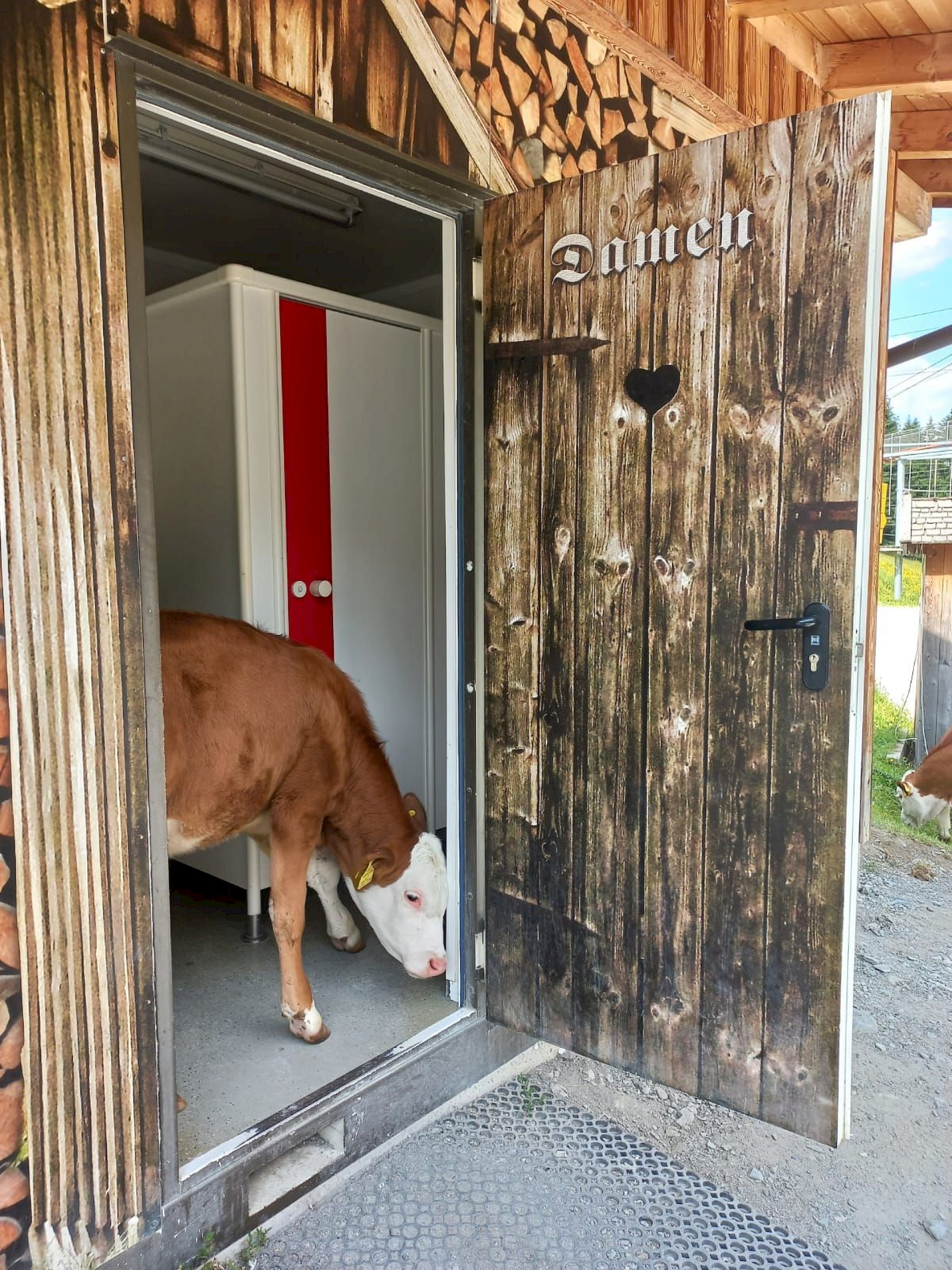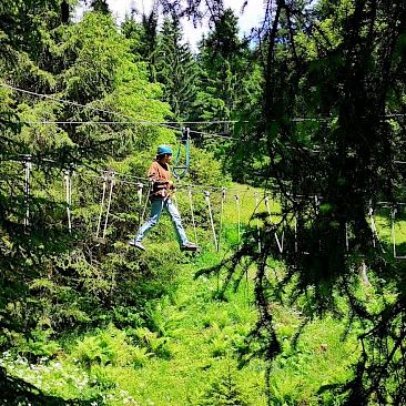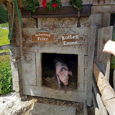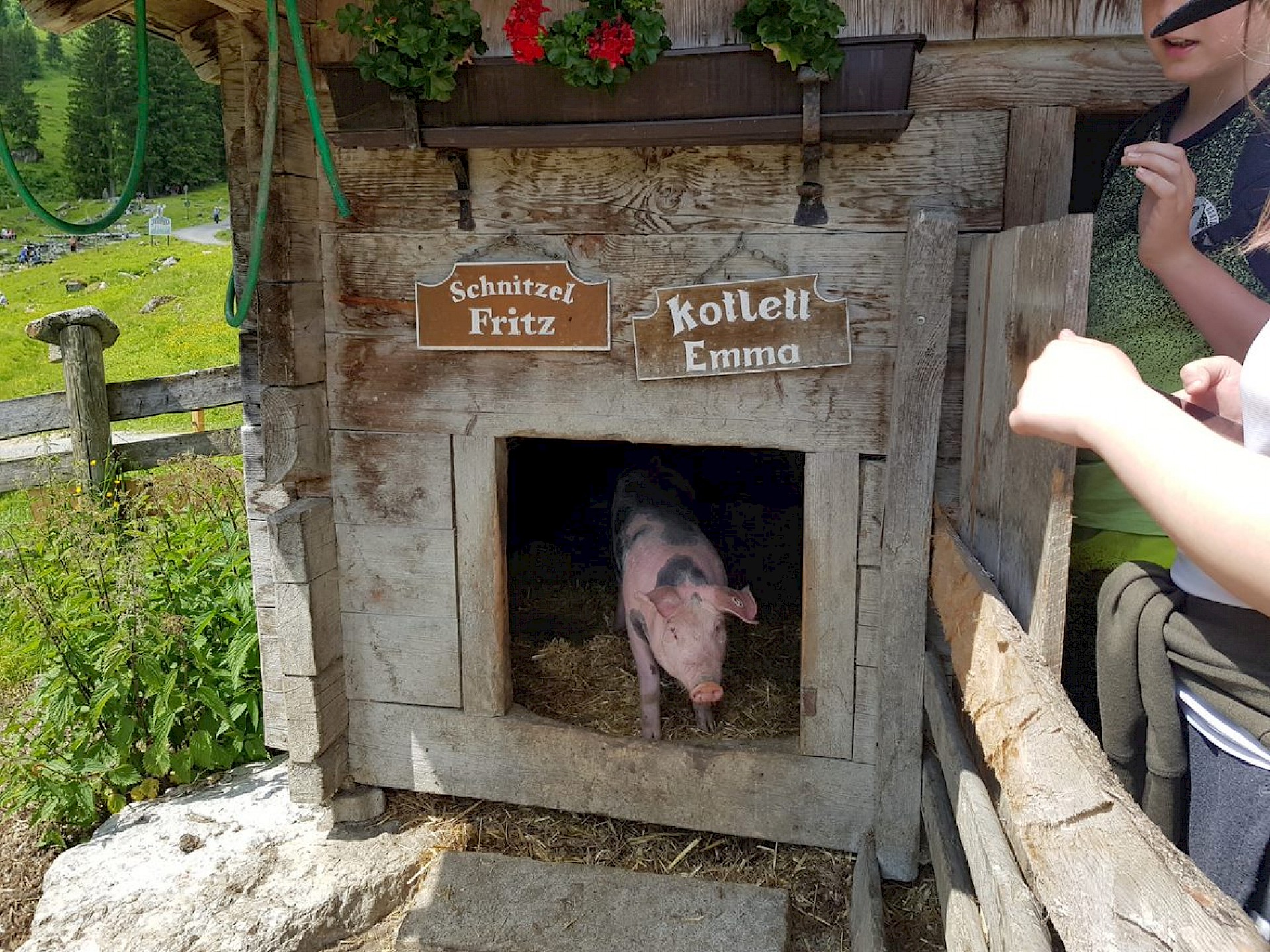 Der Besuch des höchstgelegenen Wipfelwanderwegs Europas – Baumzipflweg genannt – war ein Erlebnis und die Golden Gate Brücke der Alpen im Talschluss bot einen beeindruckenden Blick auf die umliegenden Berge. Die Überquerung der 42 Meter hohen Brücke kostete dem einen oder anderen „Zwerg“ aber auch Überwindung und Mut. Wer die Augen dabei allerdings offen hielt, erhaschte bereits einen Blick auf das Highlight dieser Woche: den größten Hochseilpark Europas inklusive Jump&Slide Park. Es wurde gerutscht, gehüpft, geklettert, was das Zeug hielt. In den Pausen und auch beim Toilettenbesuch (siehe Foto) hatten wir dabei stets tierische Gesellschaft.
