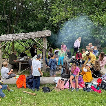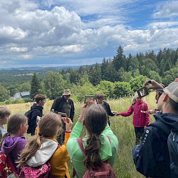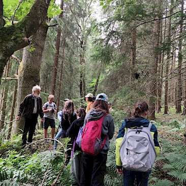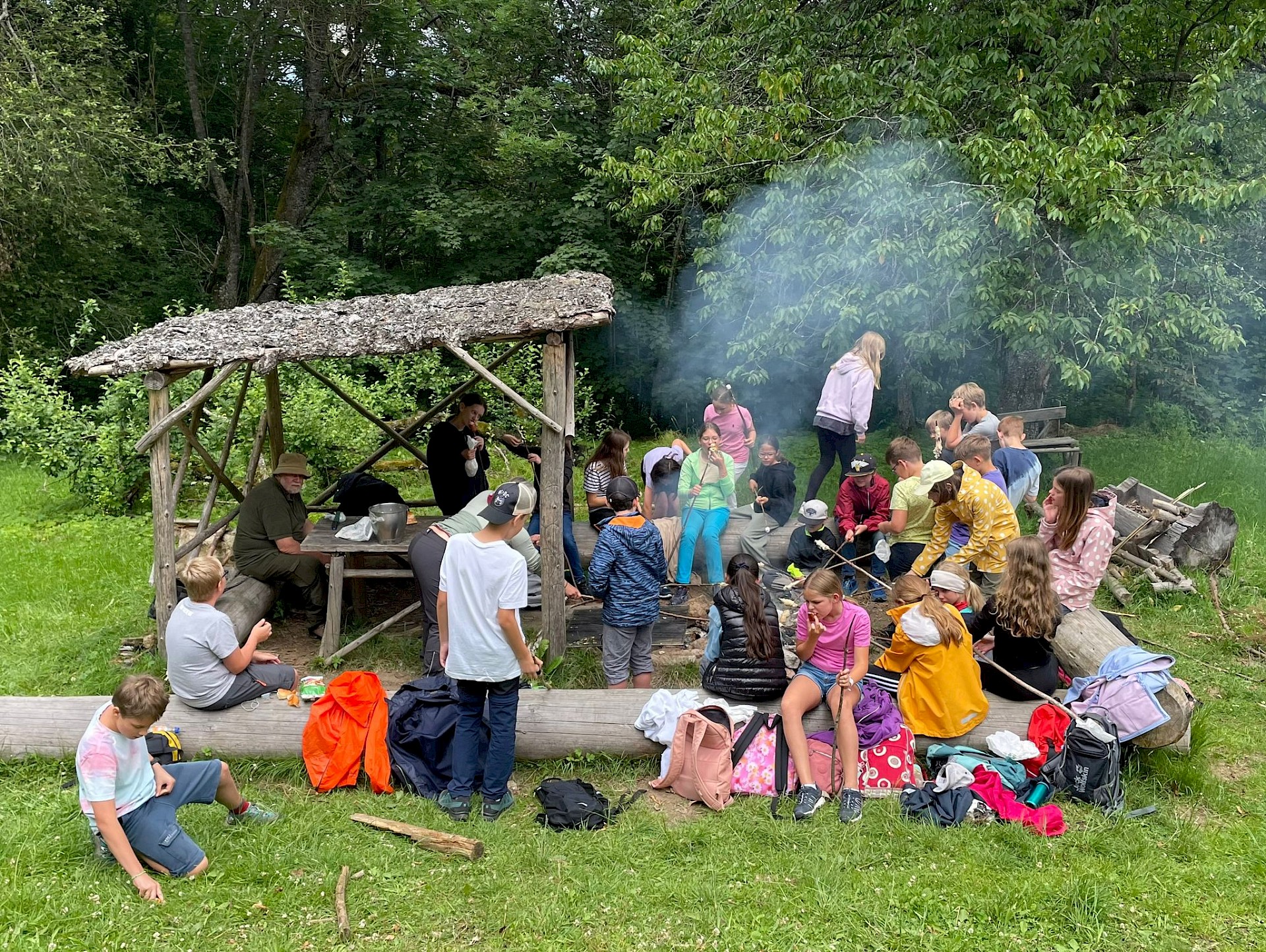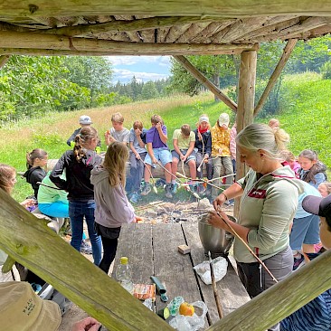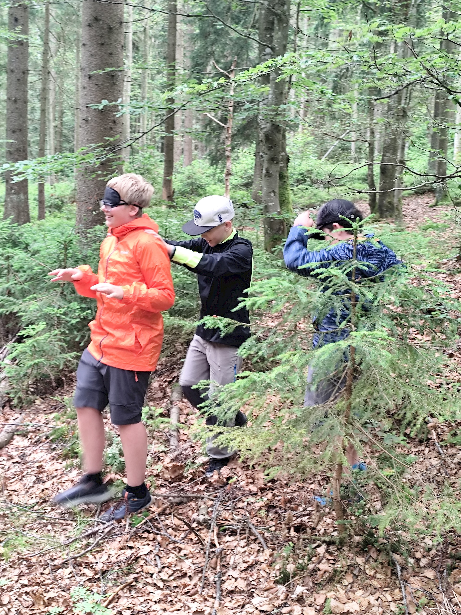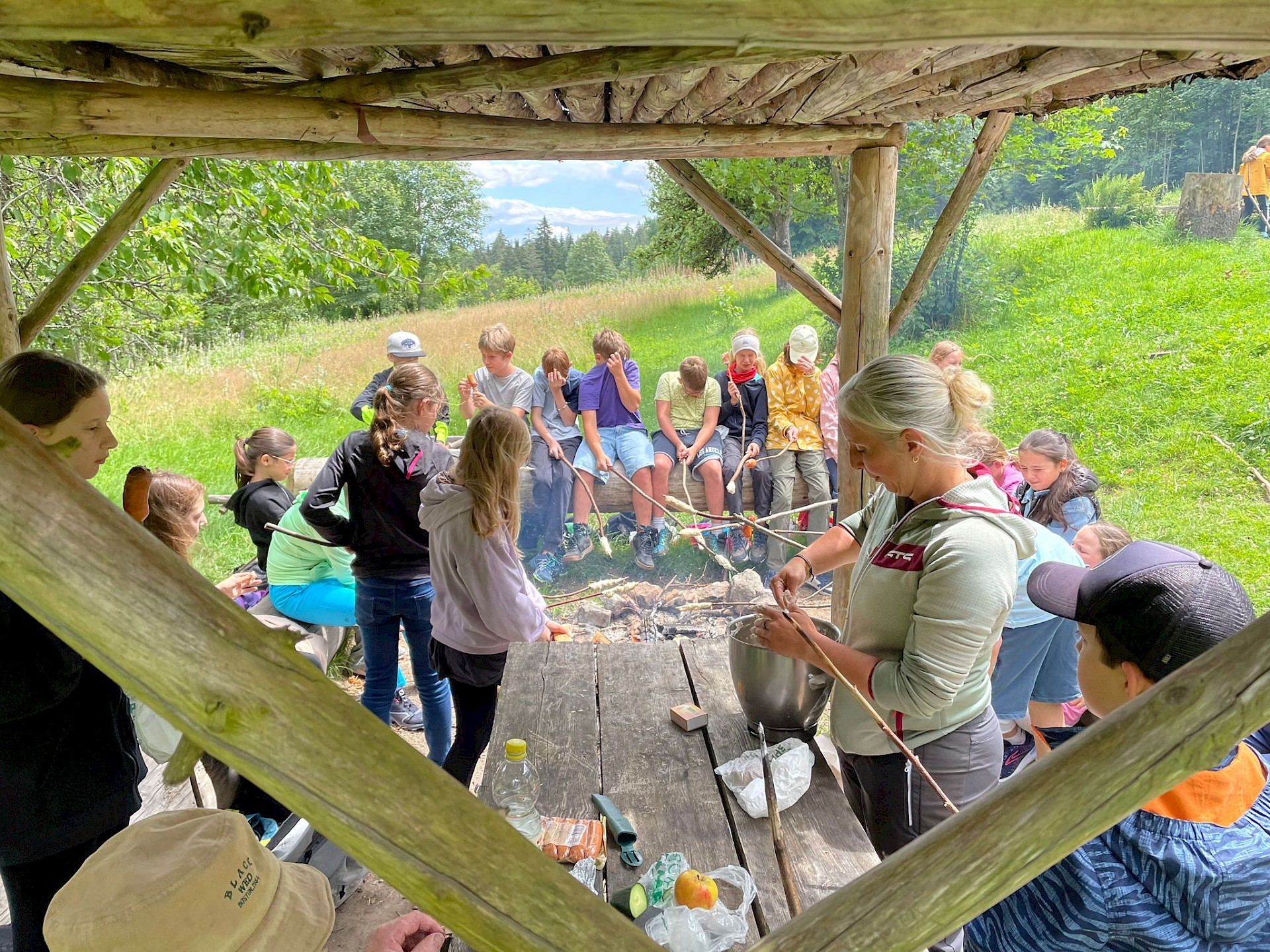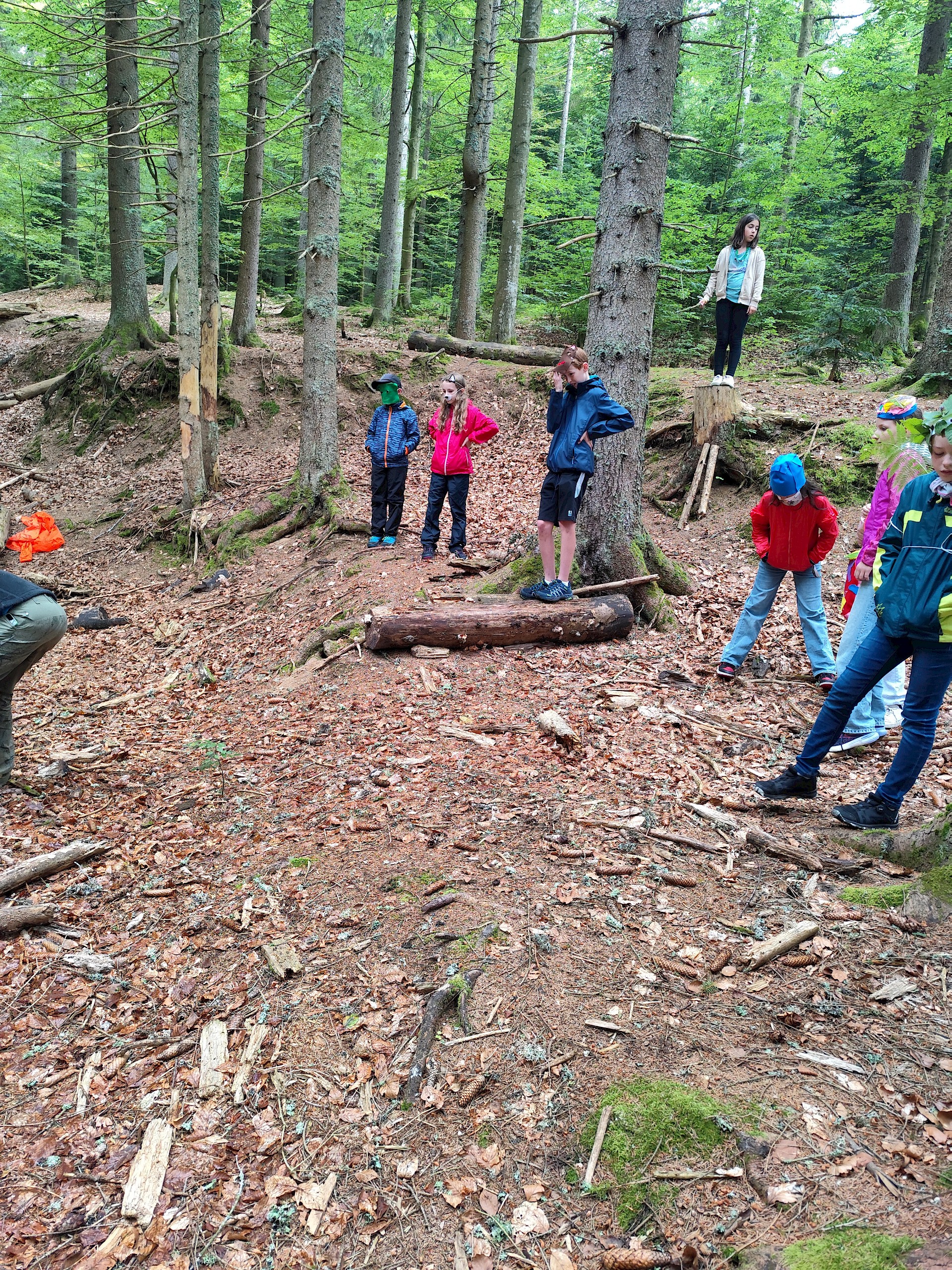 Am nächsten Tag verbrachten wir den ganzen Tag im Böhmerwald. Bei einer Blindenführung erkundeten die Schüler*innen den Böhmerwald, lernten verschiedene Baumarten kennen und überquerten sogar die tschechische Grenze. Es wurde eine Kugelbahn aus Baumstämmen, Moos, Rinde und anderen Naturmaterialien gebaut. Am Aussichtsturm Moldaublick konnte ein Teil des Böhmerwaldes bis hin zum Moldaustausee in Tschechien erkundet werden. Ein Highlight war der Besuch des schwarzenbergischen Schwemmkanals und die zerstörten Häuser die früher direkt am Eisernen Vorhang existiert haben. Zum Mittagessen wurde am Lagerfeuer Knacker und Stockbrot gegrillt.