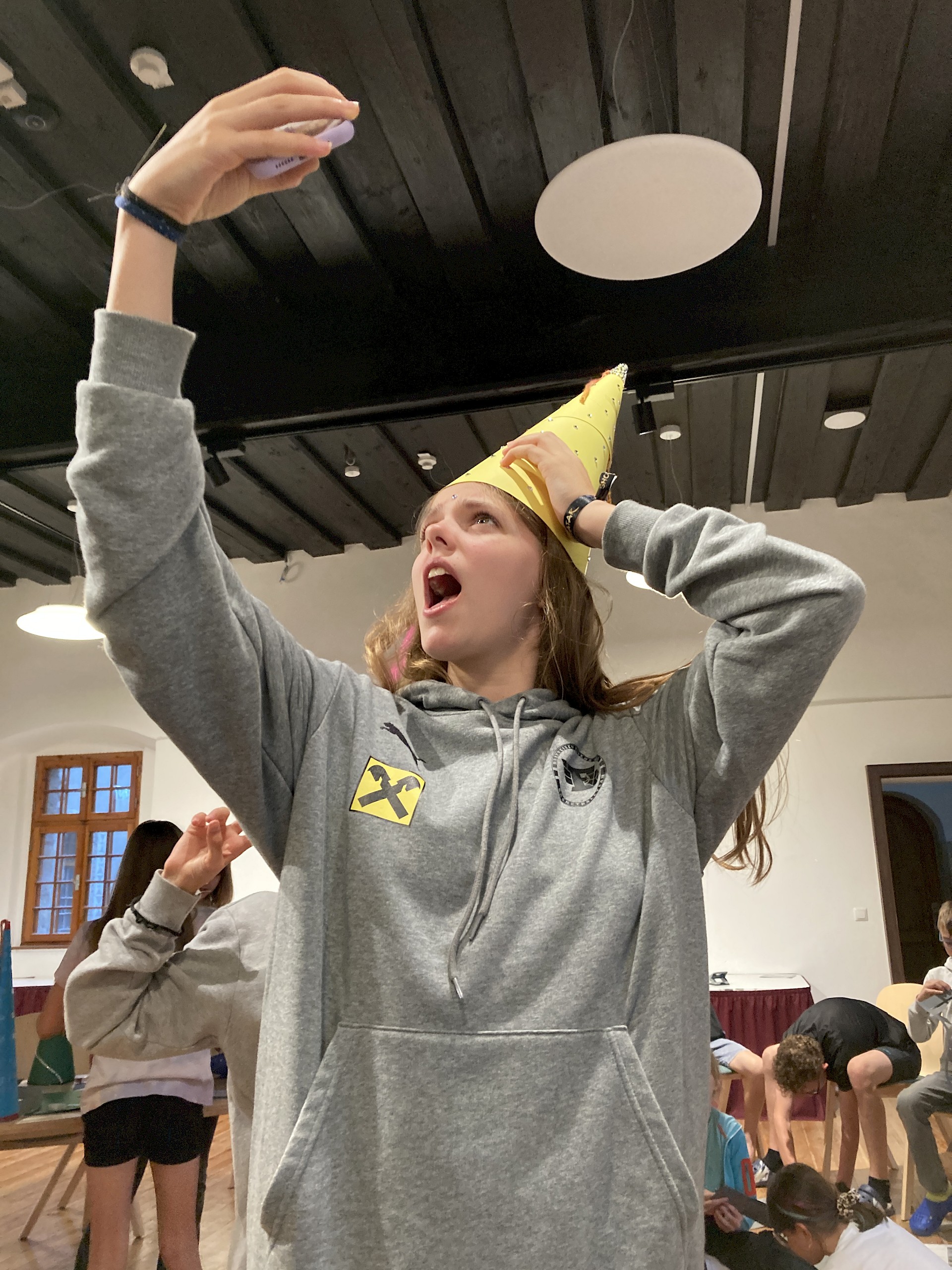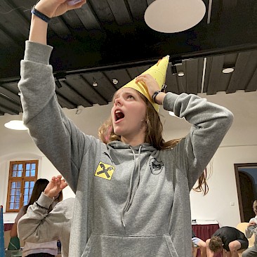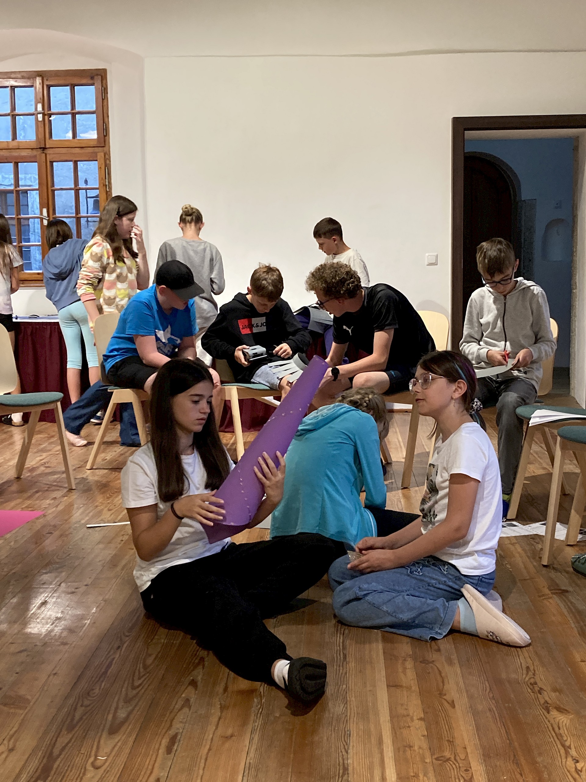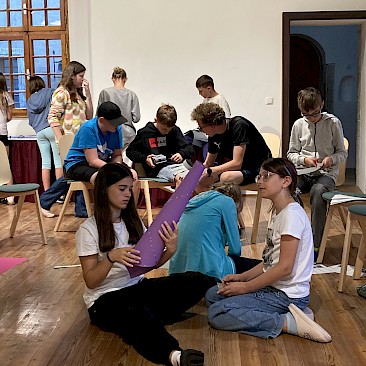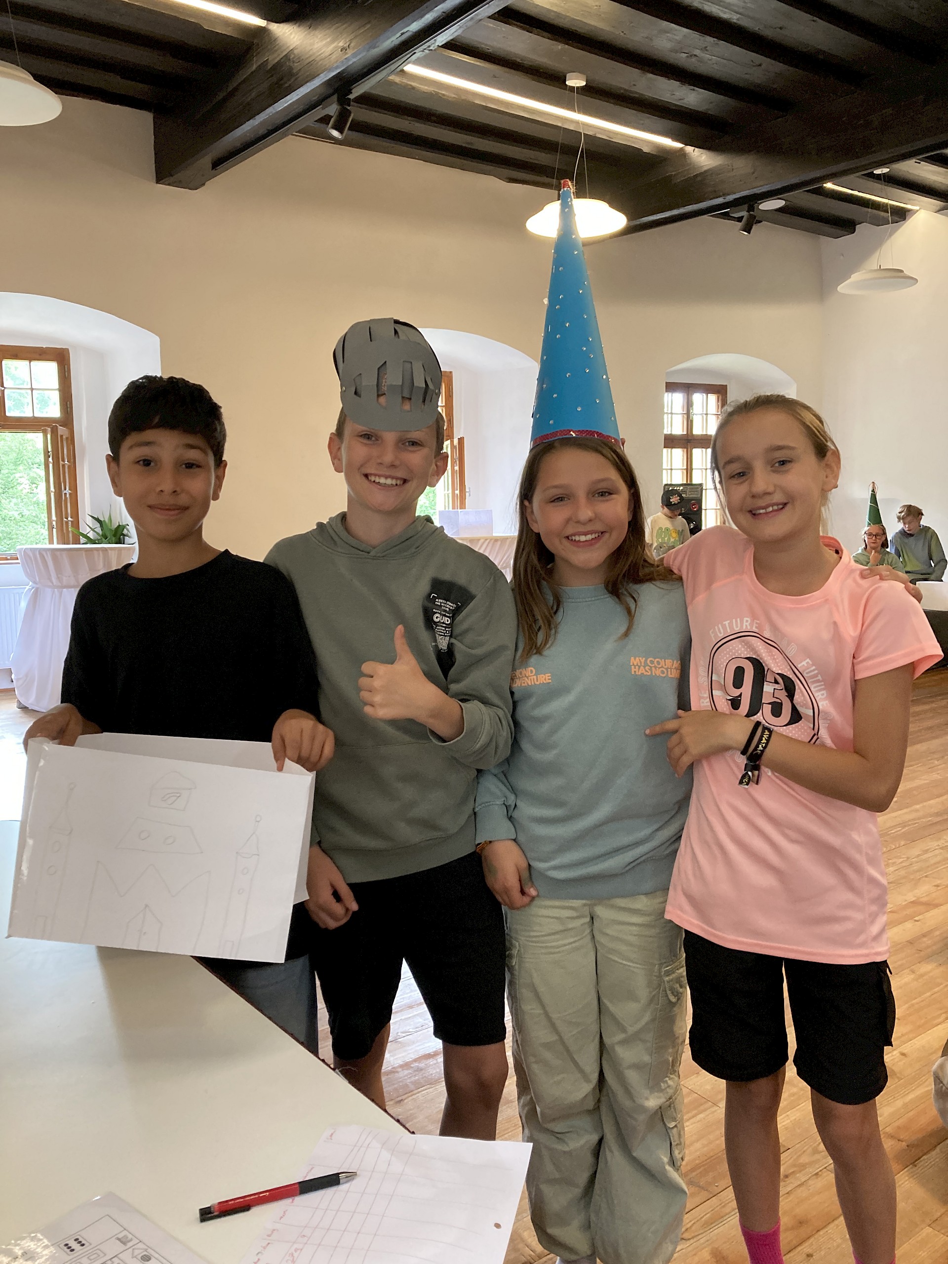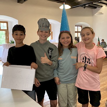 Am Abend tauchten wir im Rittersaal der Burg dann völlig in das Zeitalter des Mittelalters ein. Die Schüler*innen wurden per Online-Zufallsgenerator in sieben 4erGruppen eingeteilt. Jede Gruppe bestand aus einem Herold, einem Burgfräulein, einem Ritter und einem Hofnarren. Die Schüler*innen hatten 2 Stunden Zeit, um sich bei einem Würfelspiel den eigenen Herrschaftssitz zu erwürfeln und diesen möglichst detailgetreu und aus dem Gedächtnis aufzuzeichnen. Weiters musste ein Burgfräuleinhut und ein Ritterhelm gefertigt werden. Waren alle Utensilien fertiggestellt, machten sich die Schüler*innen daran, das Pub-Quiz zum Mittelalter zu lösen. Am Vormittag des 2. Tages wurde das Ritterturnier beendet und die 3 Siegergruppen prämiert.